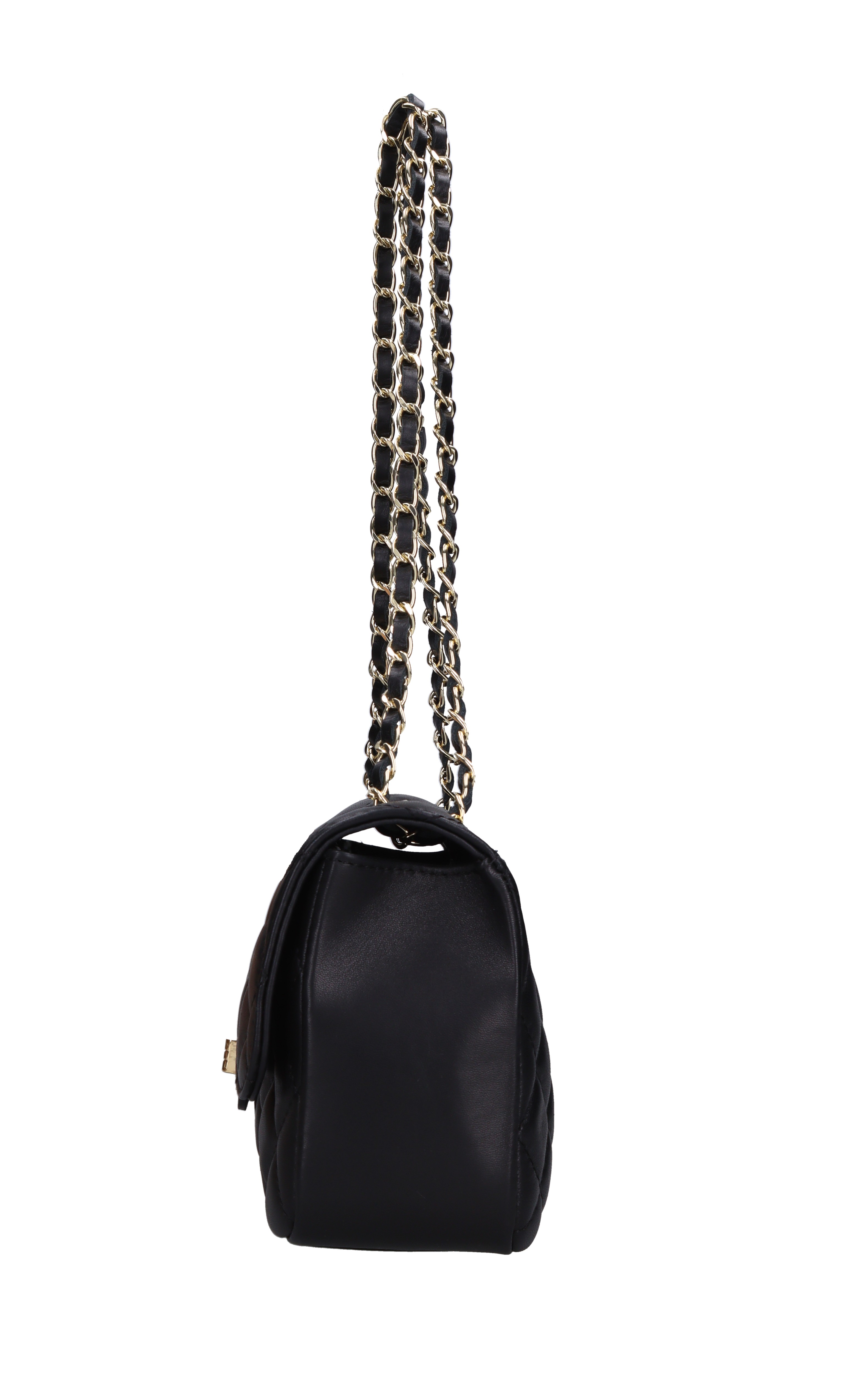 Leather bag. 1 compartment. Closure: flap with twist lock. Leather shoulder strap and golden chain. Small imperfections on the leather. Shipped in a transparent bag.