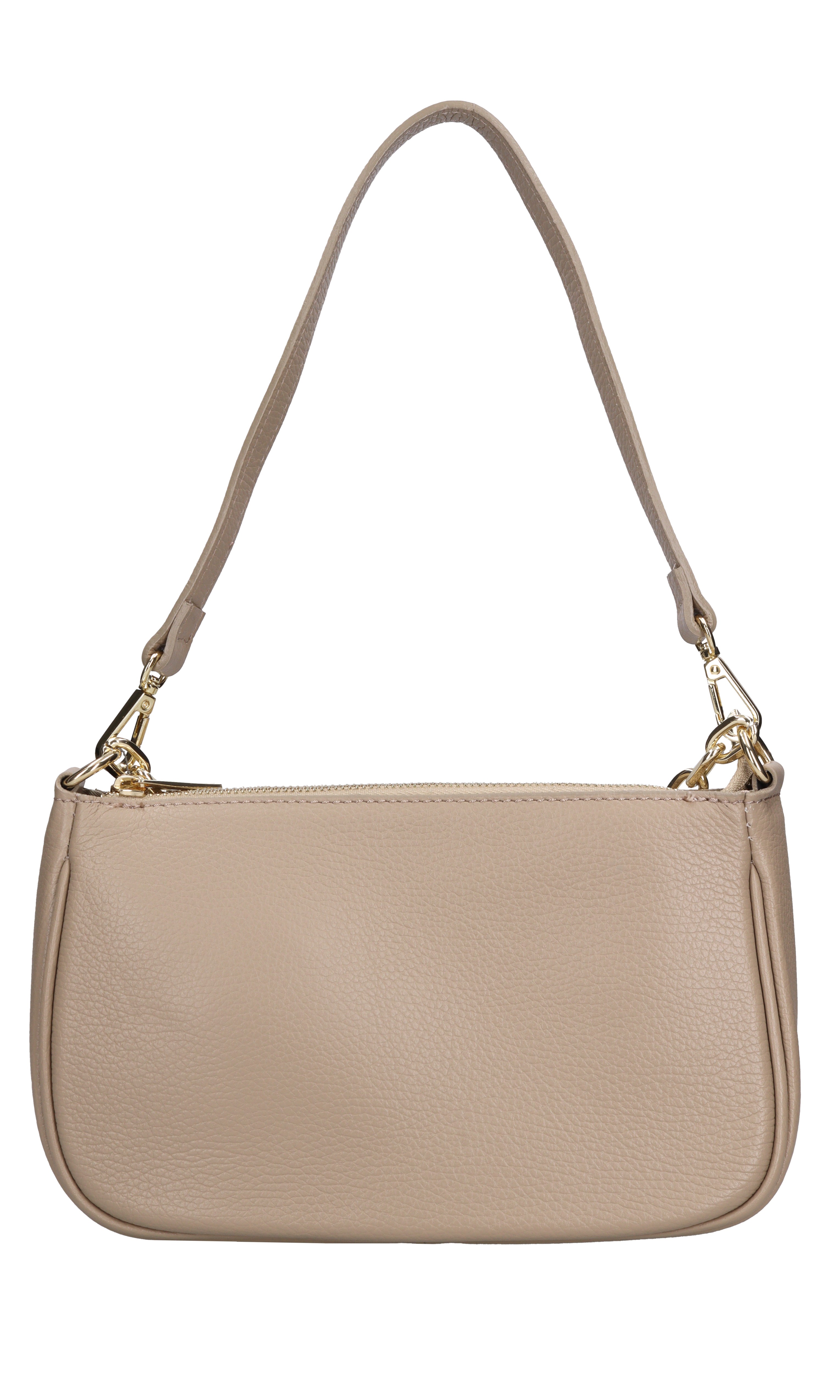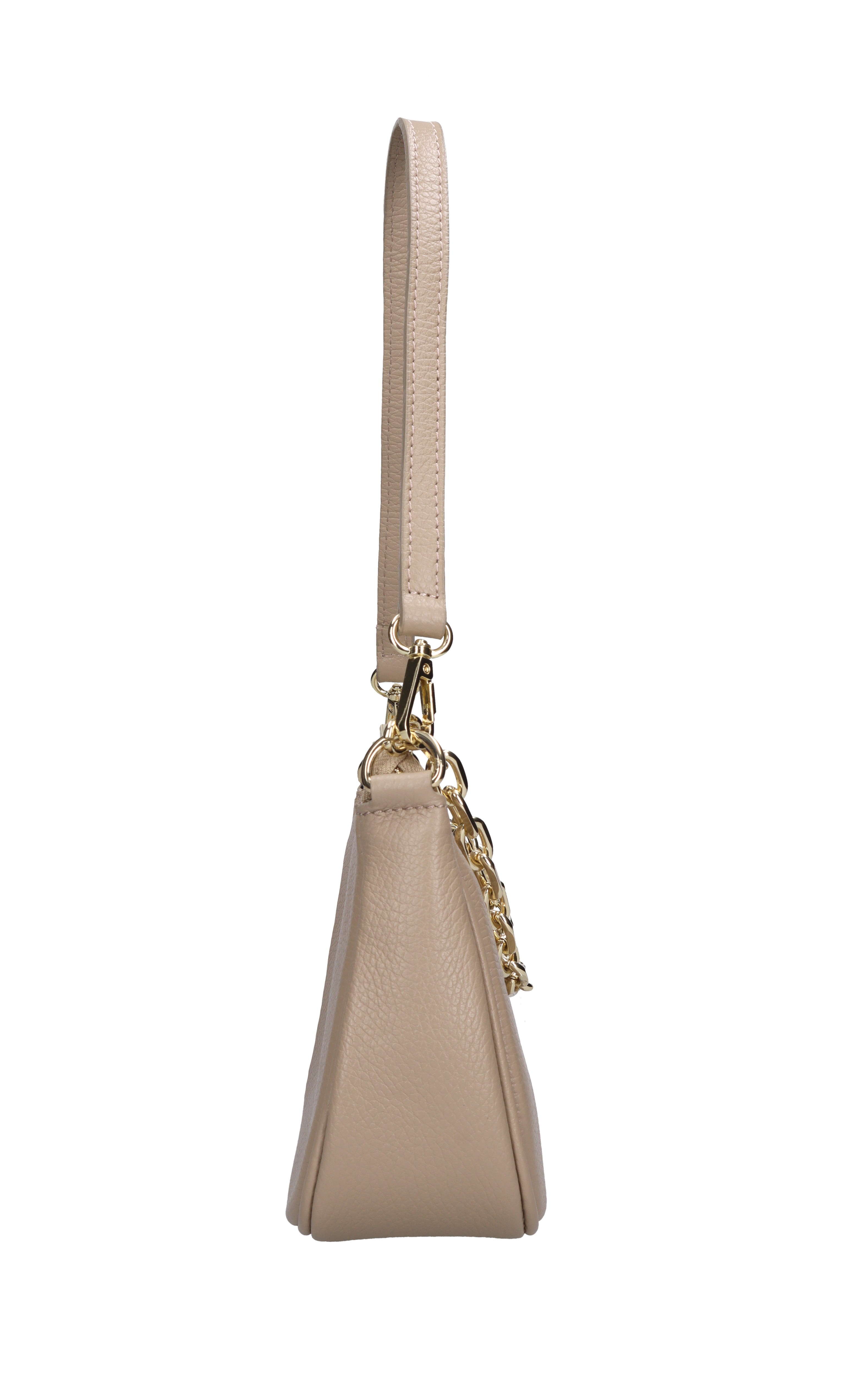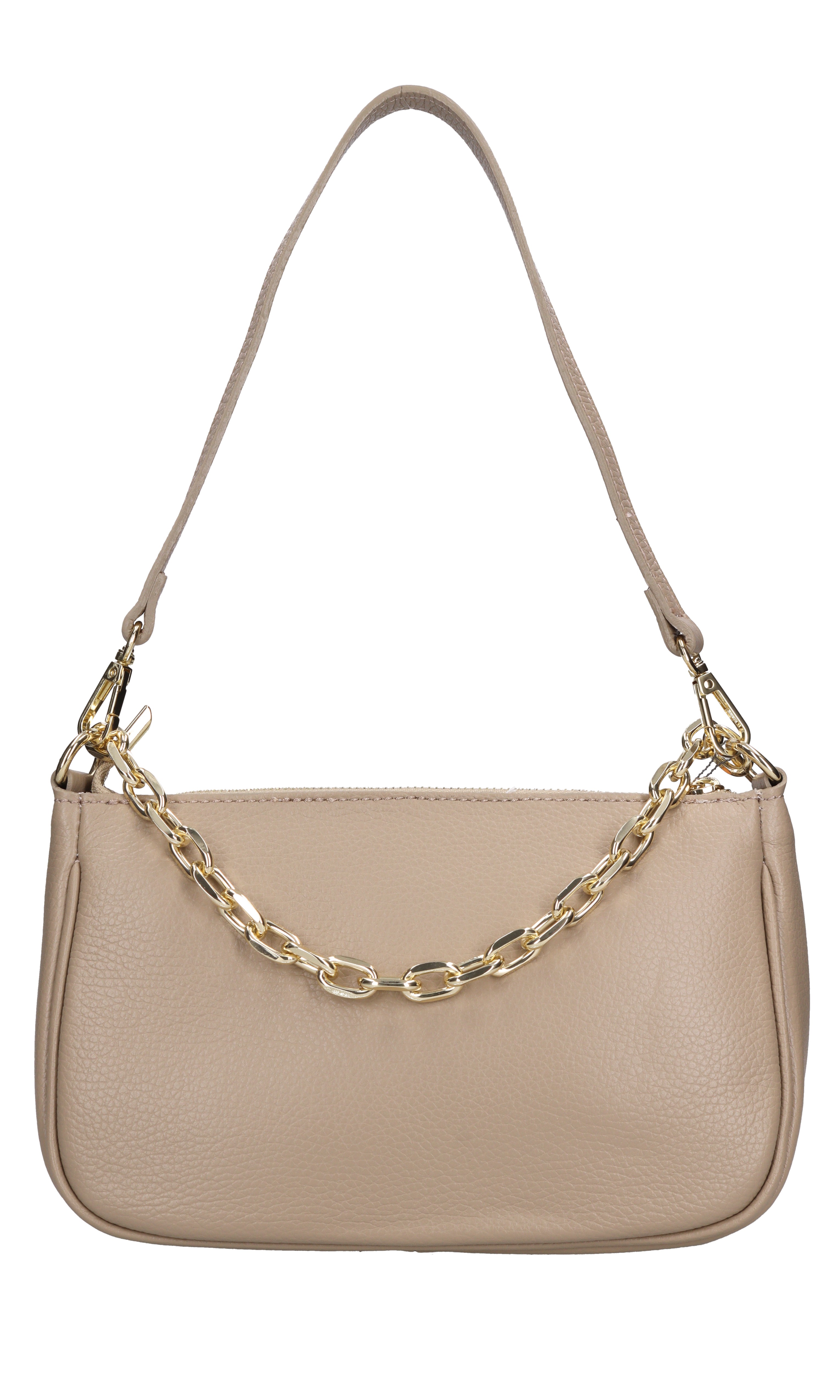 Leather bag. Hammered finish. 1 compartment. Zip closure. Golden chain handle. Removable leather handle. Adjustable and removable leather shoulder strap. Shipped in a transparent bag.