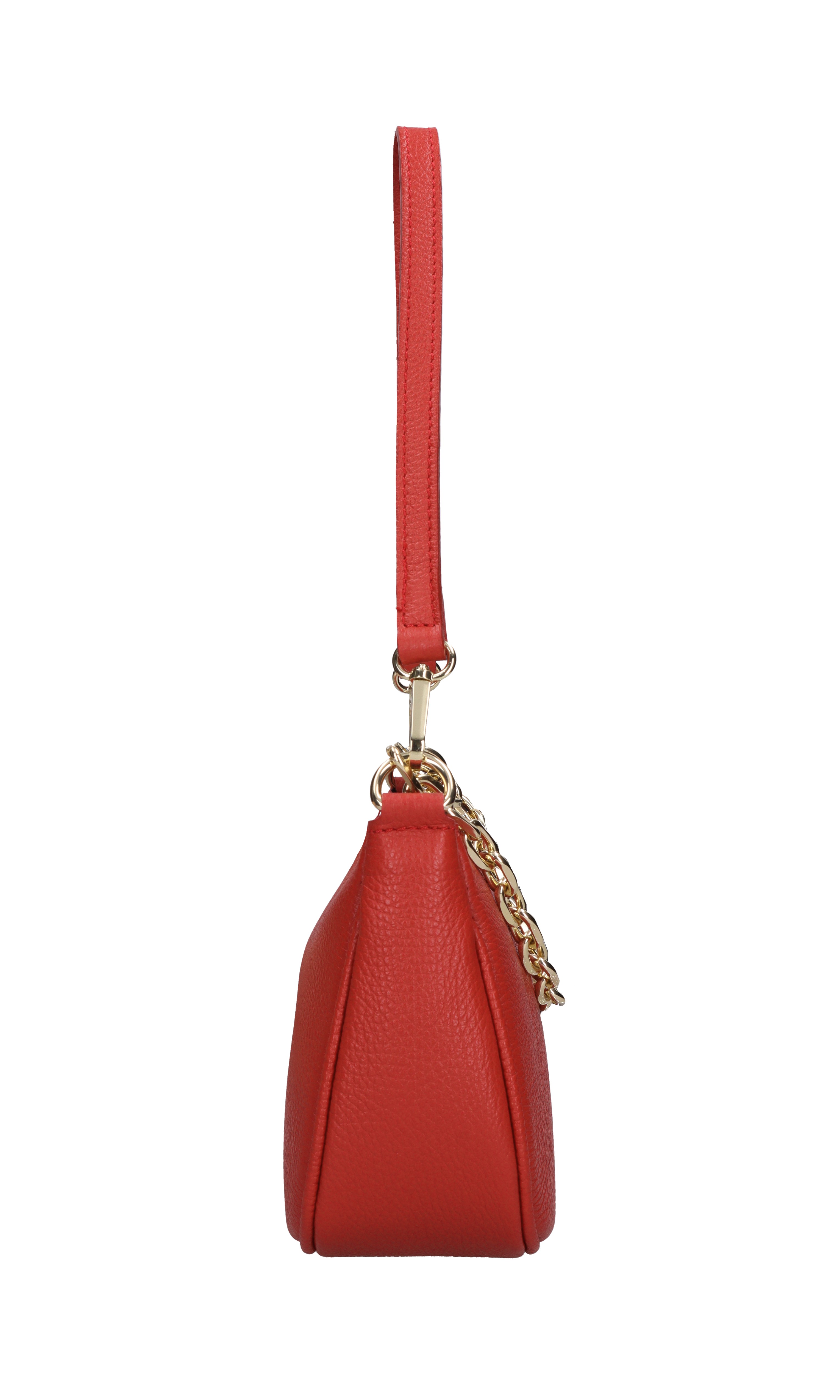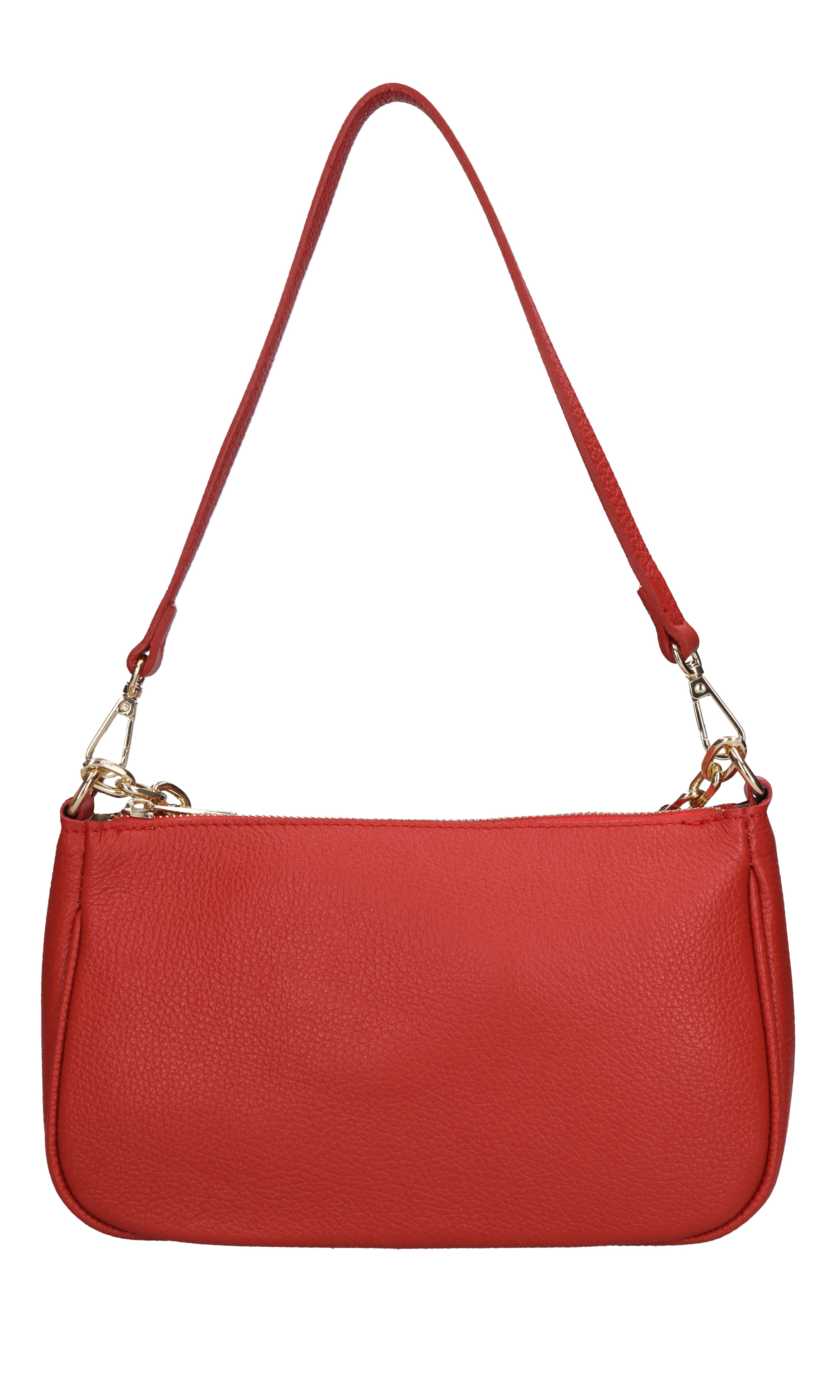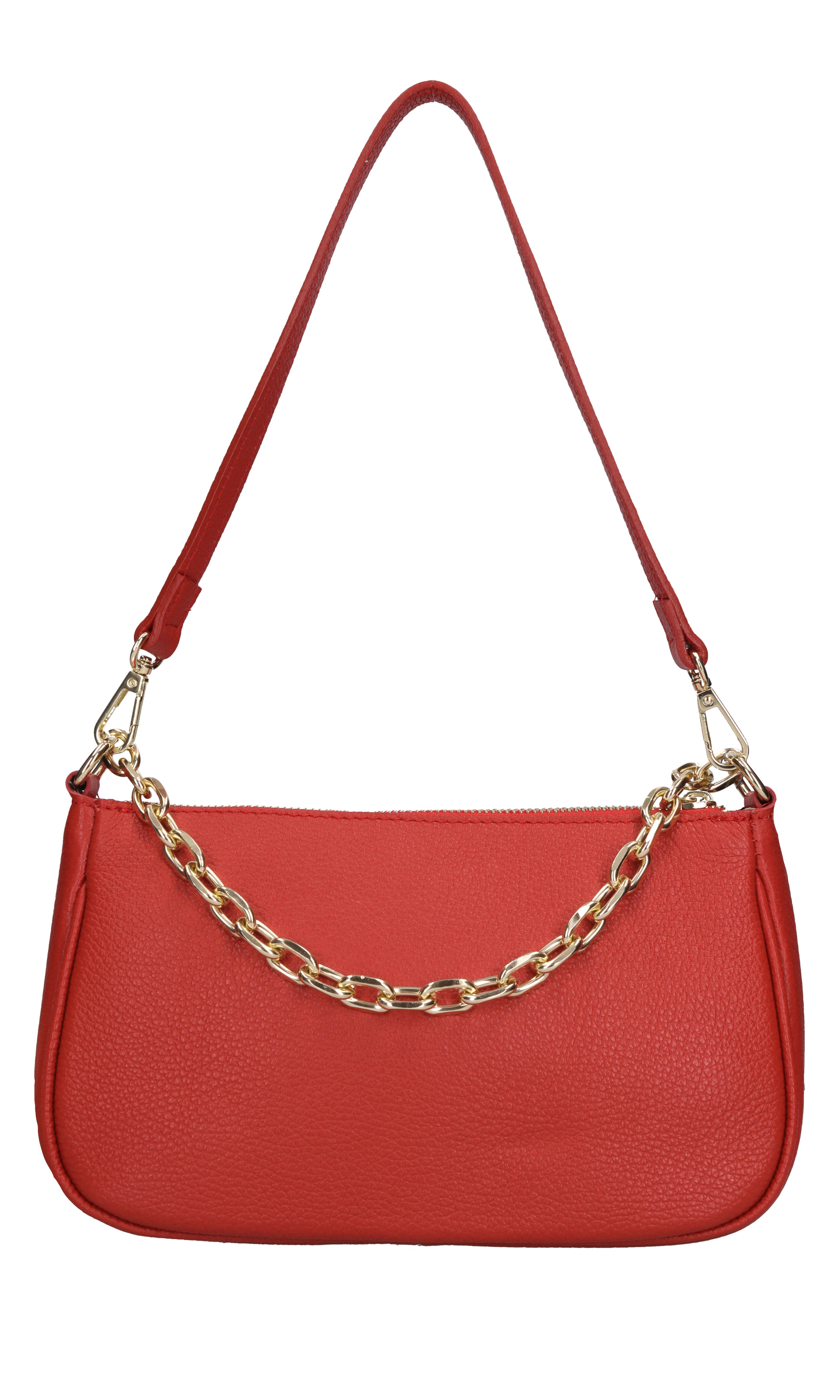 Leather bag. Hammered finish. 1 compartment. Zip closure. Golden chain handle. Removable leather handle. Adjustable and removable leather shoulder strap. Shipped in a transparent bag.