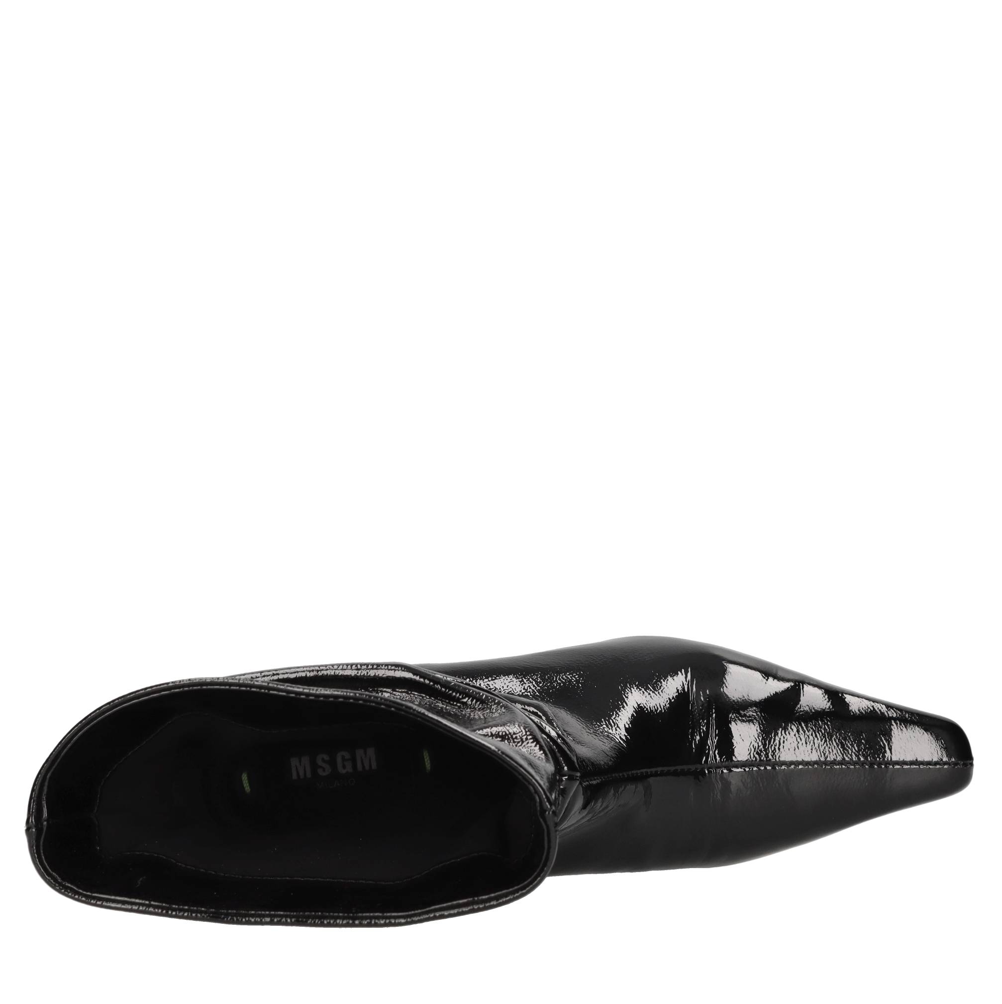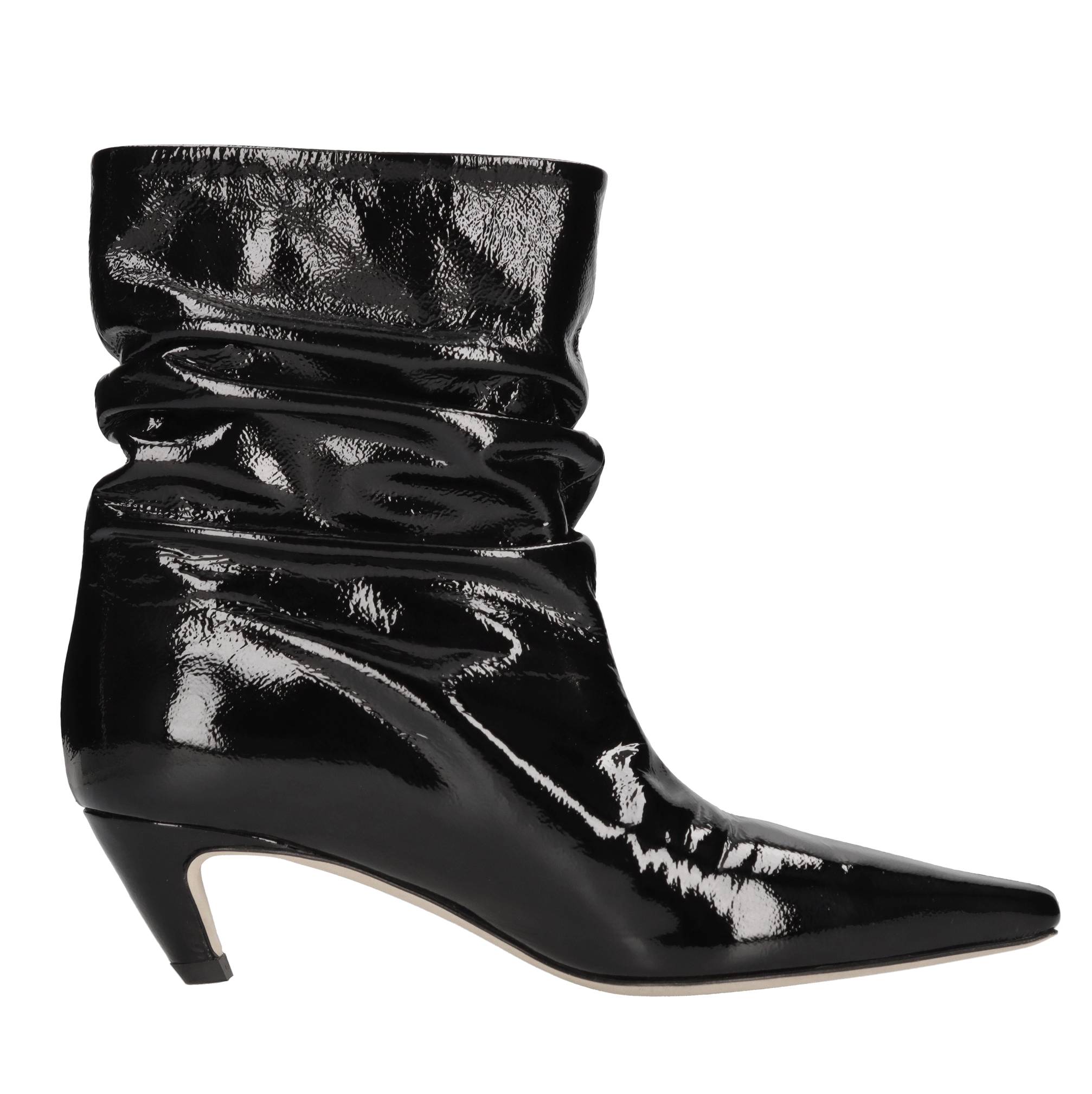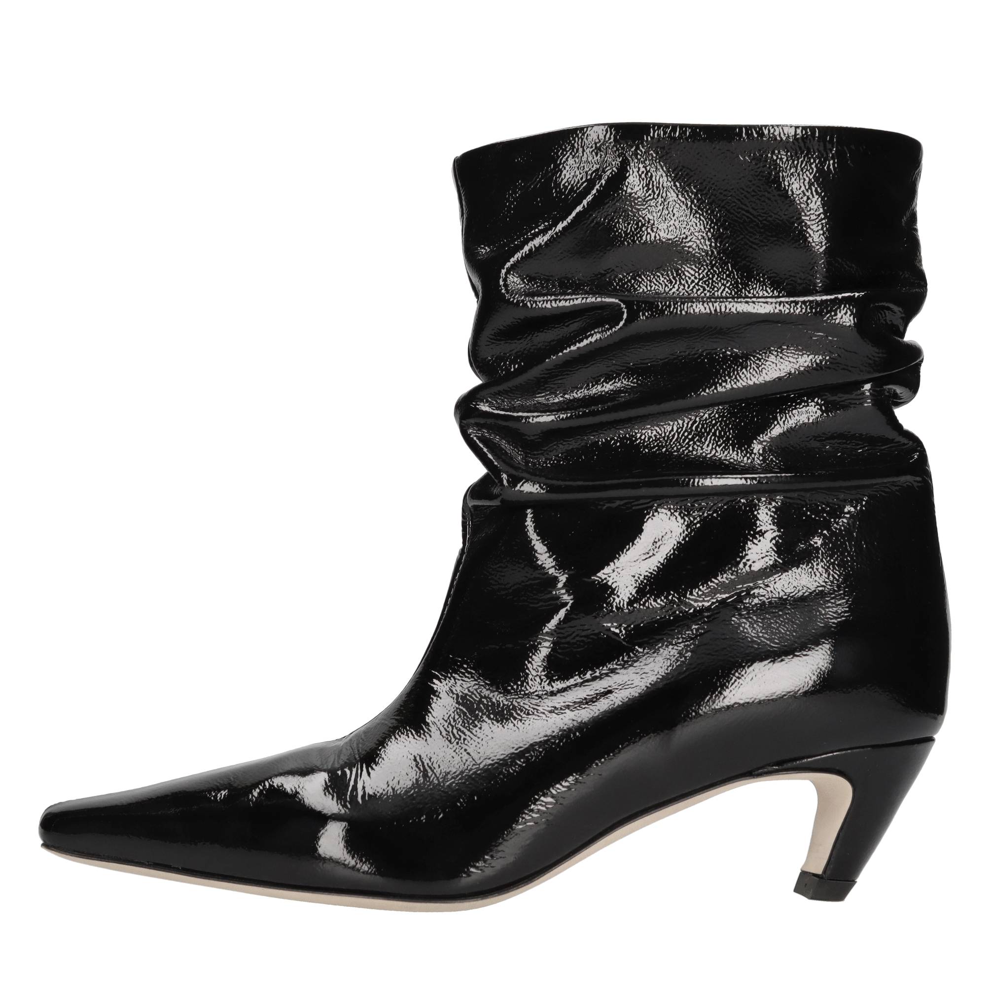 Patent leather ankle boots. Leather inner upper. Leather outer sole.
