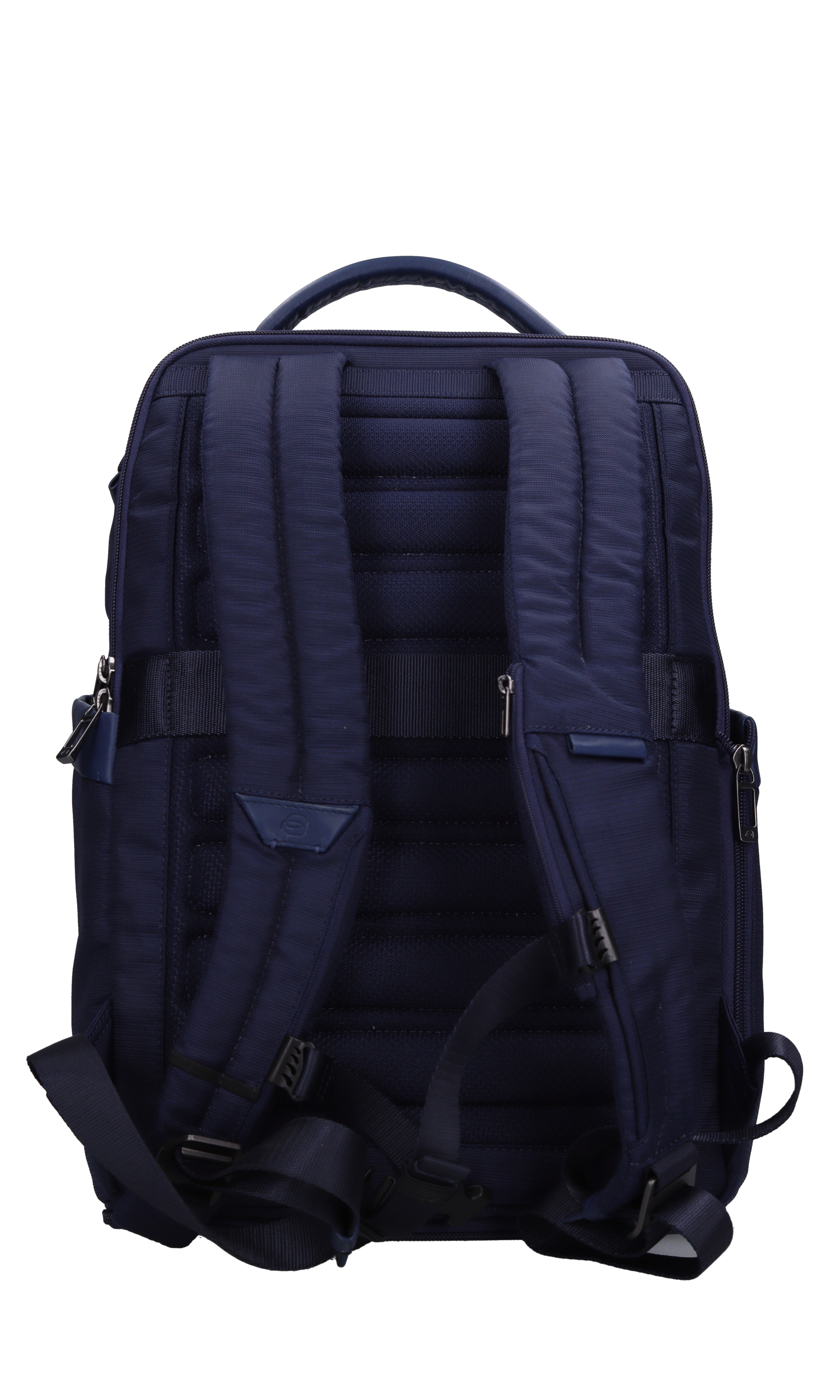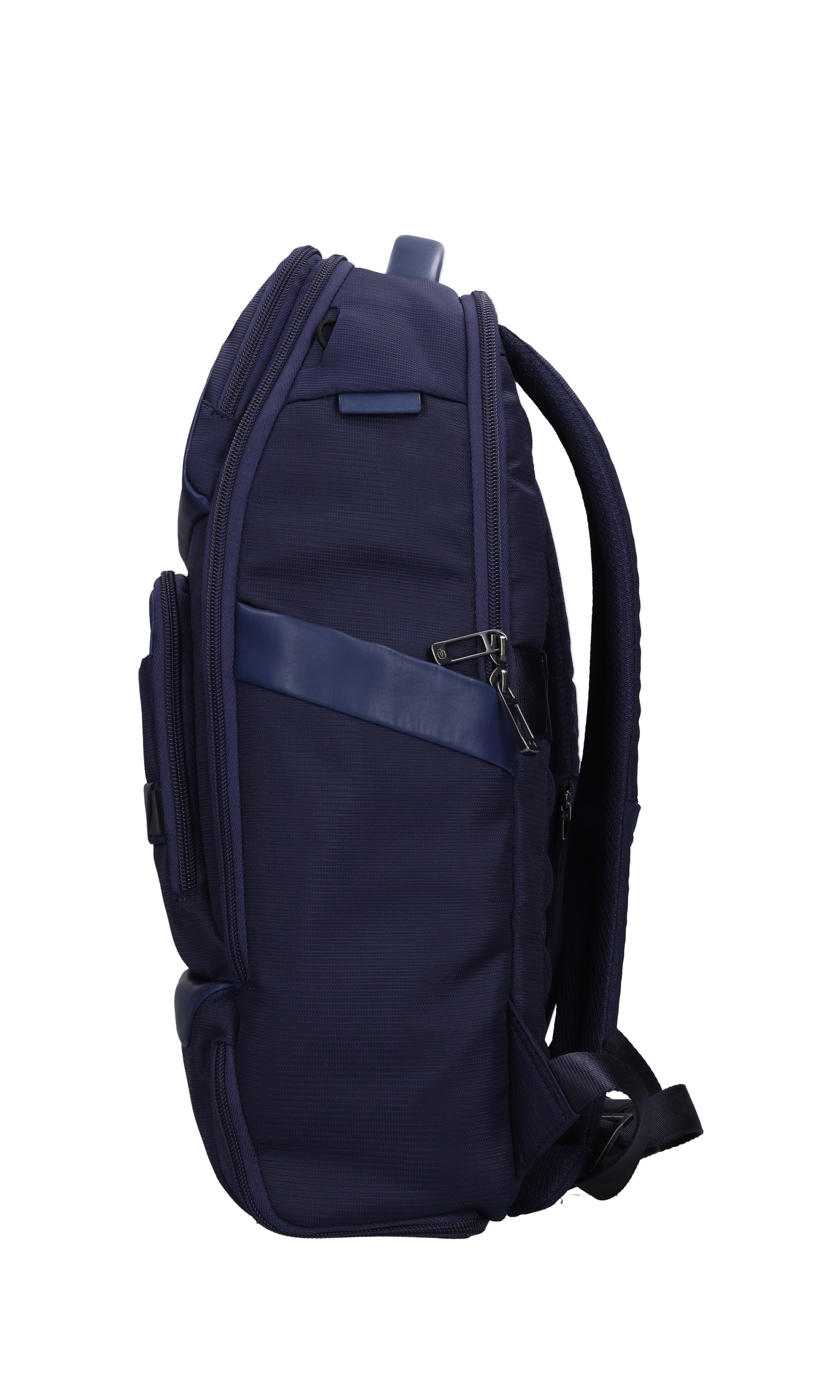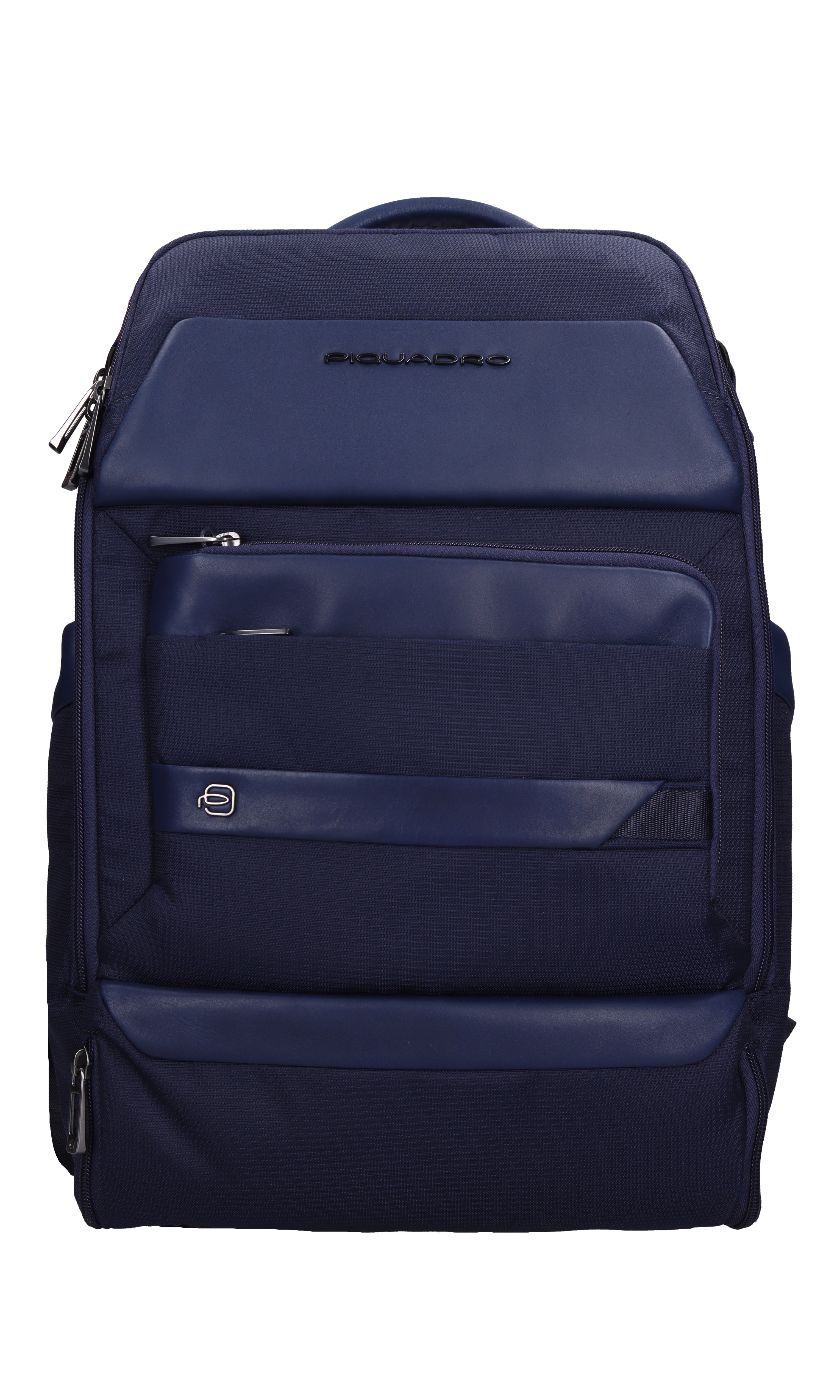 Leather and fabric backpack. Laptop compartment. 2 compartments. Zip closure. 6 zip pockets. 2 side pockets. Trolley attachment system strap. Adjustable.