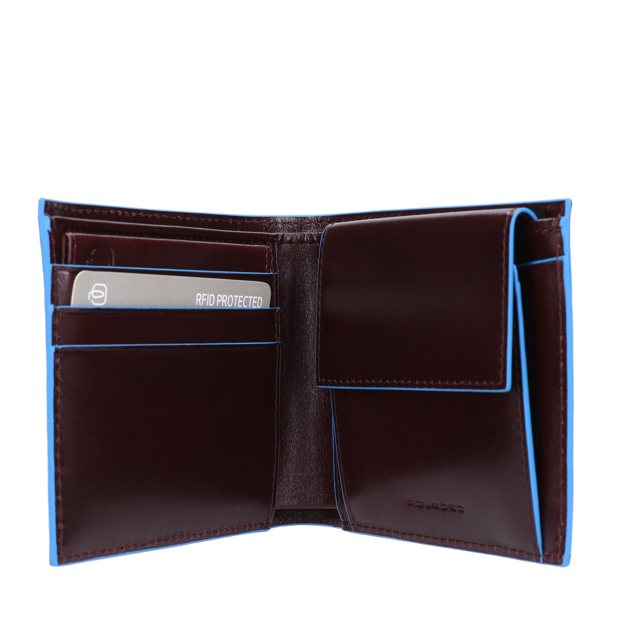 Leather wallet. Polyester lining. 2 compartments. Card slots. RFID protection. Coin pocket.