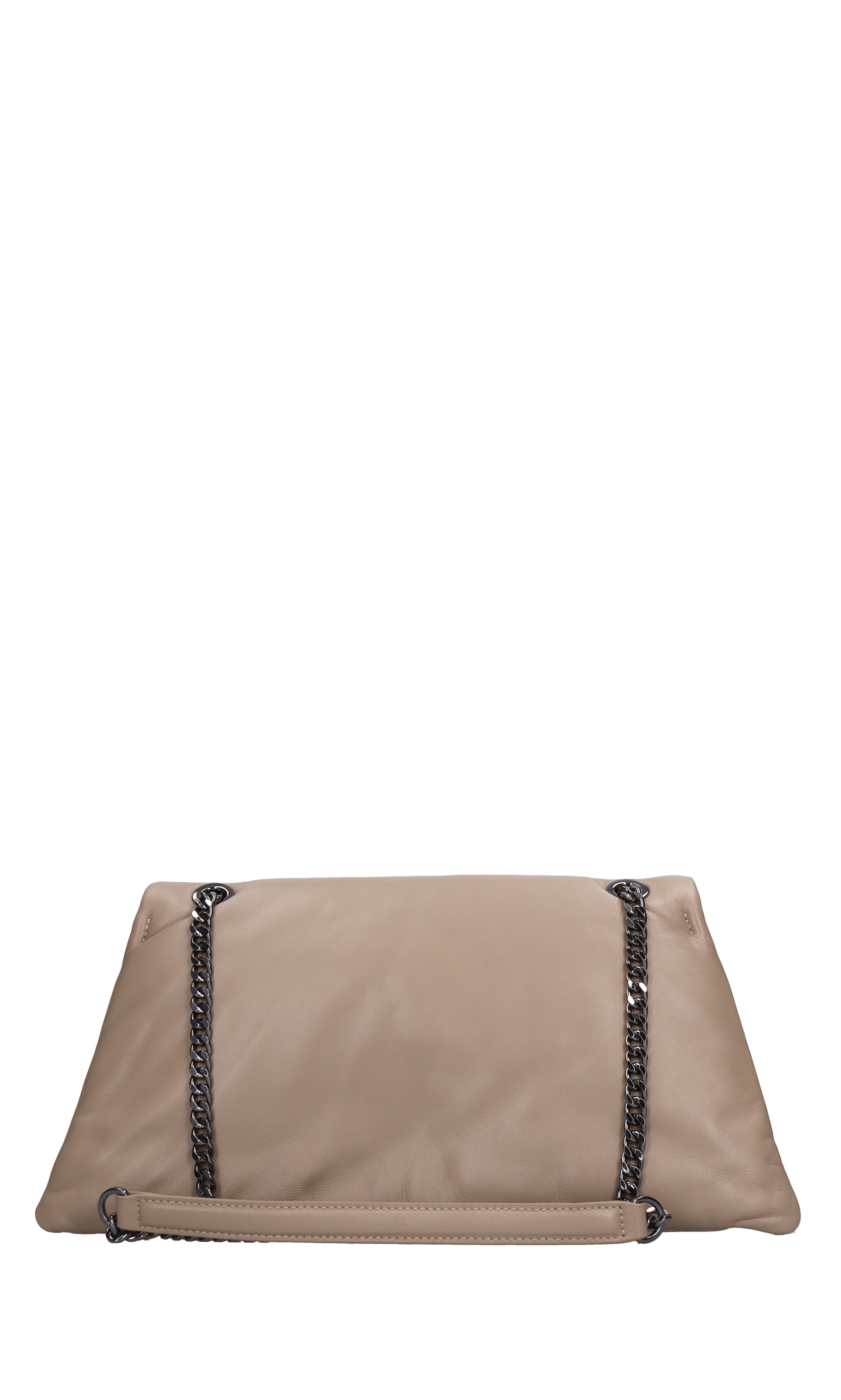 Leather bag. 2 compartments. Flap closure with snap button. Lead chain and leather shoulder strap. Shipped in a transparent bag.