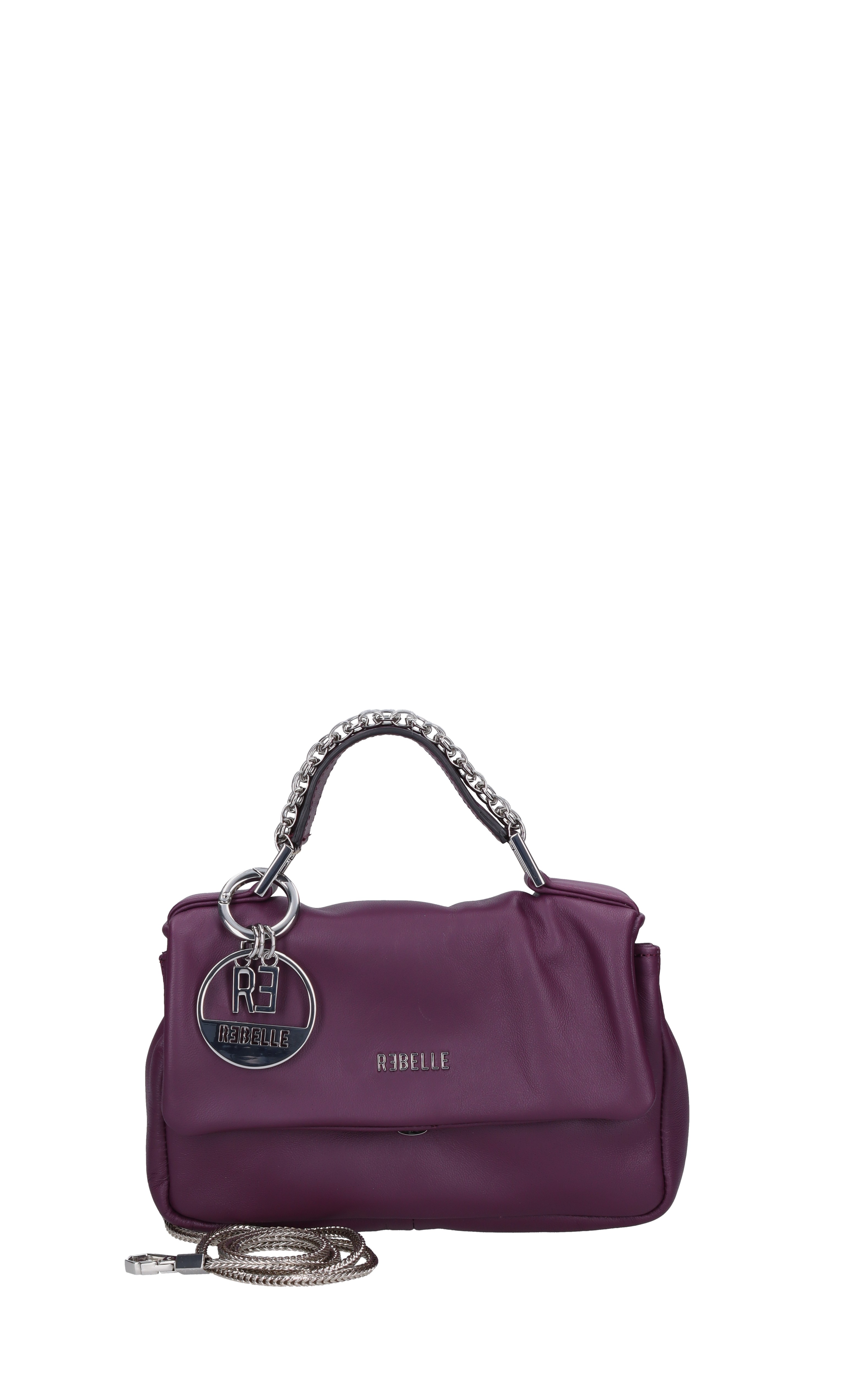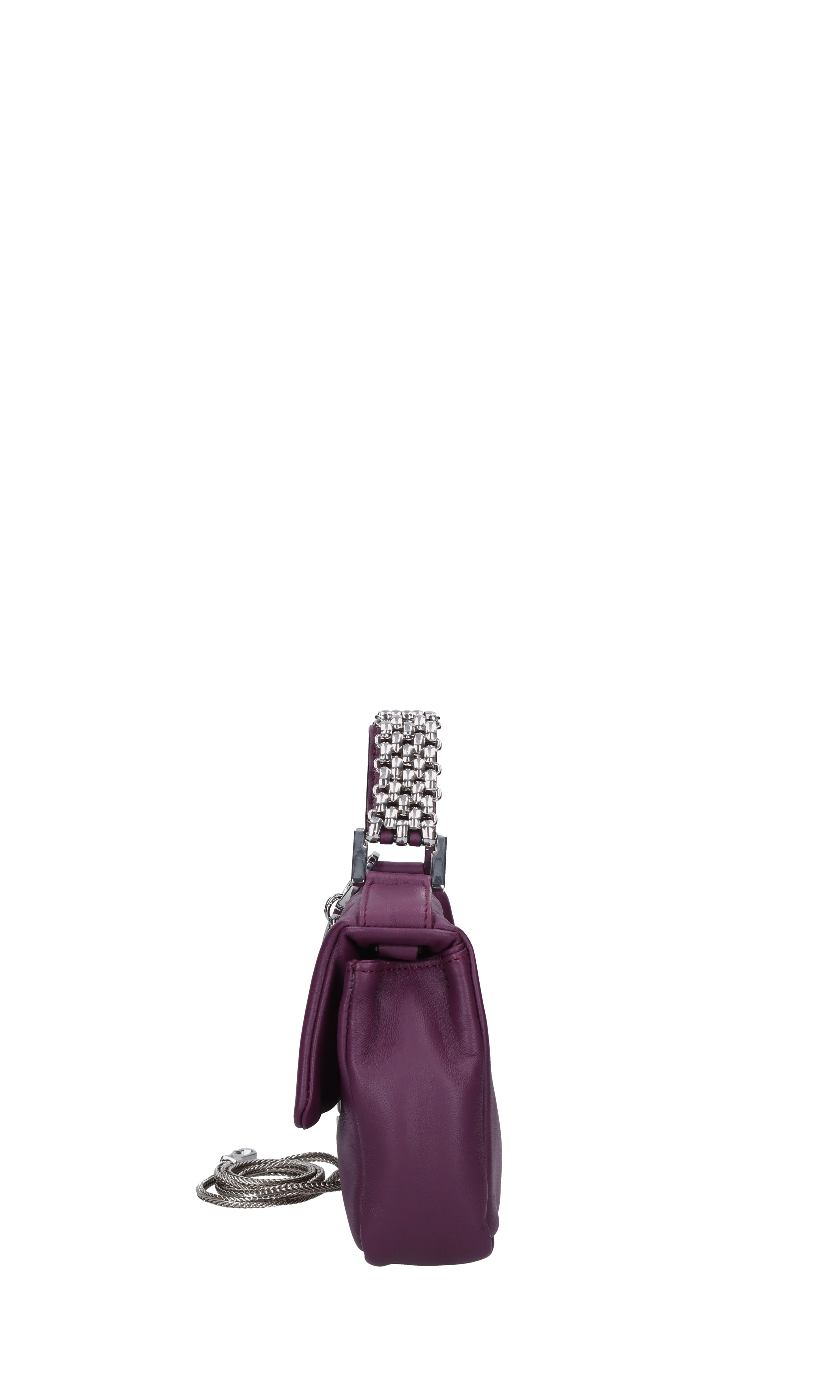 Leather bag. 1 compartment. Snap closure. 1 removable charm. Non-adjustable chain shoulder strap.