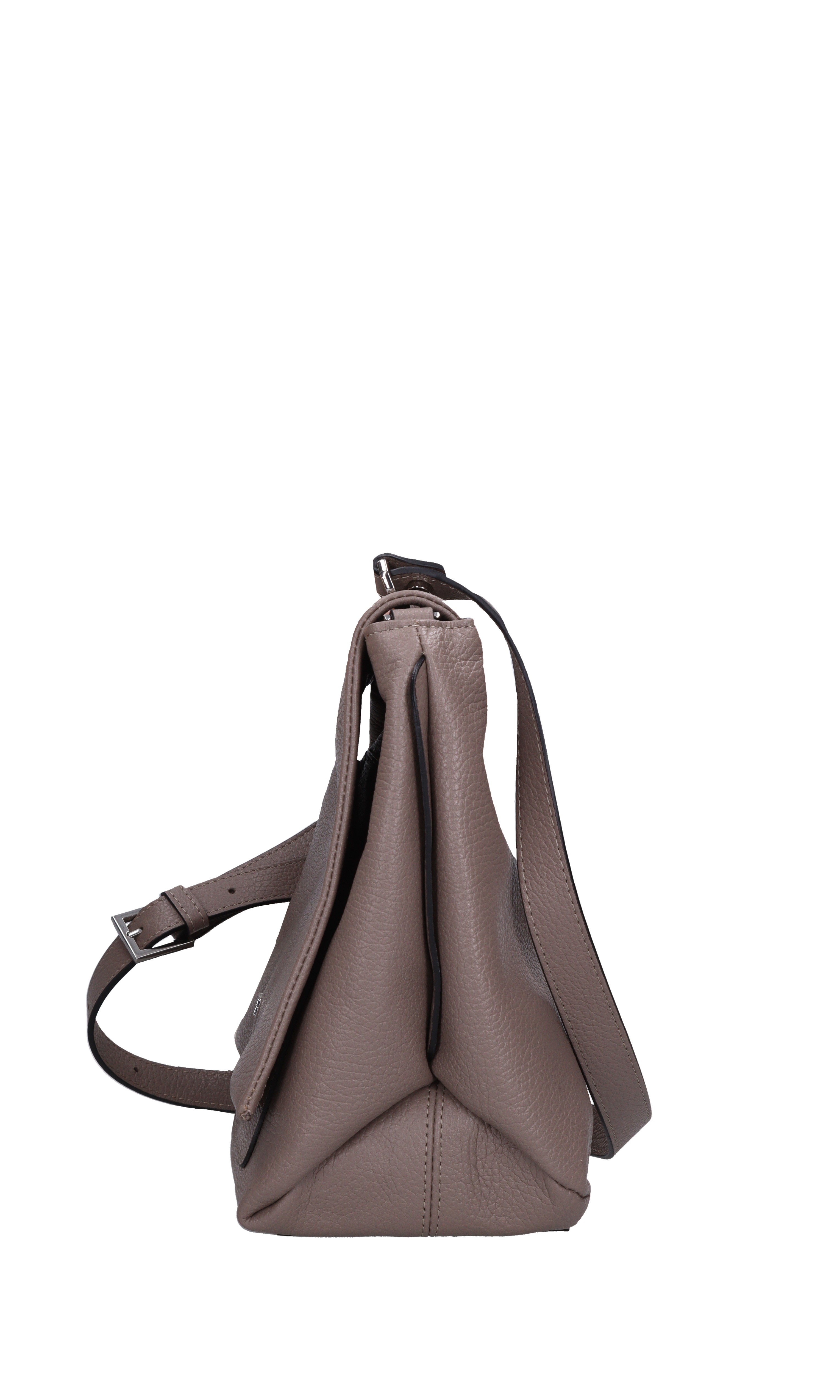 Leather bag. Hammered finish. 1 compartment. Flap closure with snap button. Adjustable and removable leather shoulder strap. Shipped in a transparent bag.
