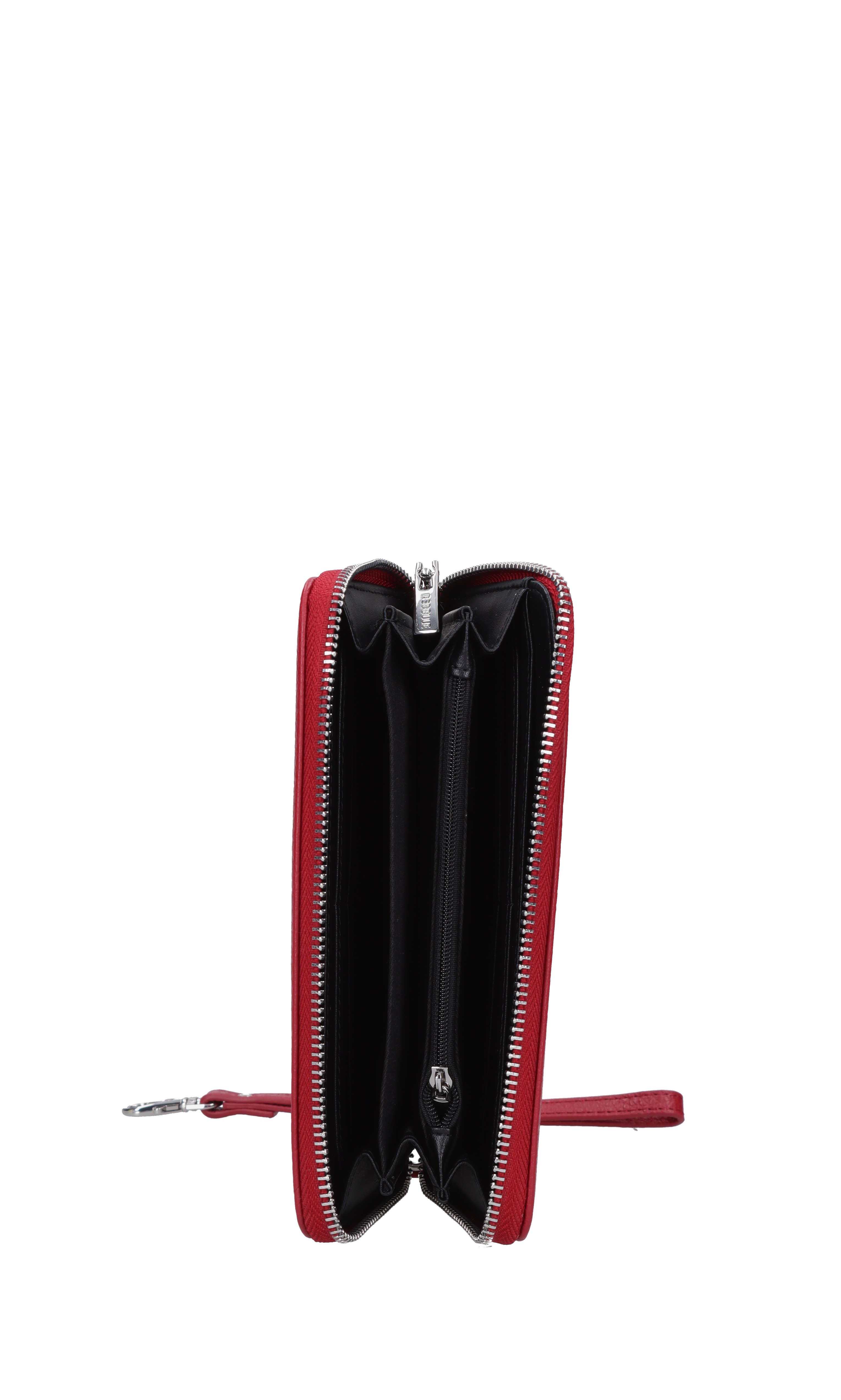 Leather wallet. Zip closure. 3 compartments. 1 coin pocket. Removable wrist strap.