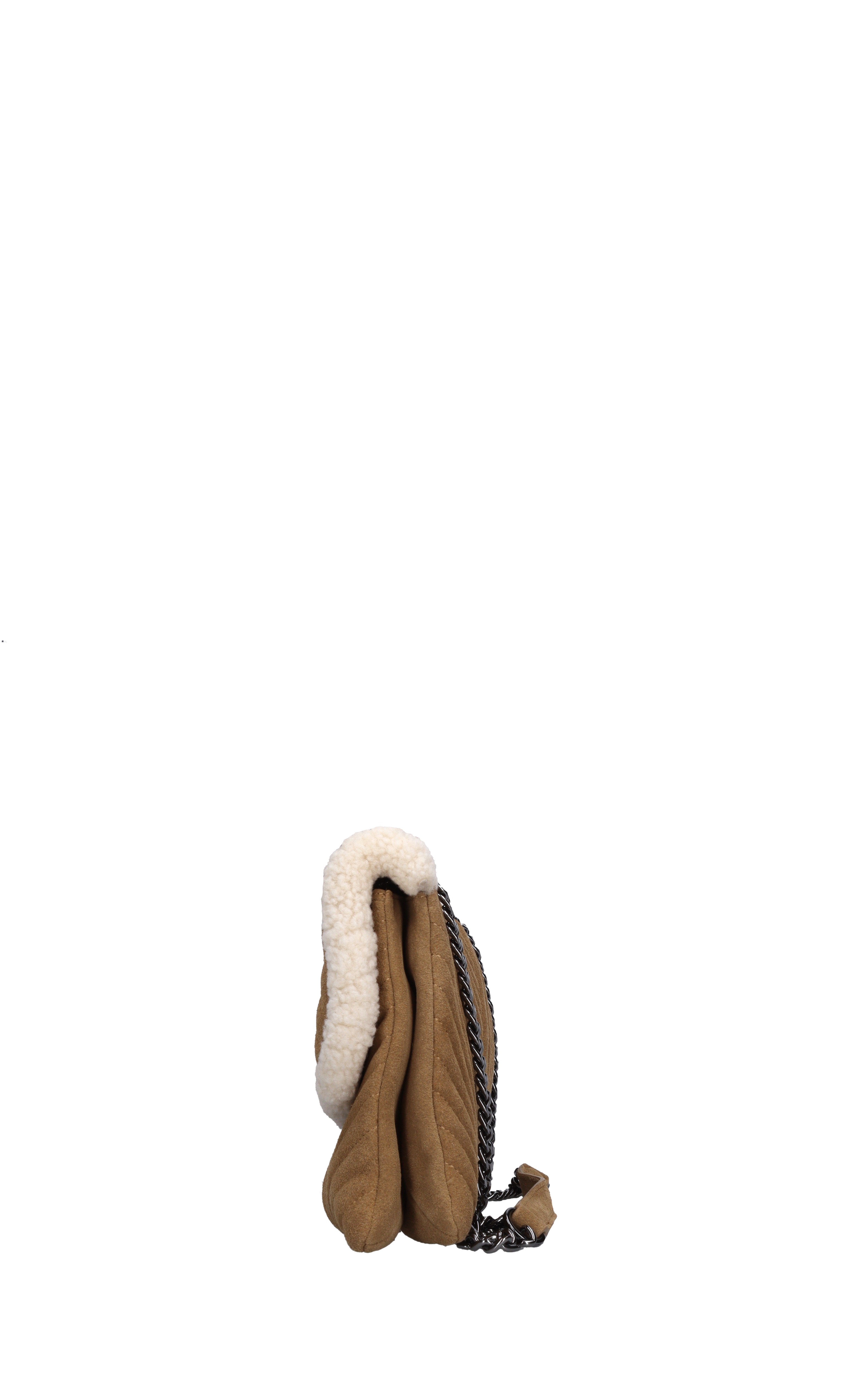 Suede and fabric bag. 2 compartments. Flap closure with snap button. Lead chain shoulder strap. Shipped in a transparent bag.