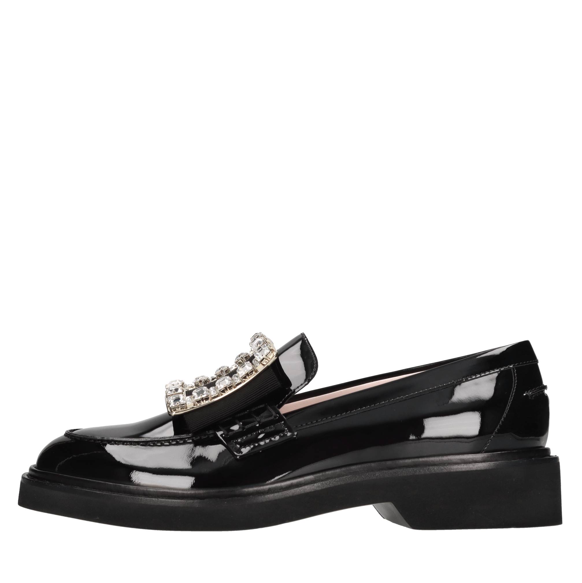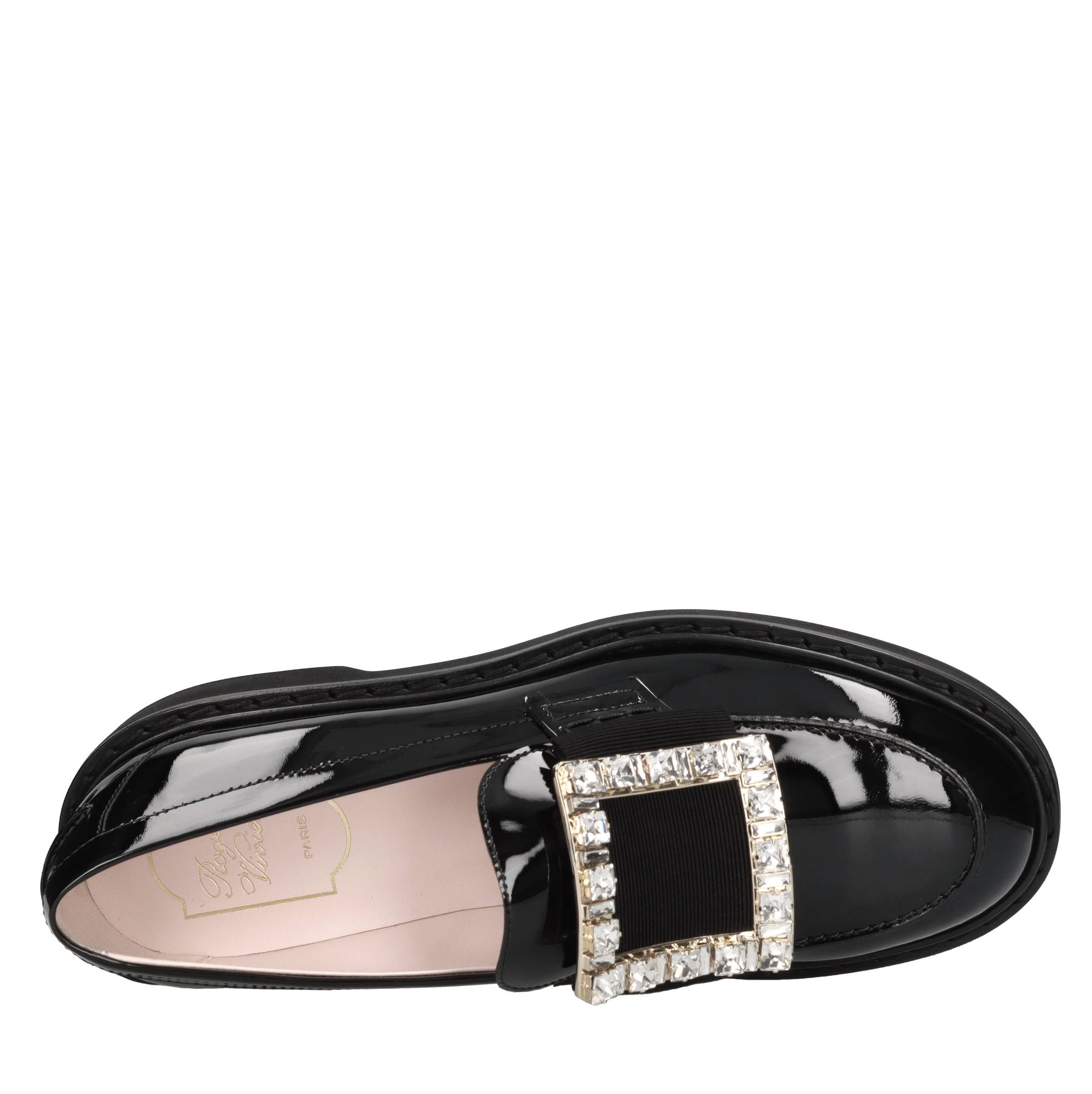 Patent leather loafers. Jeweled buckle. Leather upper. Rubber outsole.