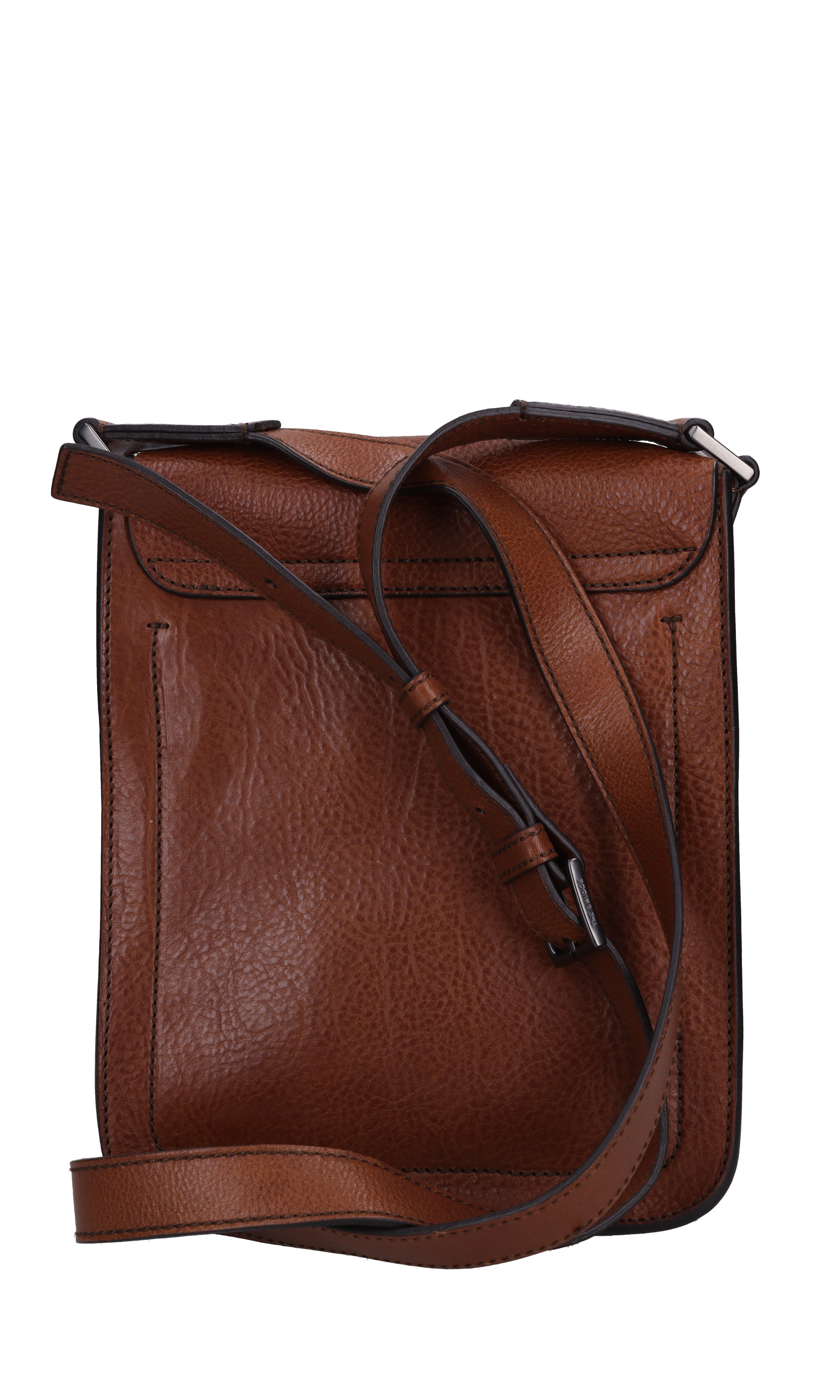 Leather bag. 1 compartment. Snap closure. Adjustable leather shoulder strap.
