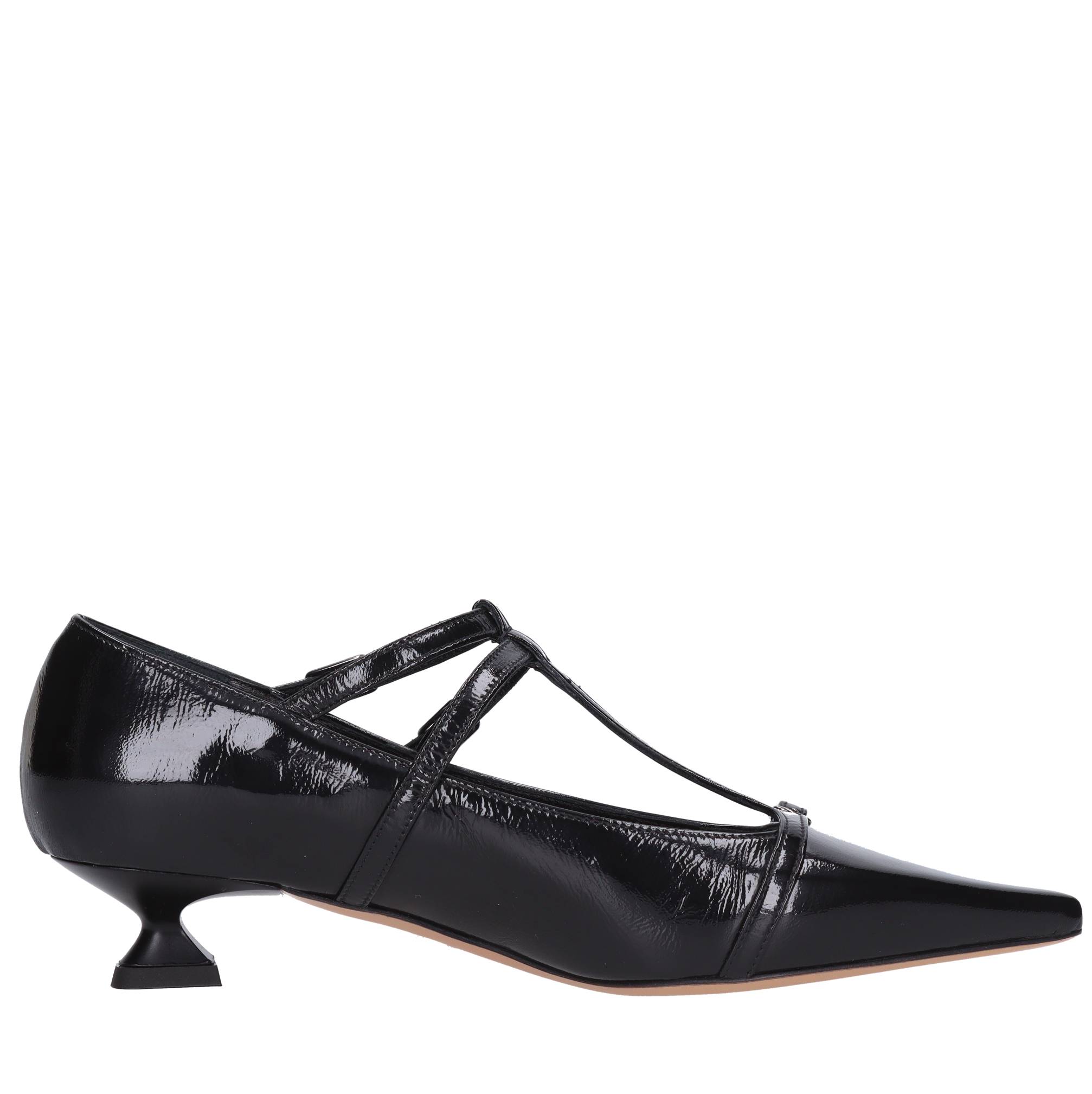 Leather pumps. Leather inner upper. Leather outer sole with central rubber insert. Straps with buckle.