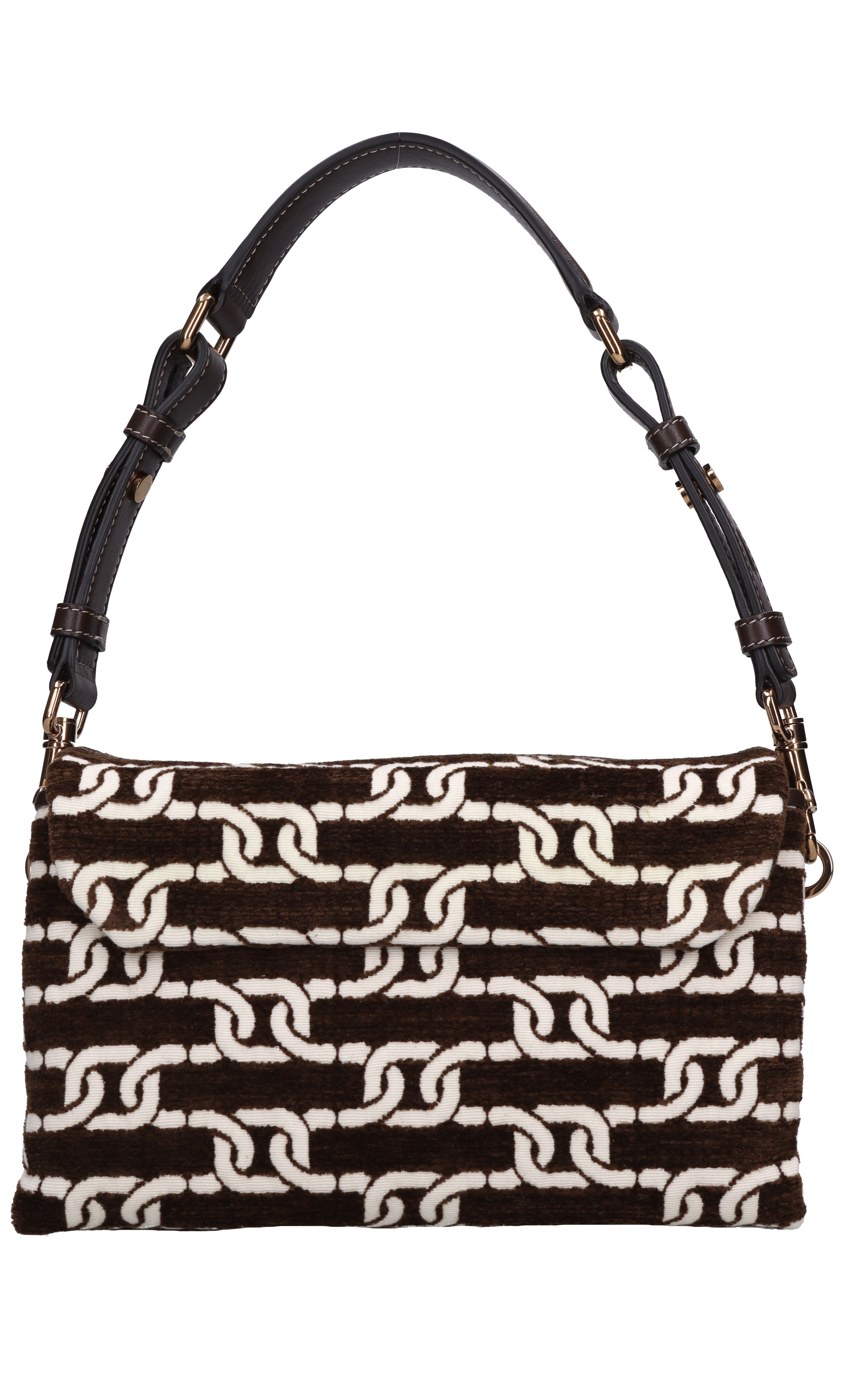 Leather and fabric bag. 3 compartments. Flap closure with metal rotating buckle. Timeless T logo. Removable leather shoulder strap and handle.