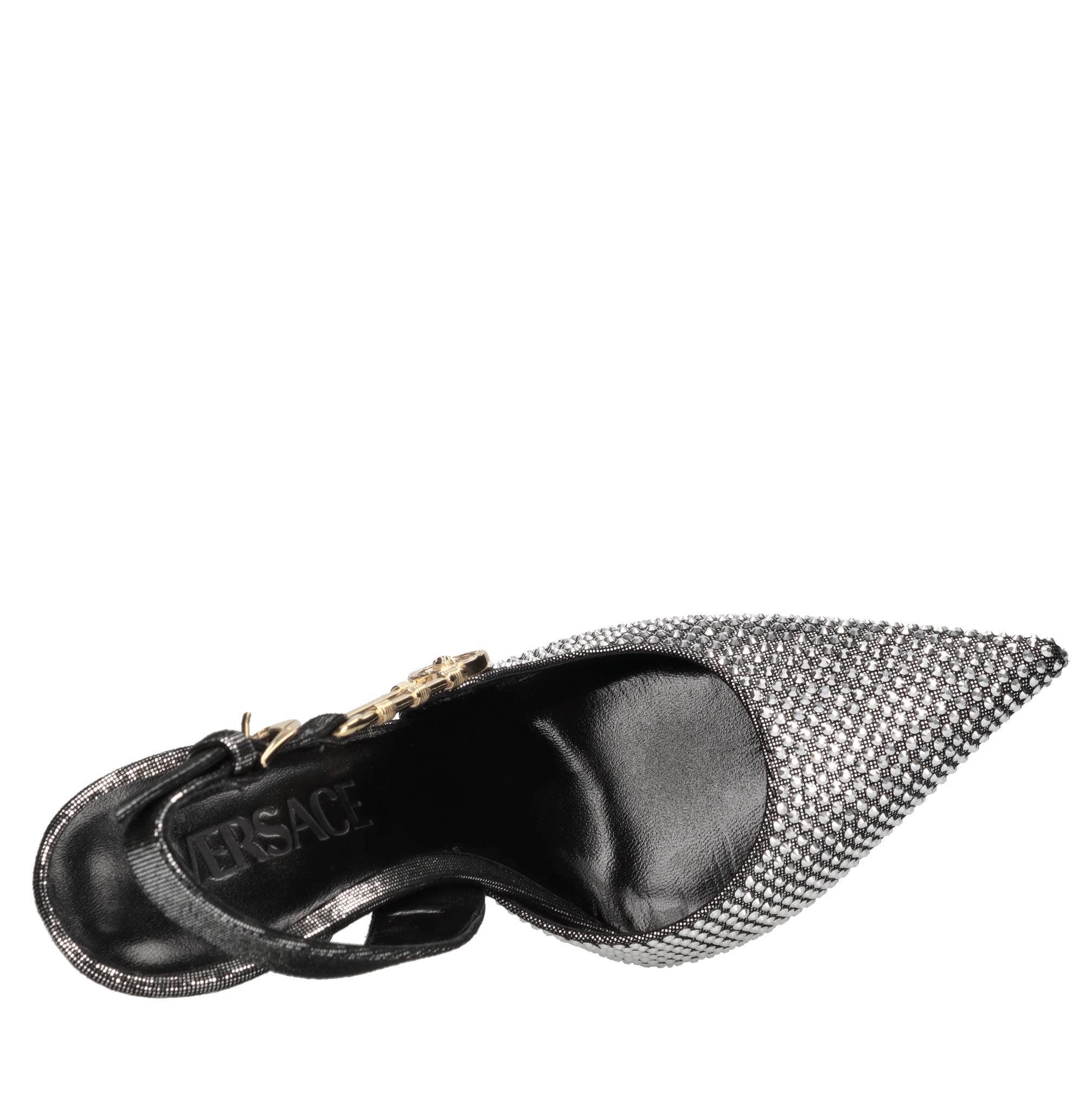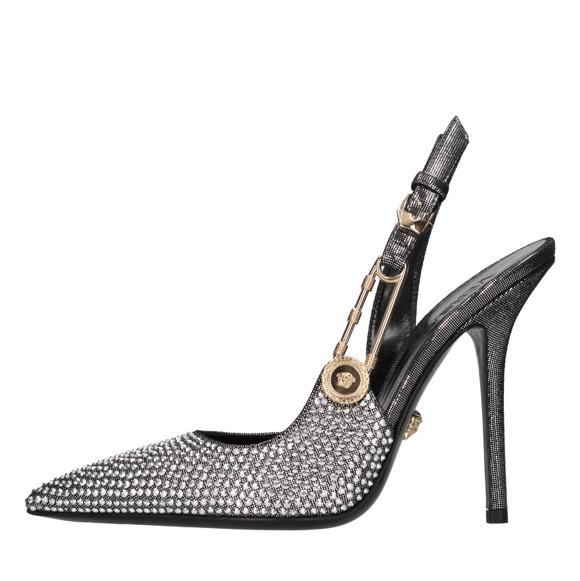 Leather and rhinestone slingback pumps. Gold-tone detail. Leather upper. Leather outsole.