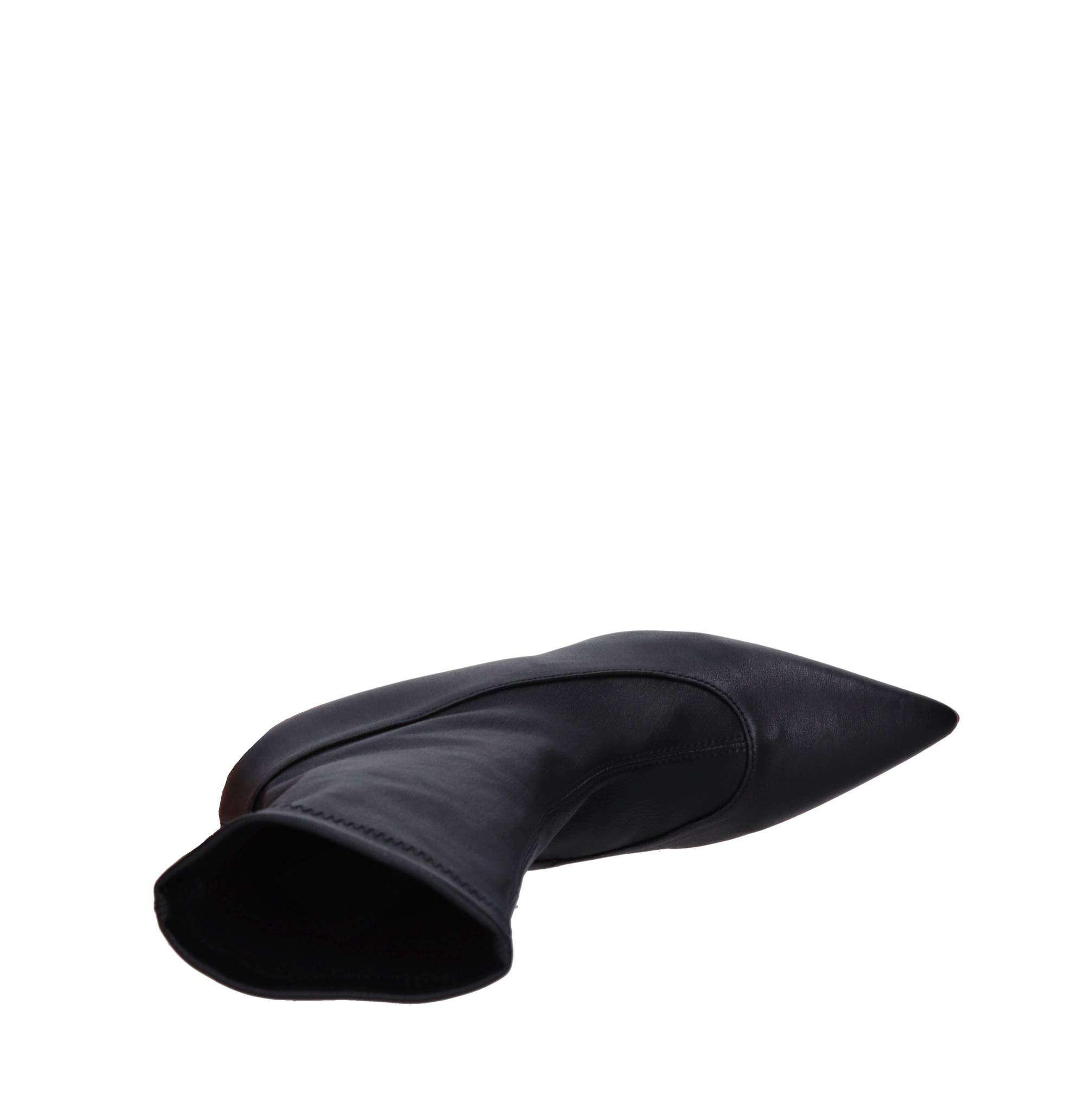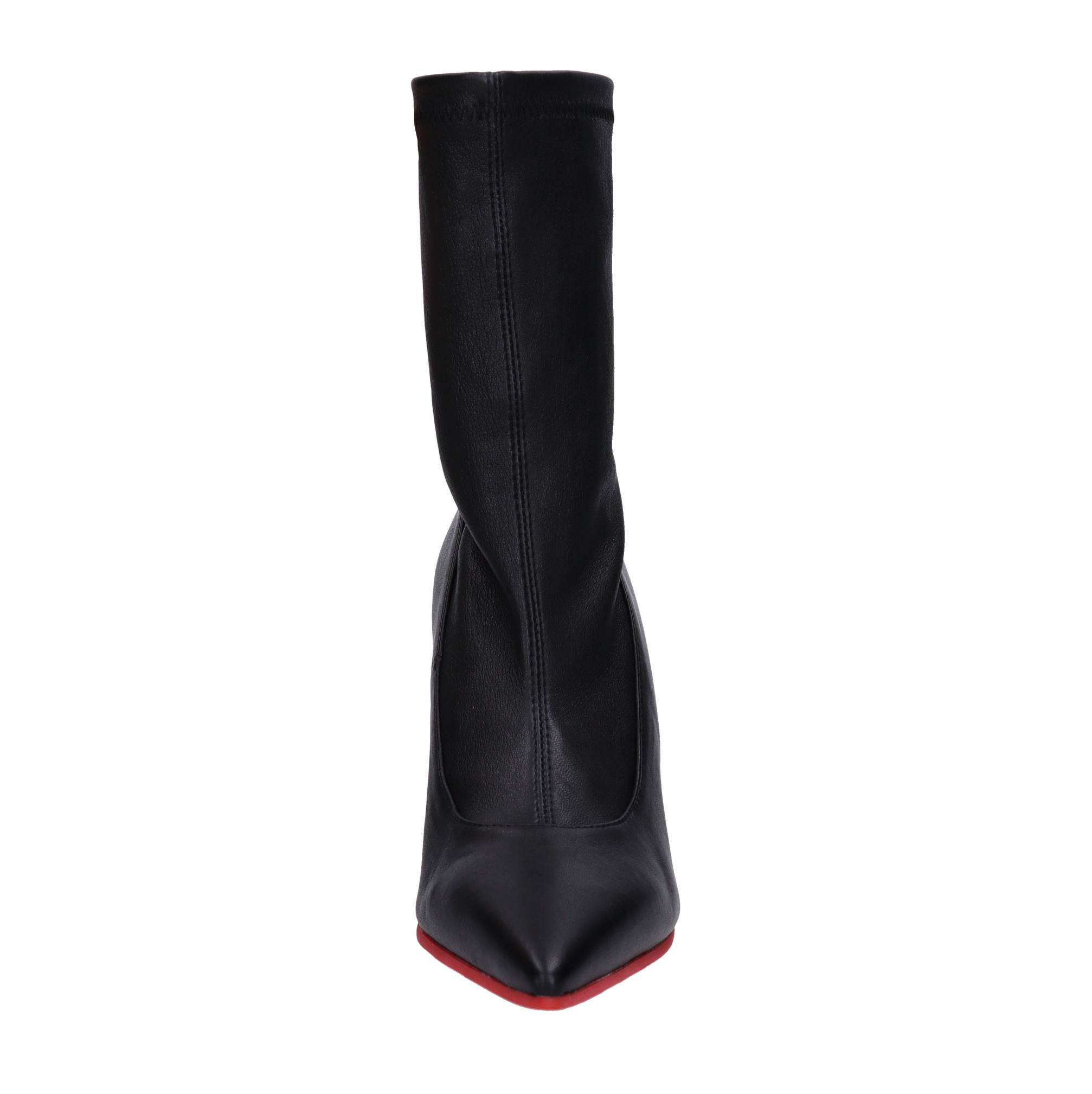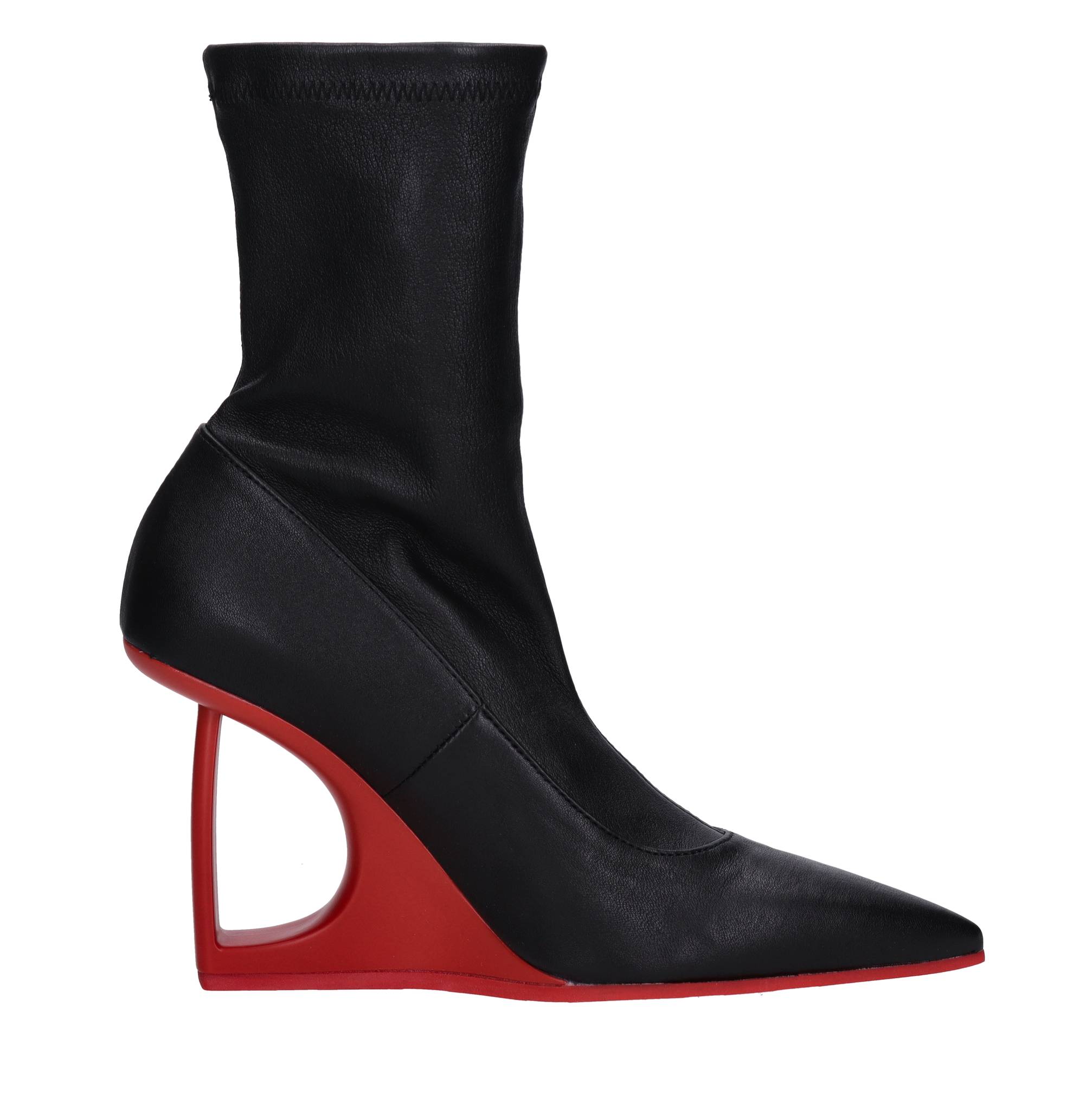 Leather ankle boots. Soft stretch nappa. Leather and fabric lining. Rubber outsole. Patent abs wedge heel.