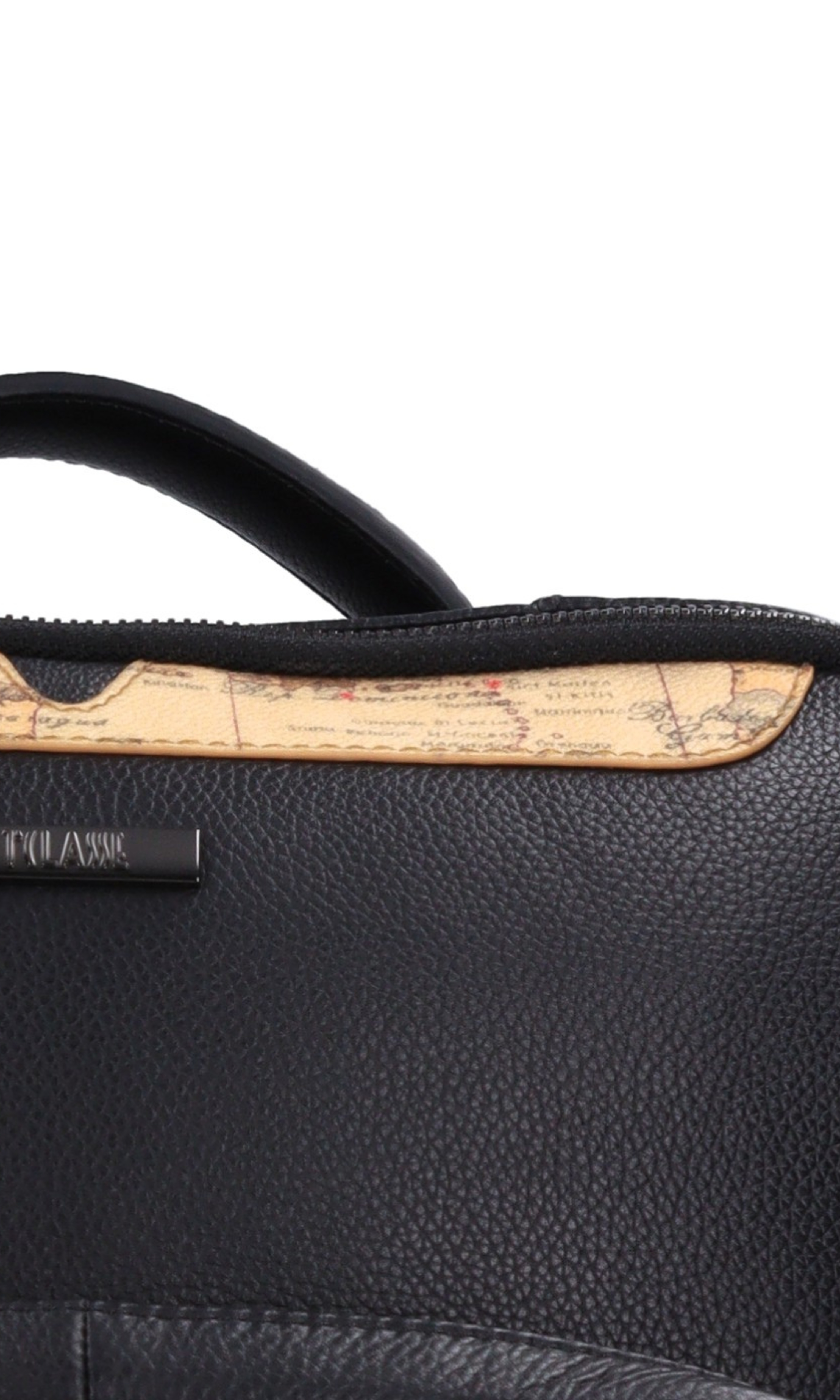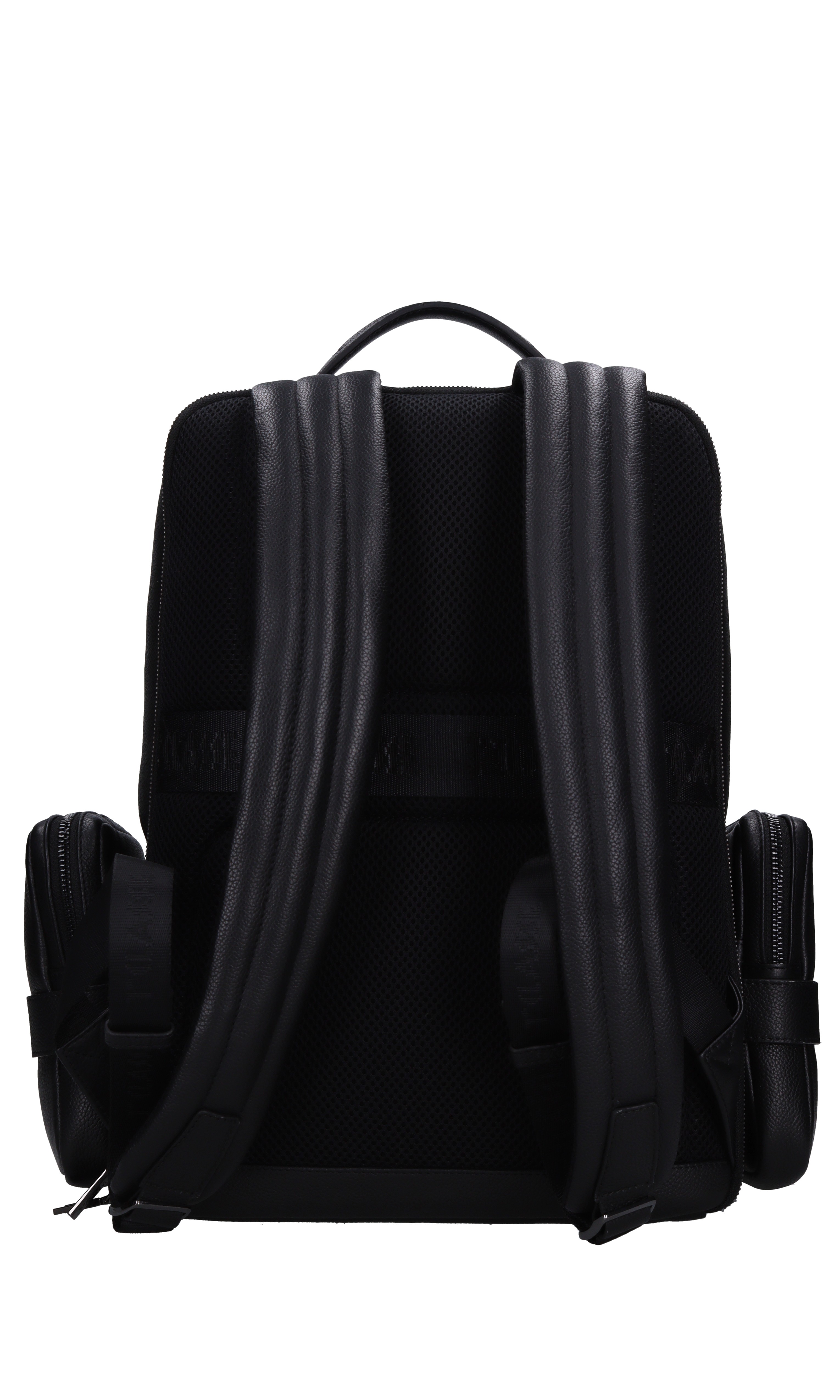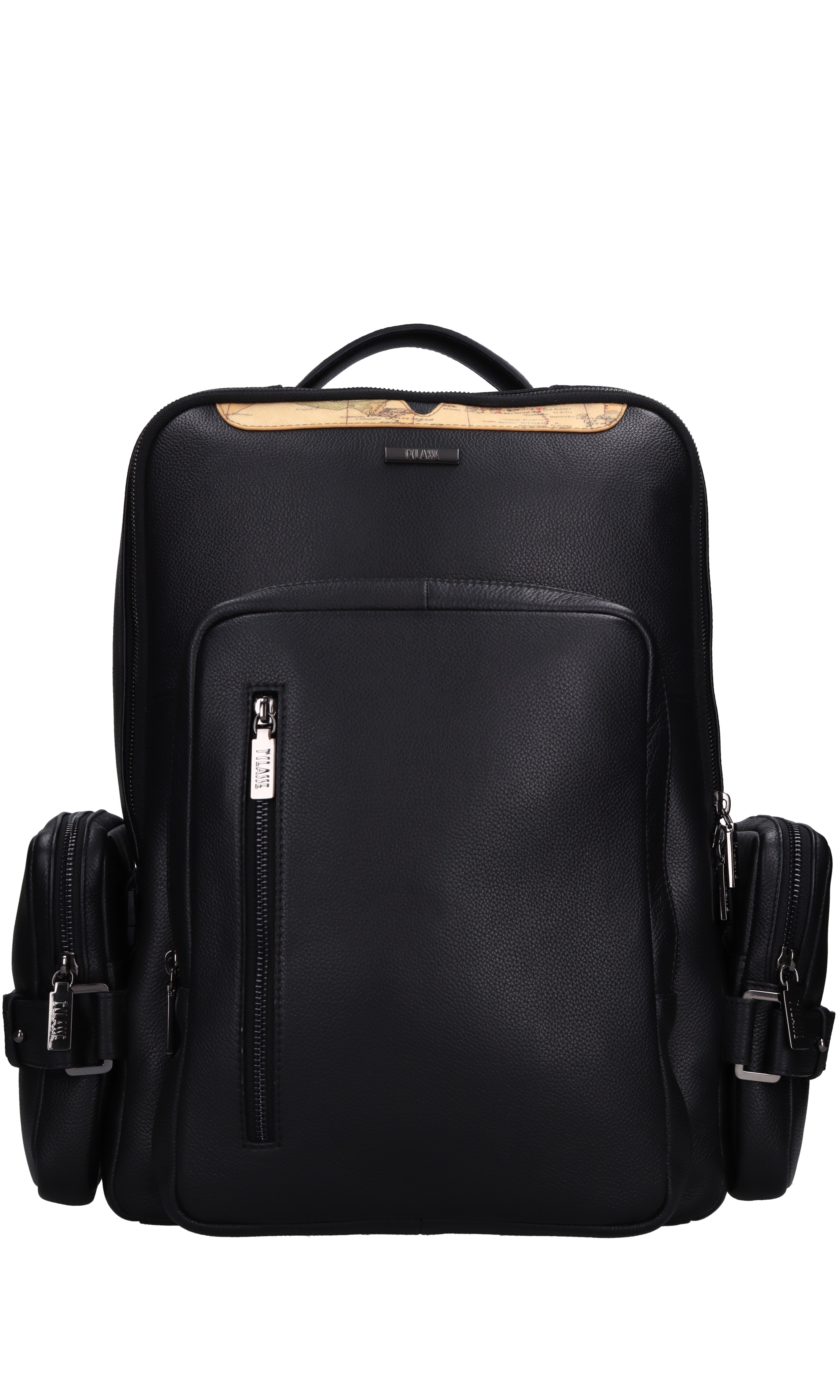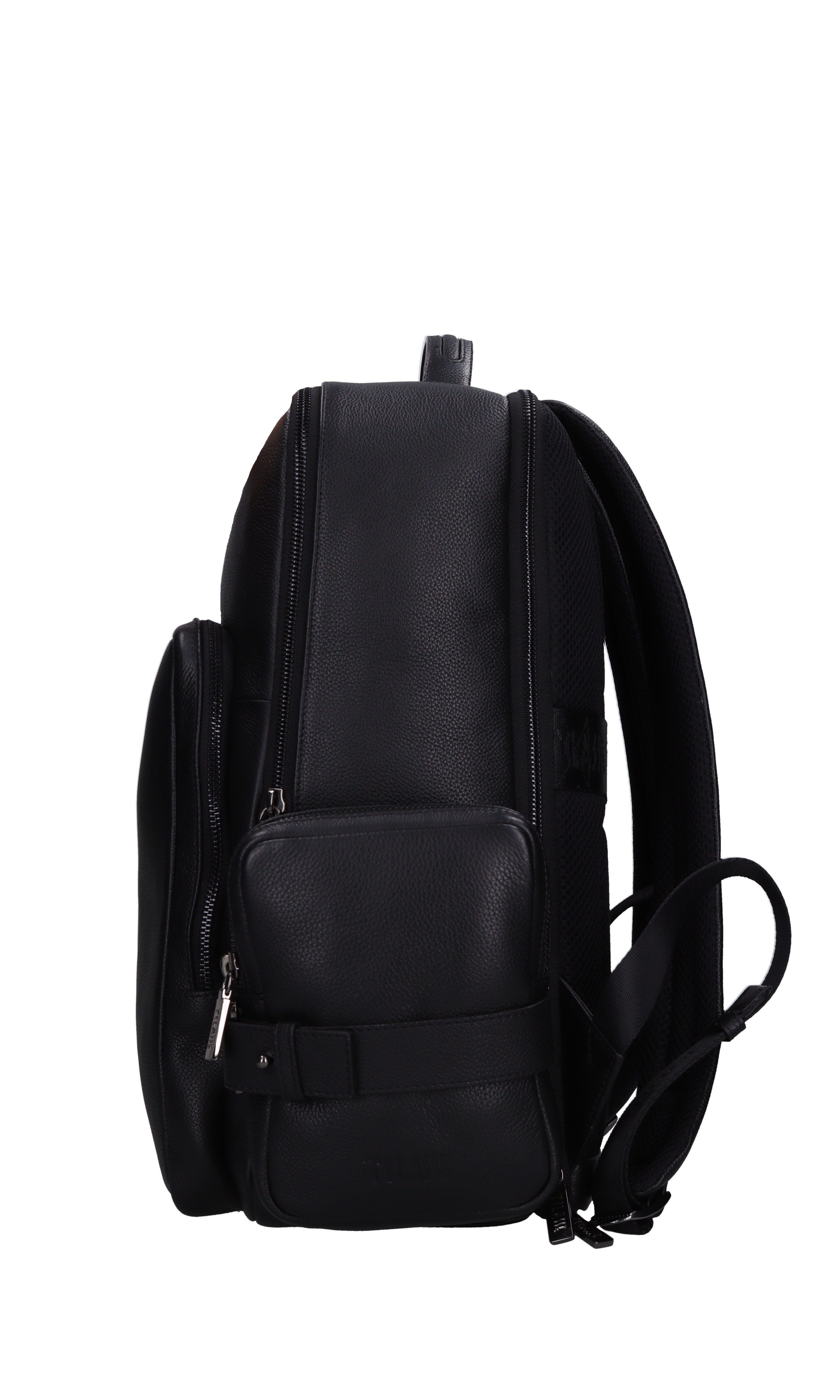Zaino in pelle. 2 Comparti. 1 Porta PC. 2 Tasche. 2 Pochette laterali estraibili con portabilità tracolla. Sistema d'aggancio ai trolley.