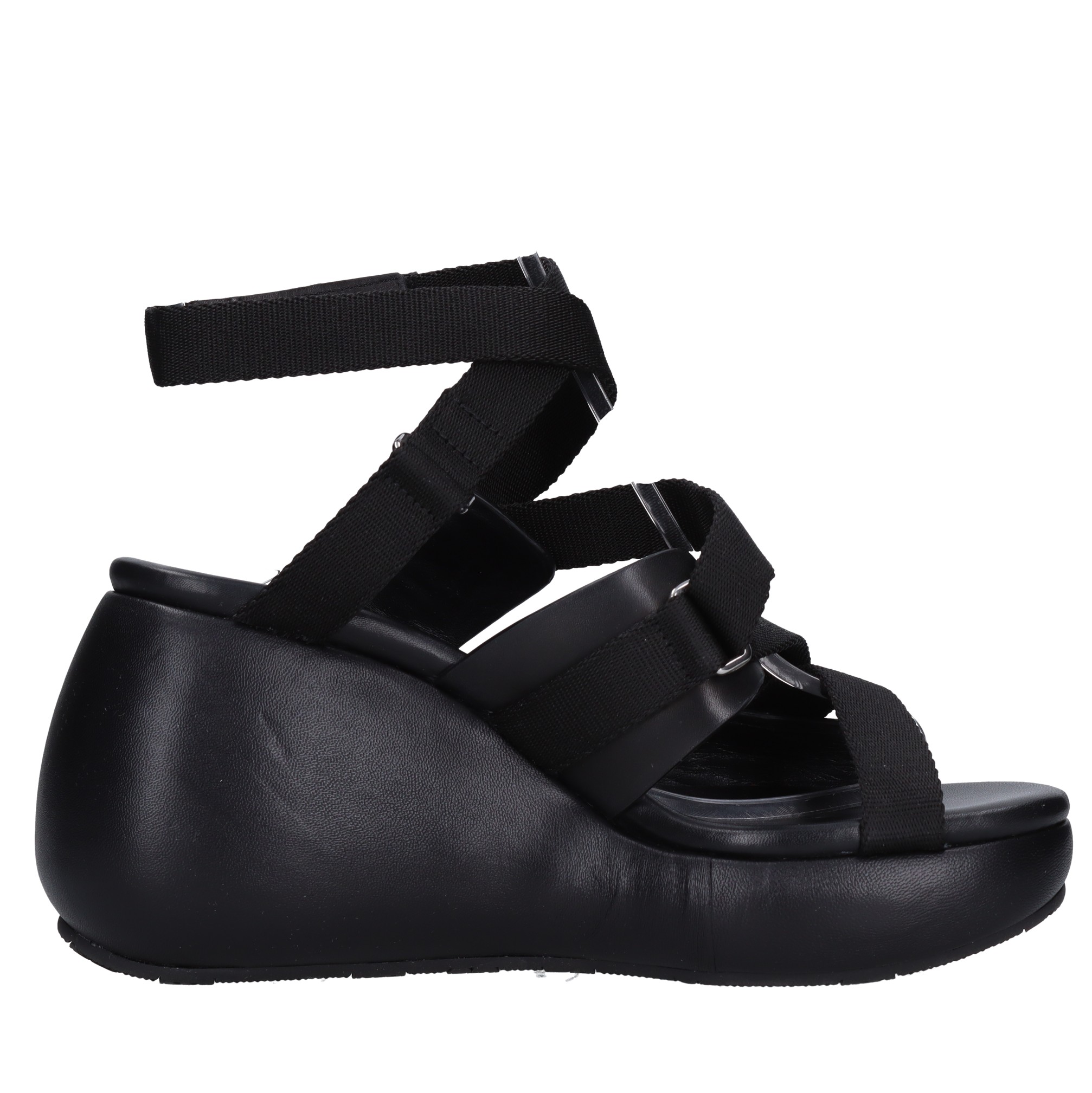Sandali Zeppa in tessuto e pelle. Chiusura a strappo. Plateau: 4 cm. Suola esterna in gomma. Piccole imperfezioni sul pellame. Tomaia interna in pelle. Campionario. Spedito su scatola neutra.