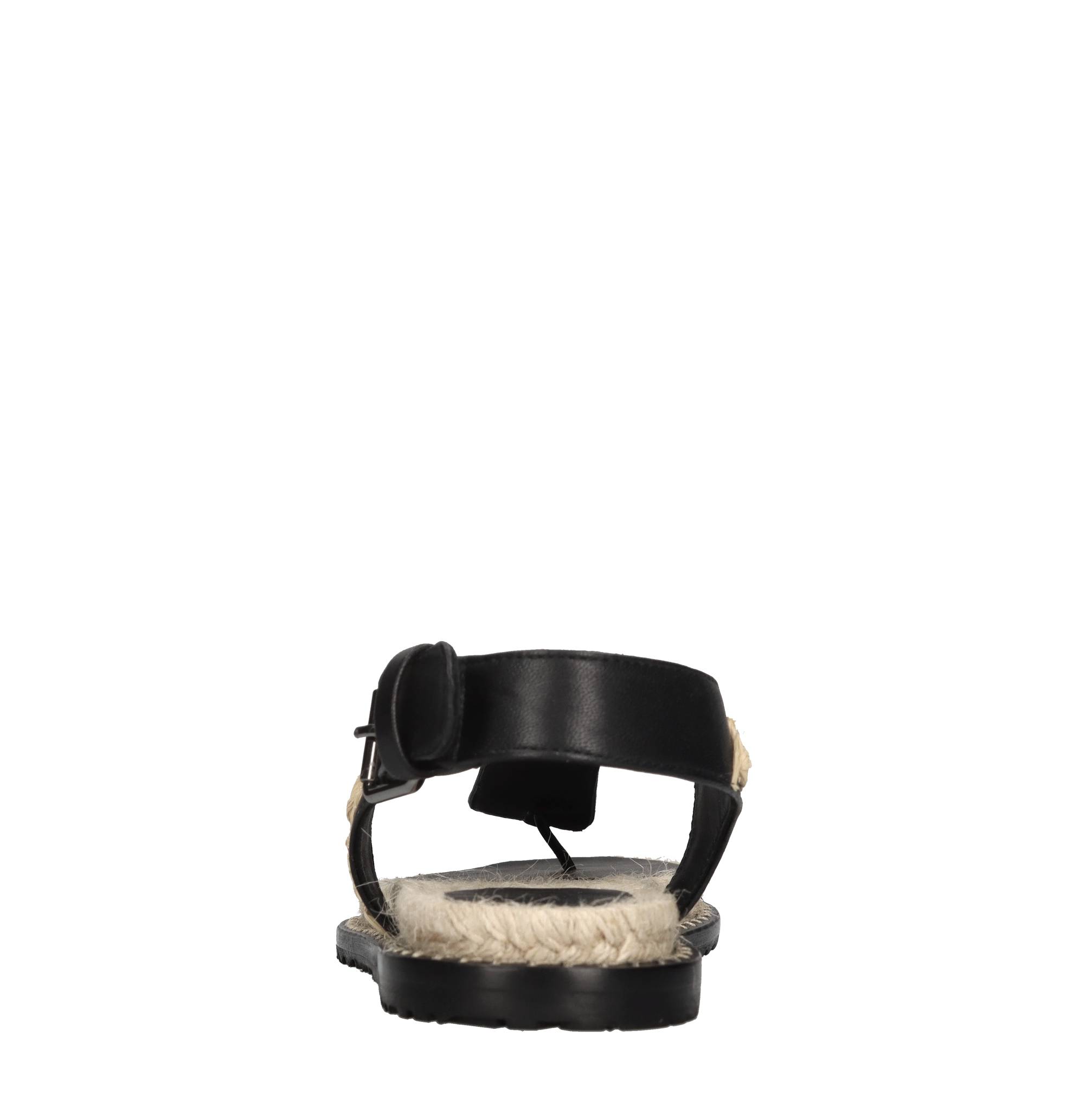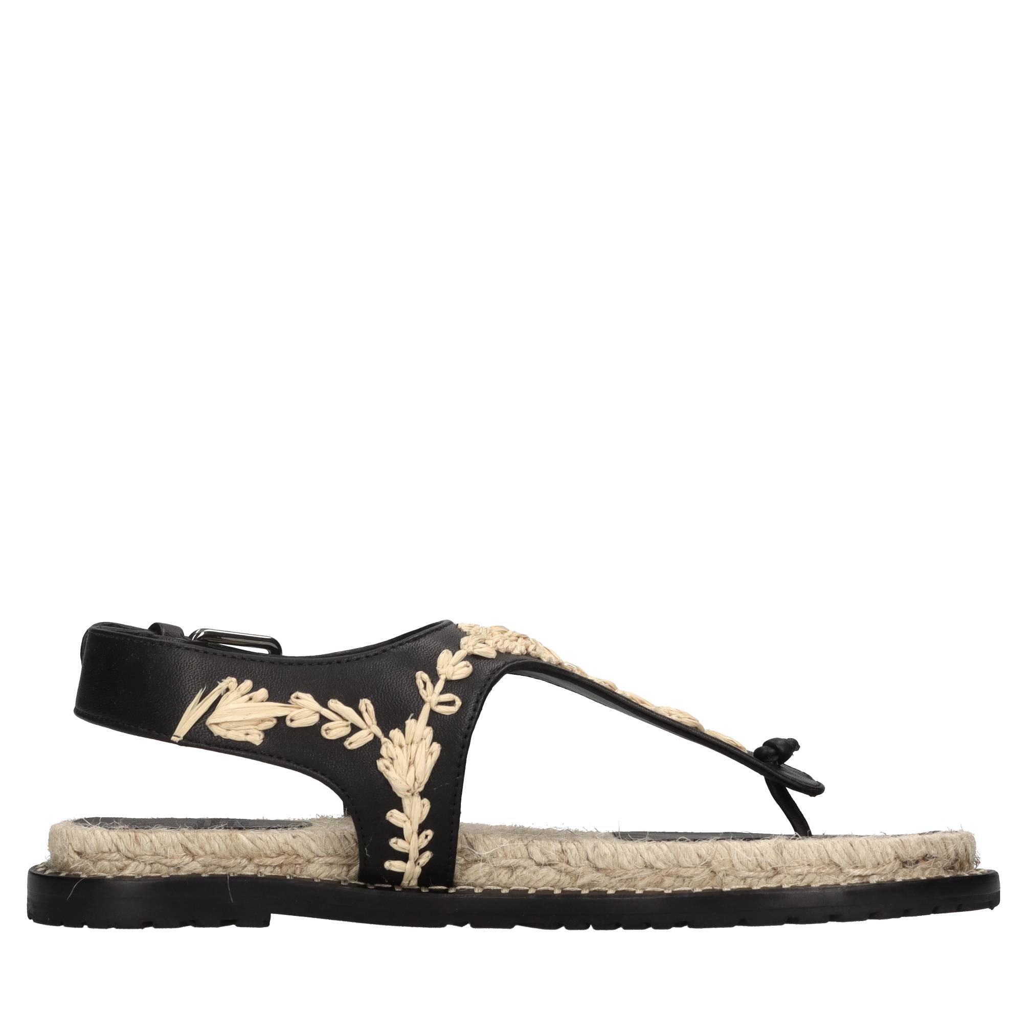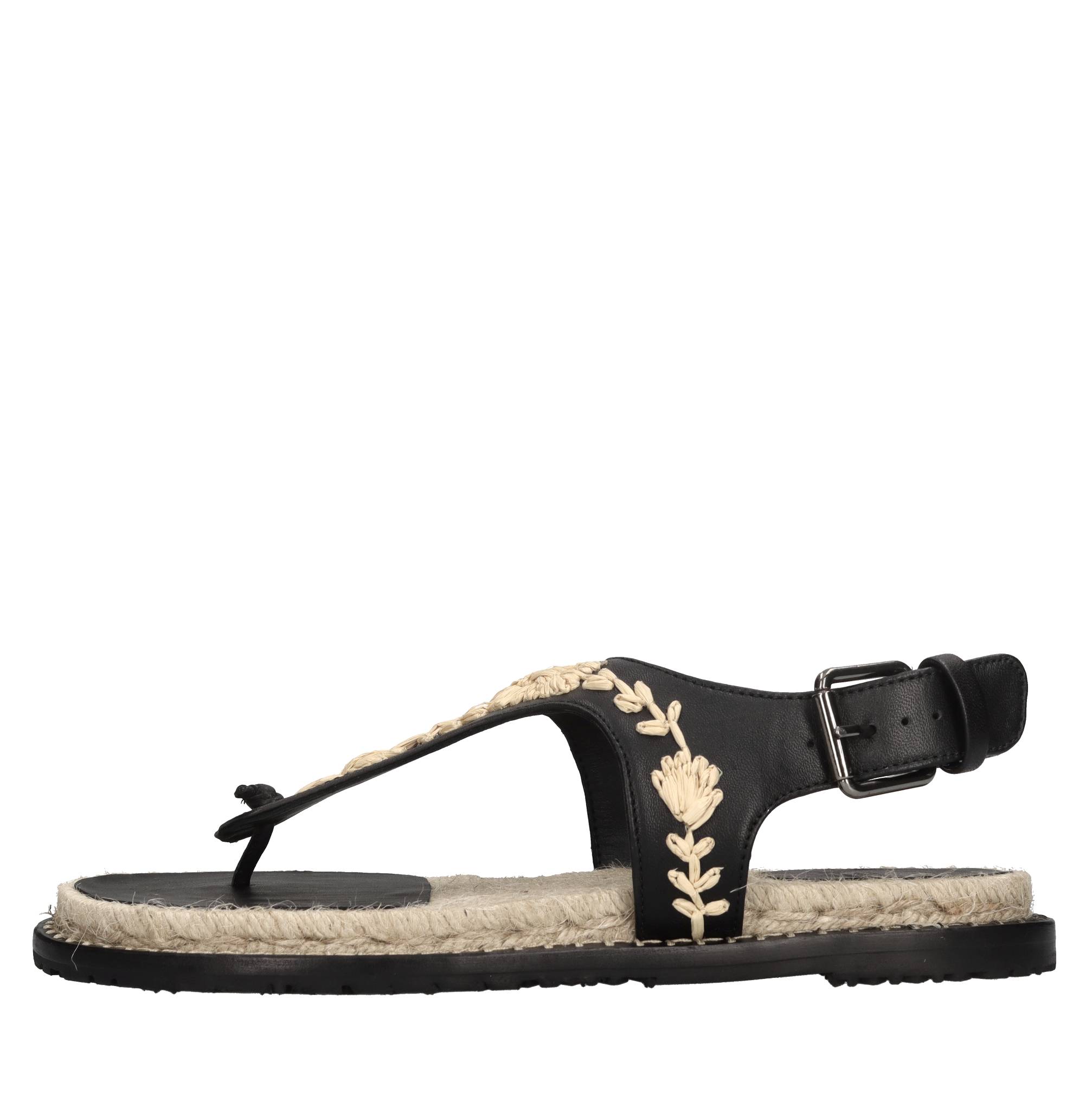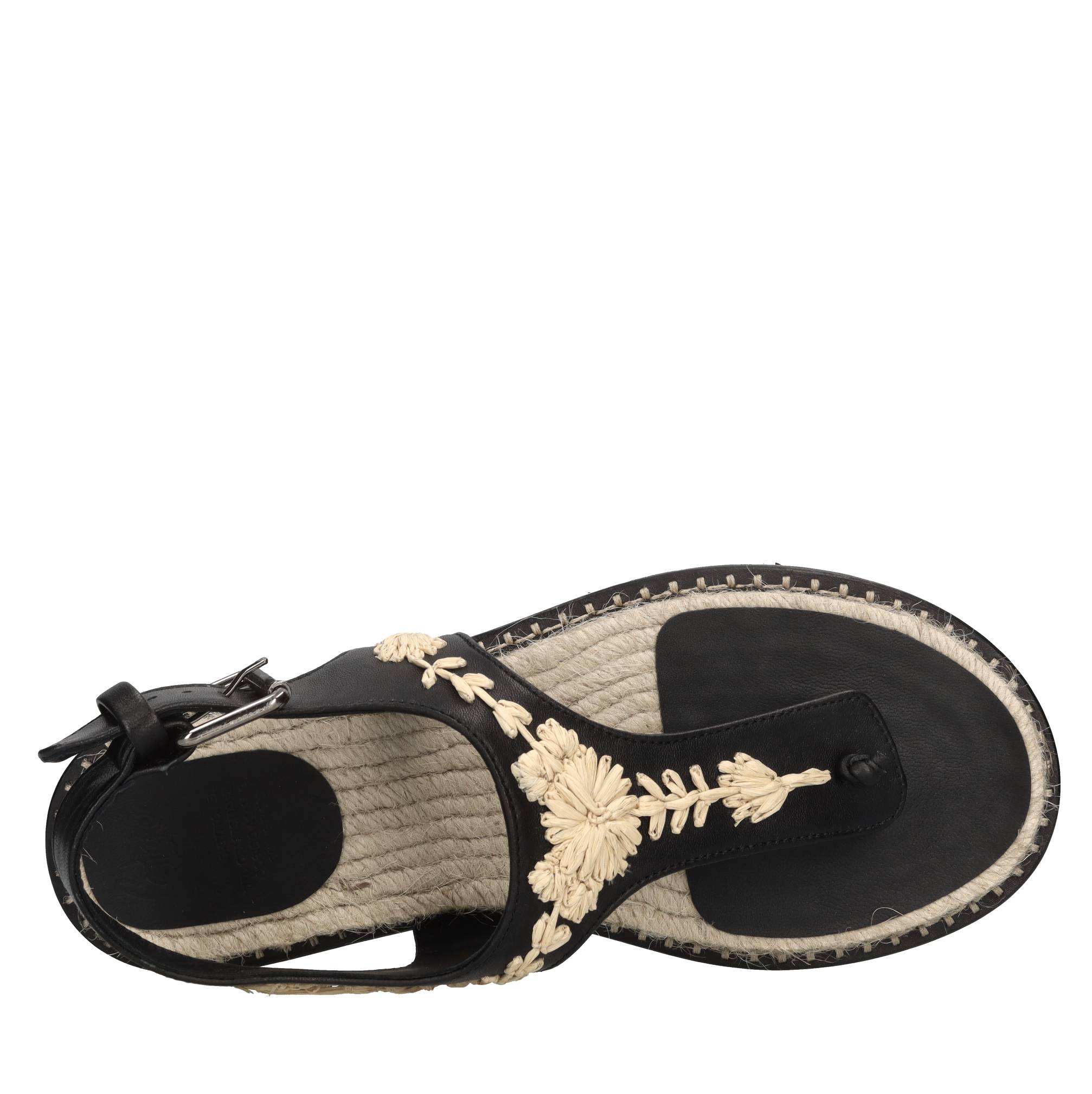 Sandali flat Pedra in pelle. Applicazioni fiori in rafia. Tomaia interna in pelle e tessuto. Suola esterna in gomma.