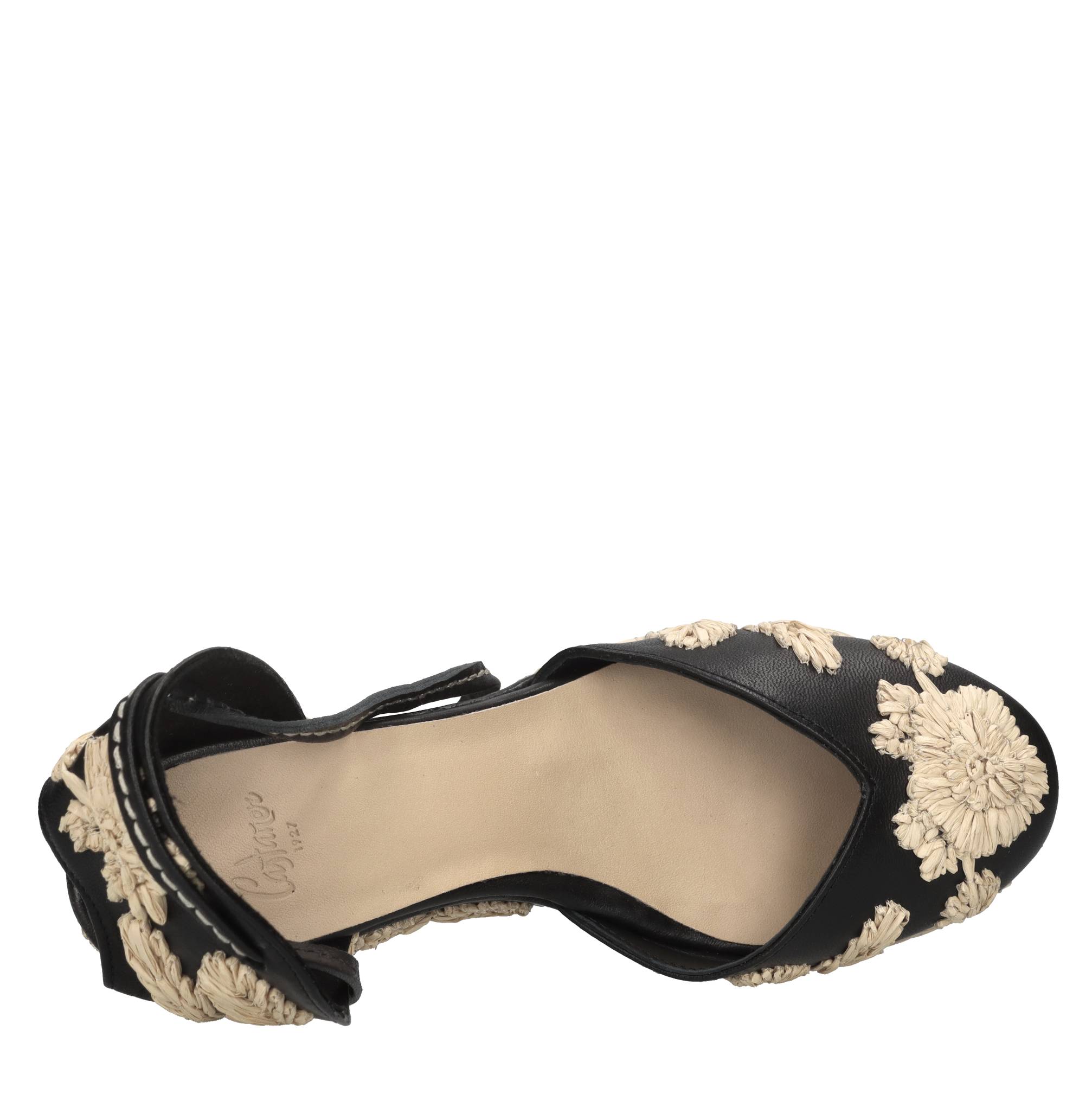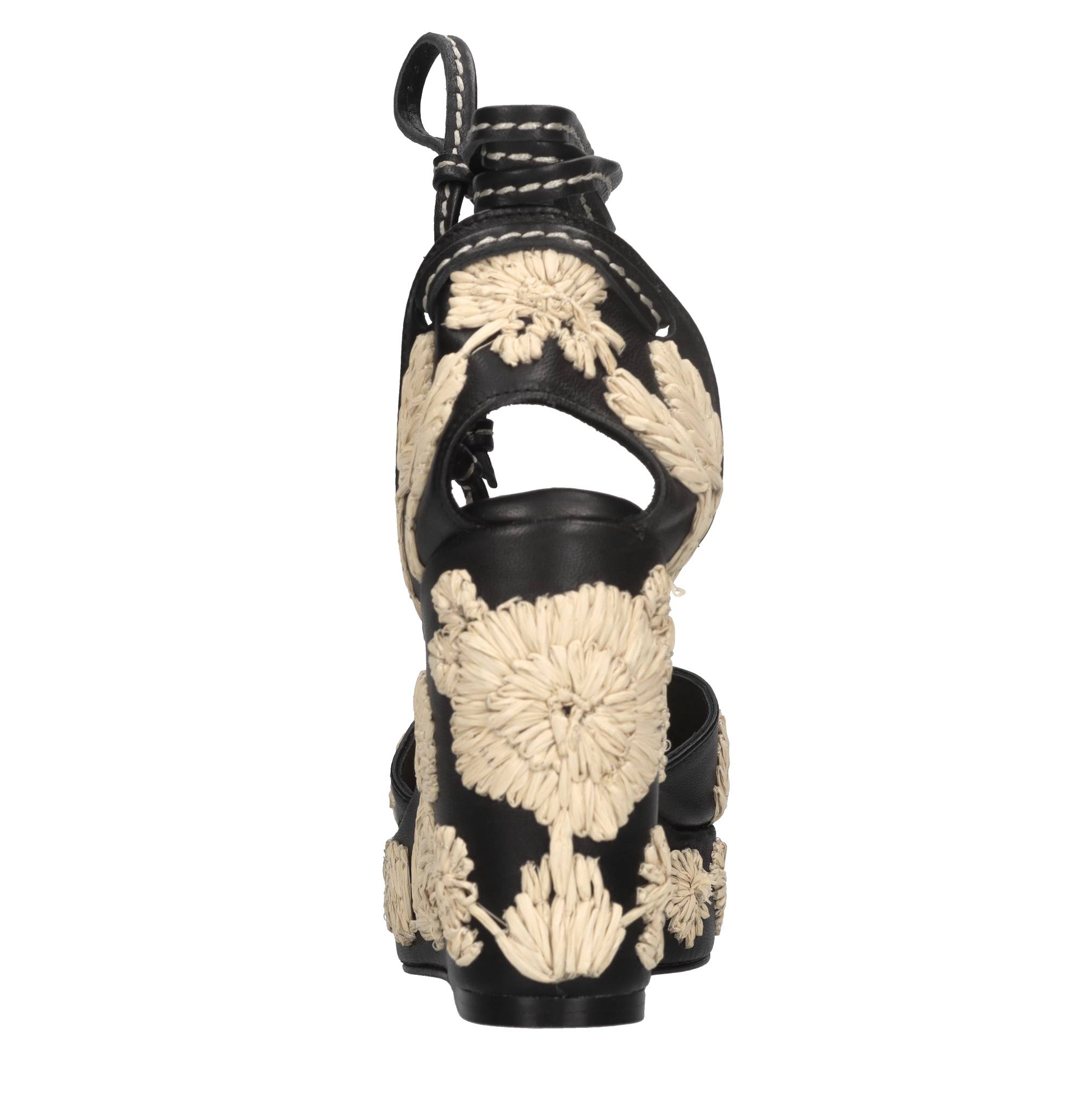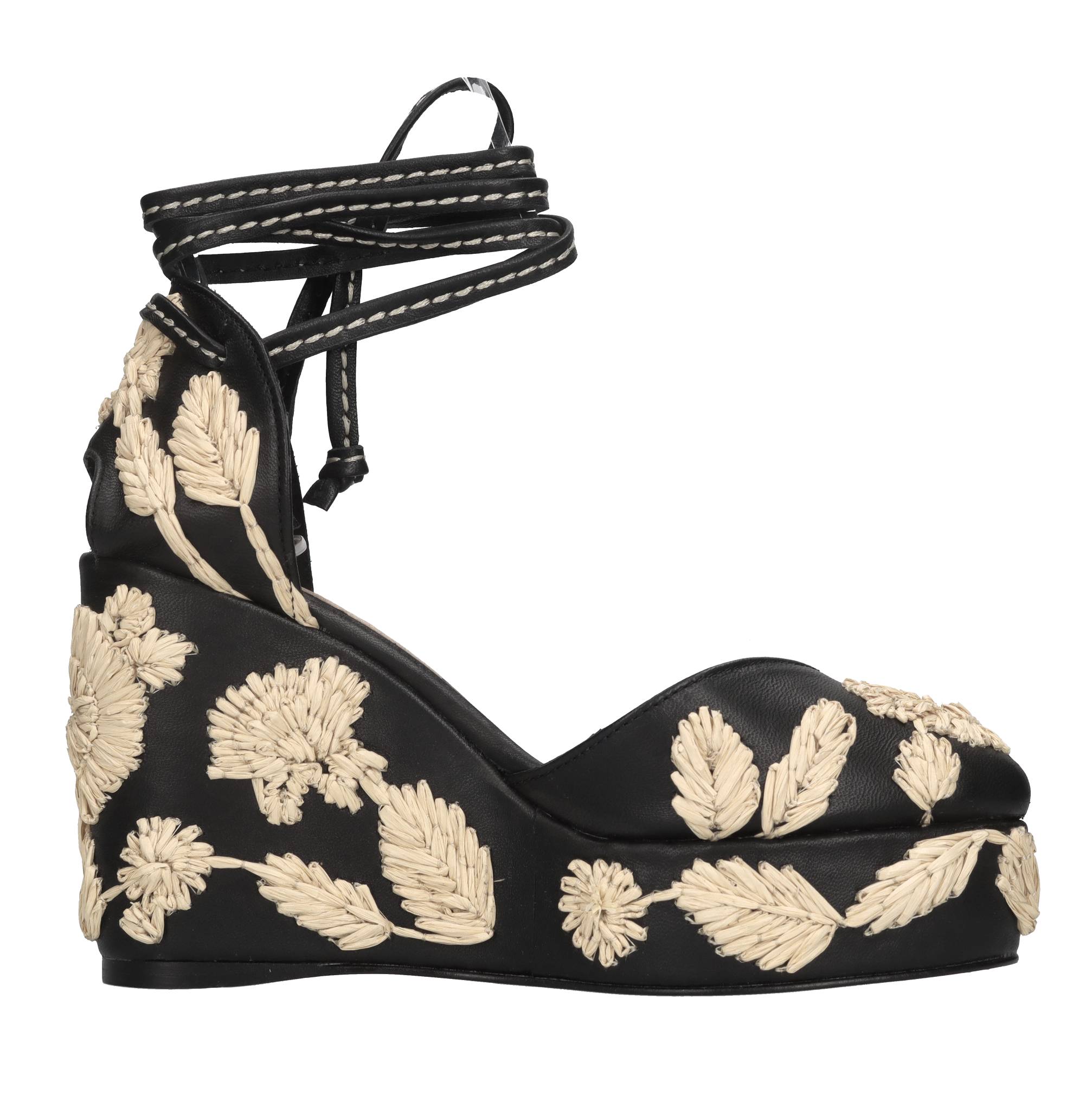 Zeppe Carmela in pelle. Applicazioni fiori in rafia. Tomaia interna in pelle. Suola esterna in materiale sintetico.