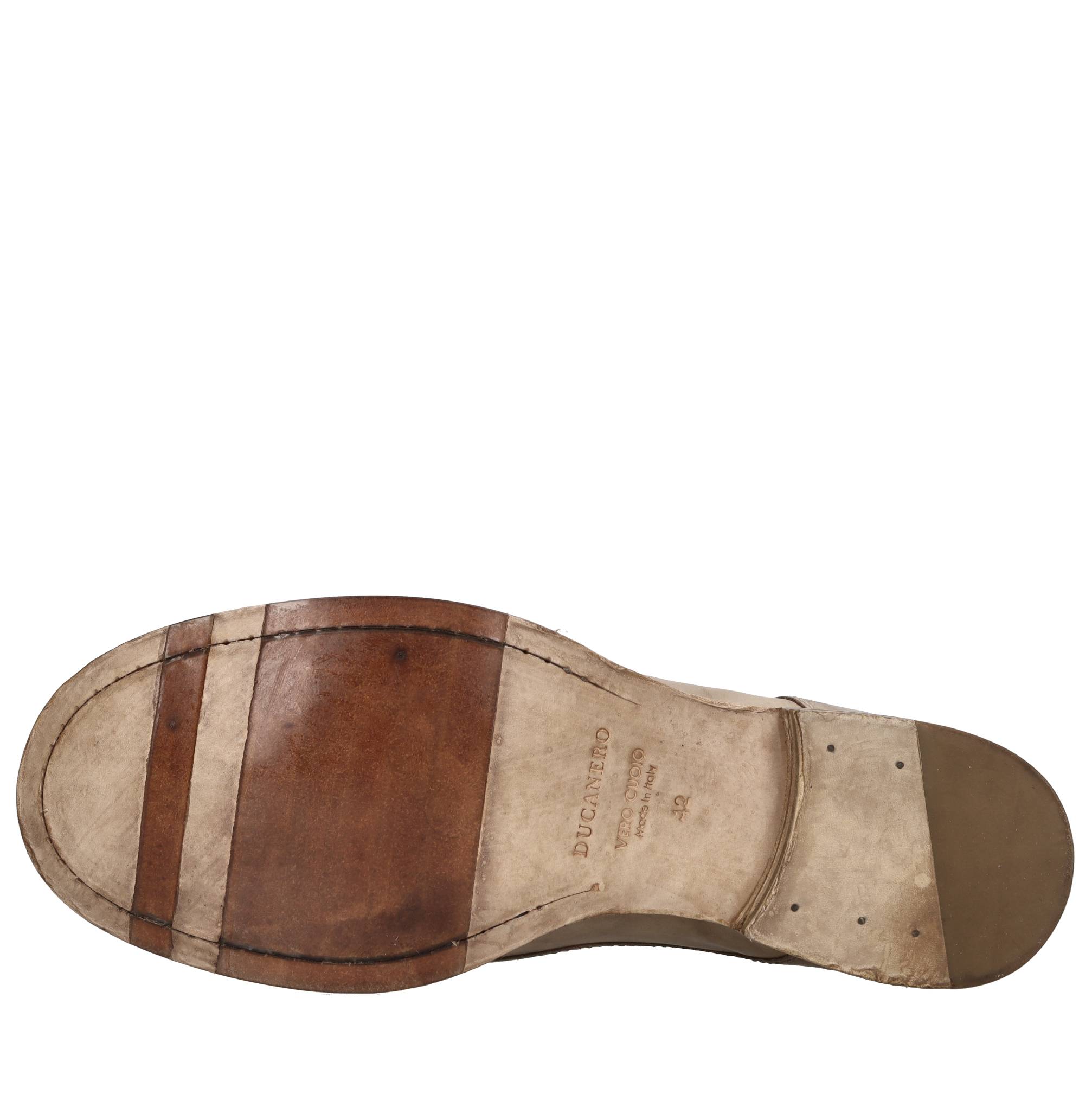 Polacchine in pelle. Suola esterna in cuoio logato. Tomaia interna in pelle. Effetto vintage.
