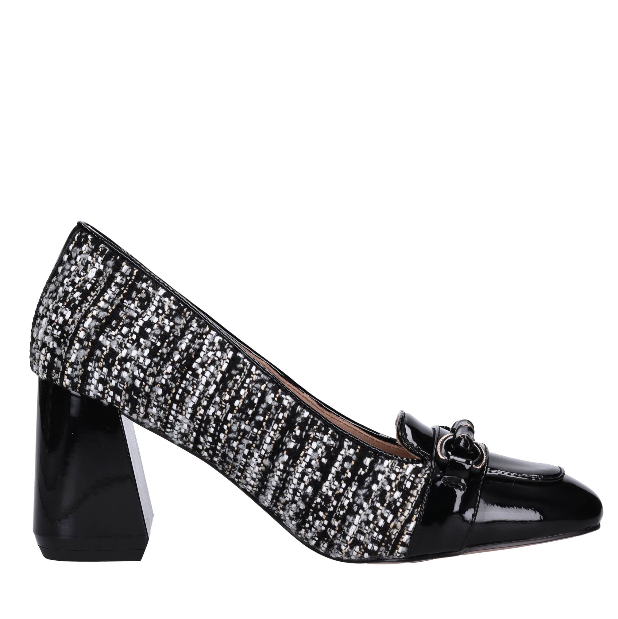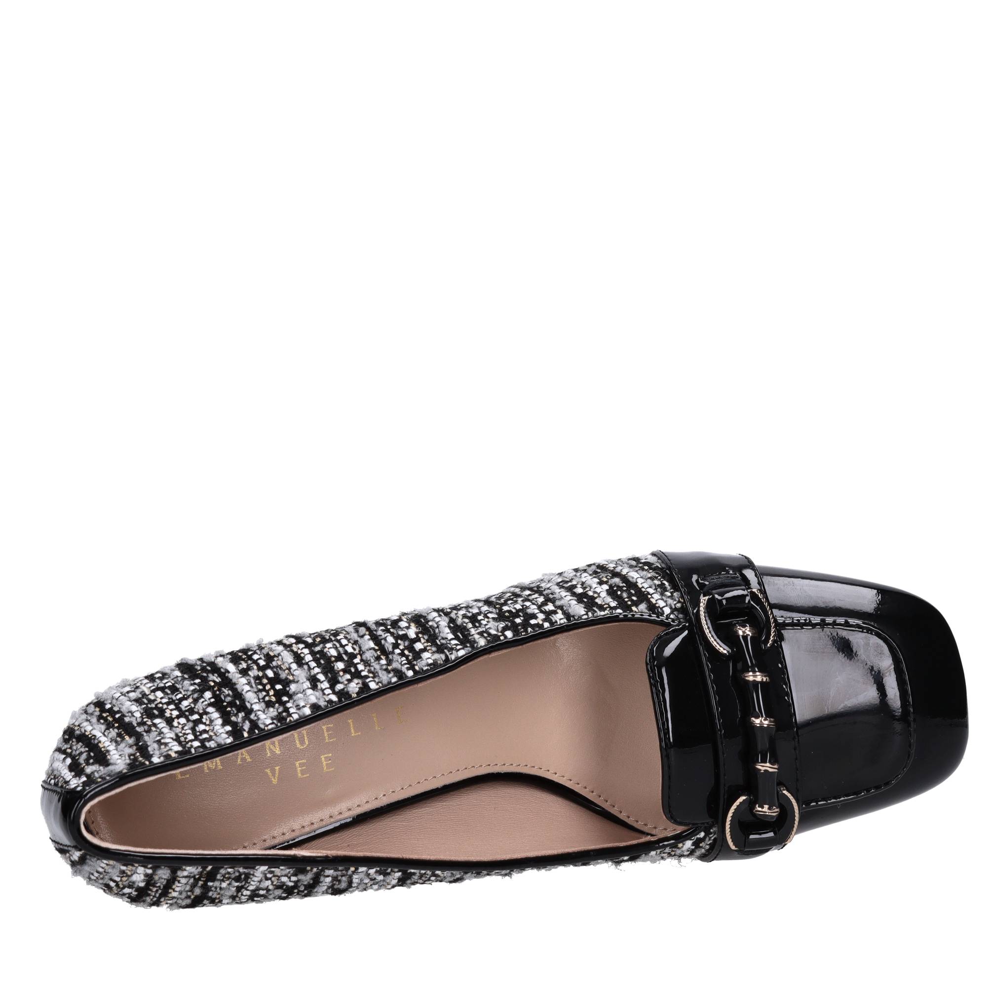 Mocassini in vernice e tessuto. Tomaia interna in pelle. Suola esterna in ecopelle e gomma.