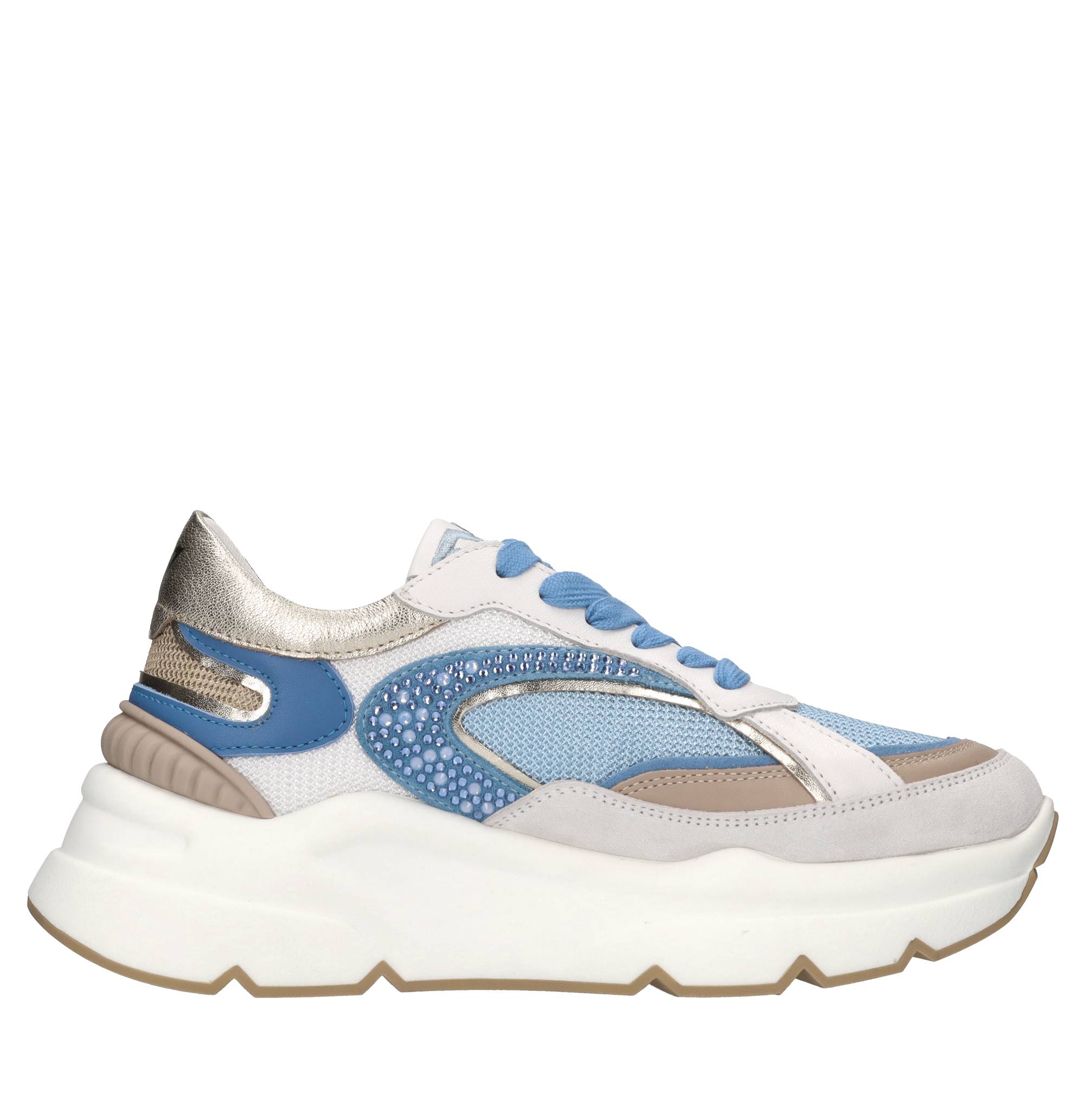 Sneakers in pelle,tessuto e strass. Tomaia interna in pelle e tessuto. Suola esterna in gomma.