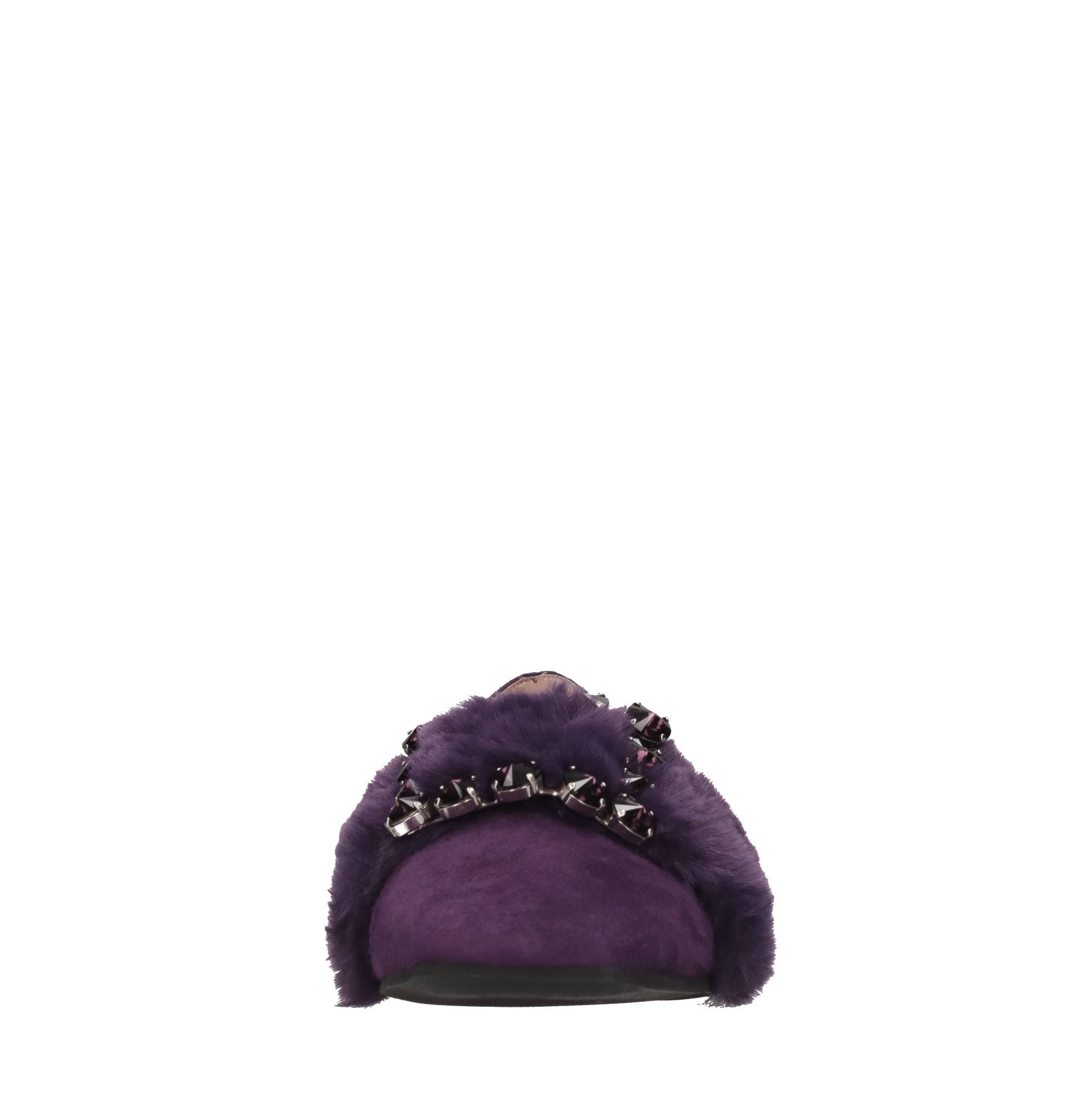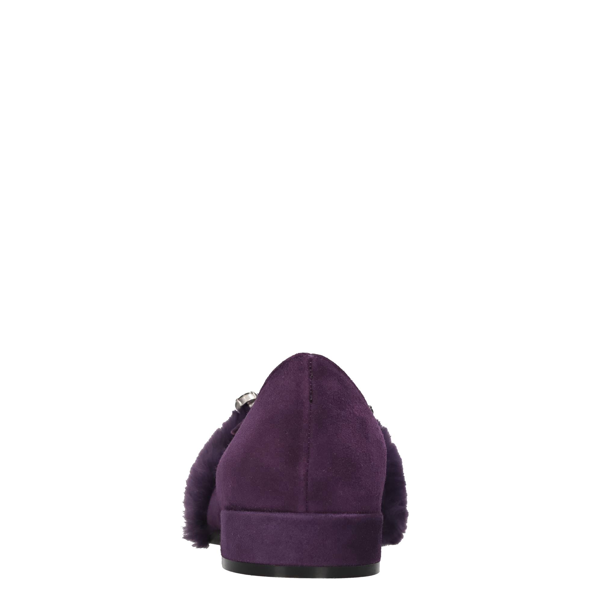 Mocassini in camoscio. Applicazione in ecopelliccia e strass viola. Tomaia interna in pelle. Suola esterna in gomma.