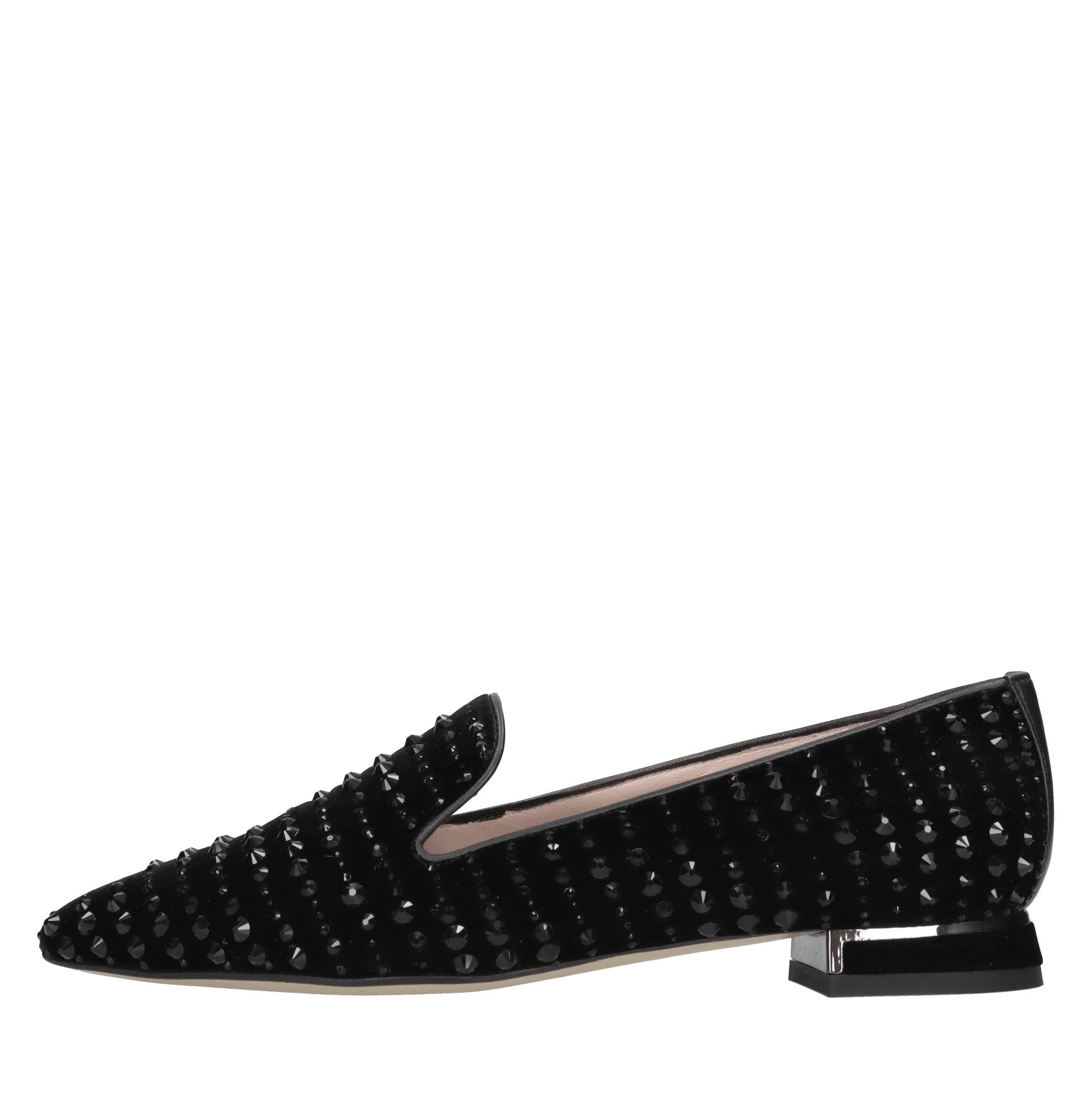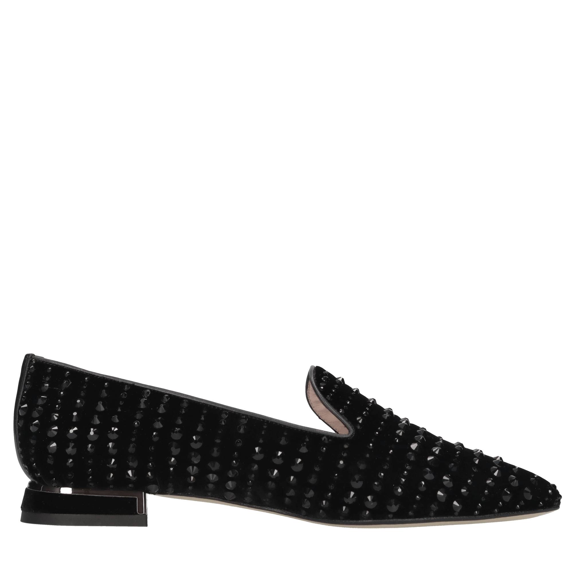Mocassini in velluto. Con strass. Tomaia interna in pelle. Suola esterna in cuoio.
