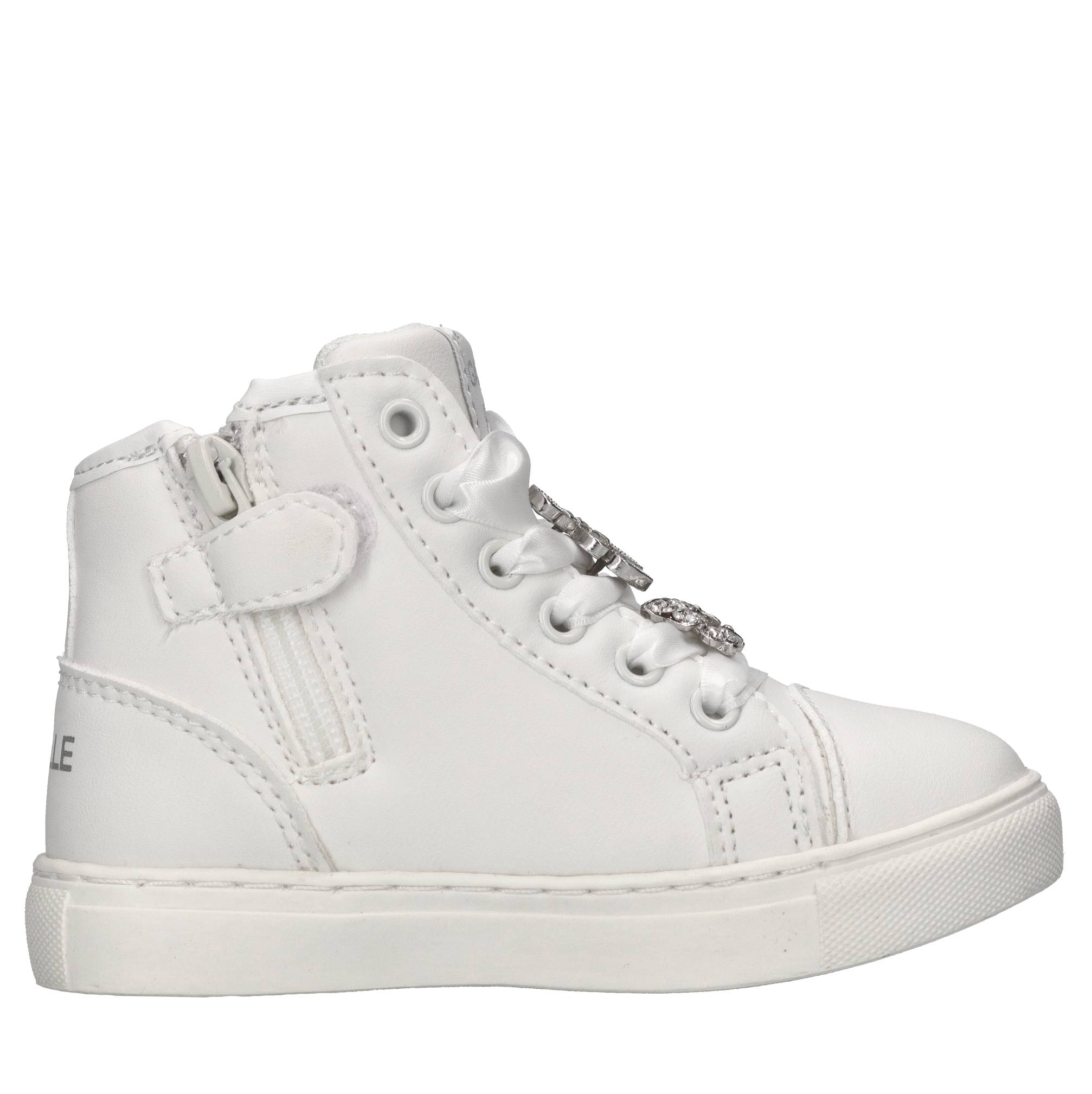 Sneakers in ecopelle. Tomaia interna in pelle e tessuto. Suola esterna in gomma. Applicazioni farfalla ed orsetto con strass rimovibili. Zip laterale interna.
