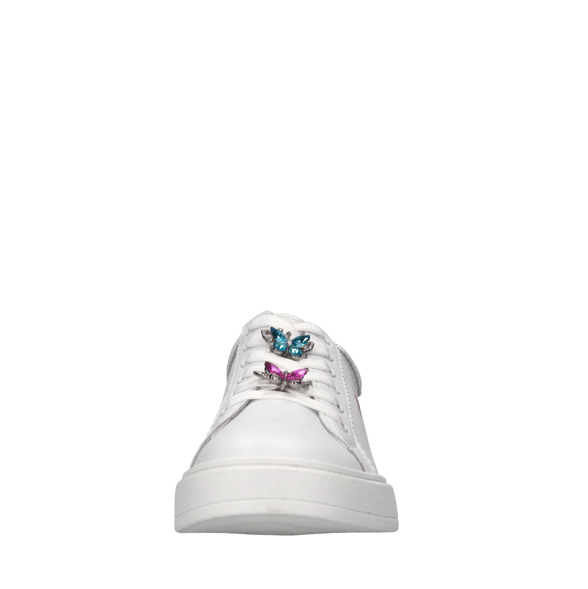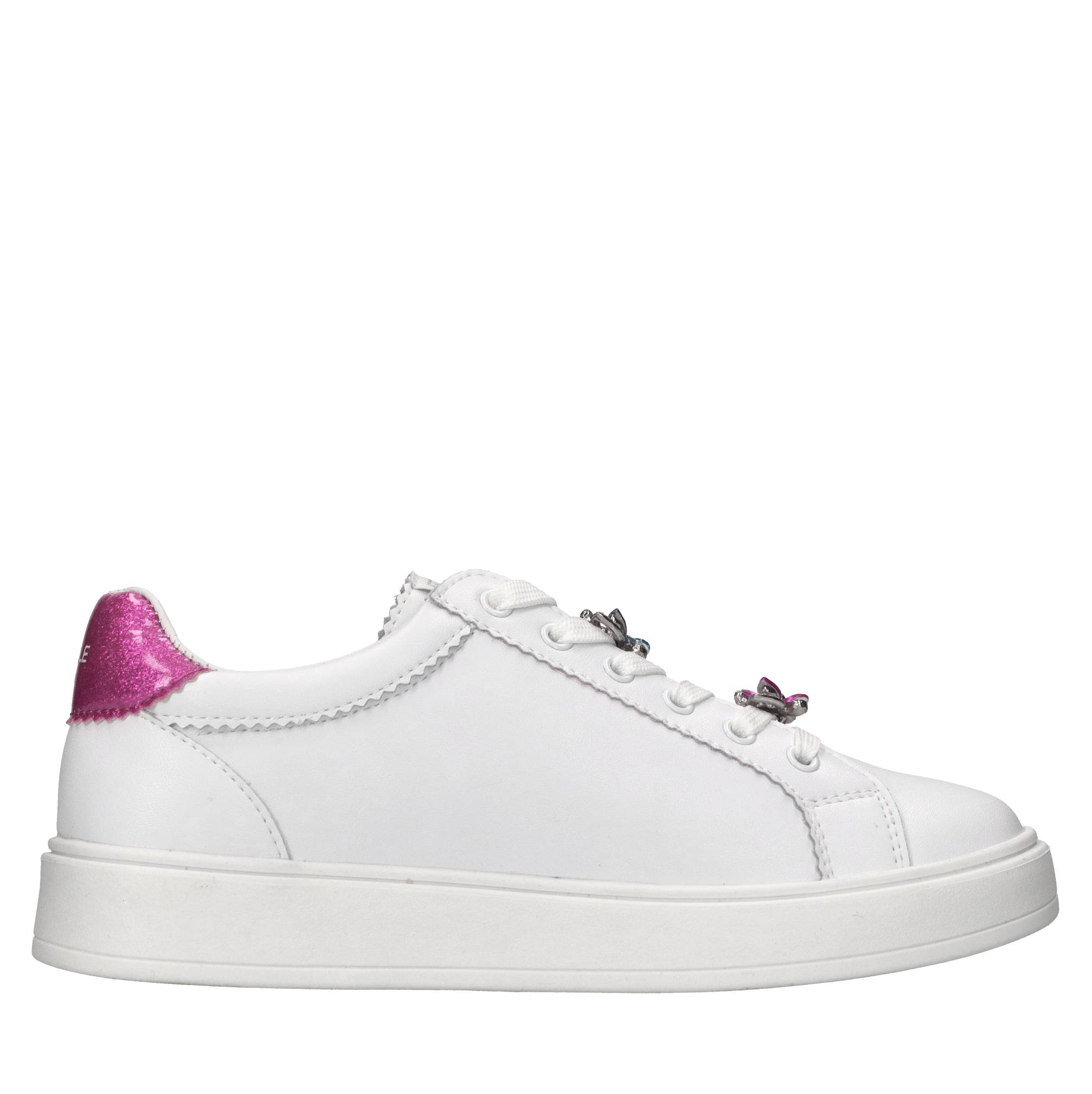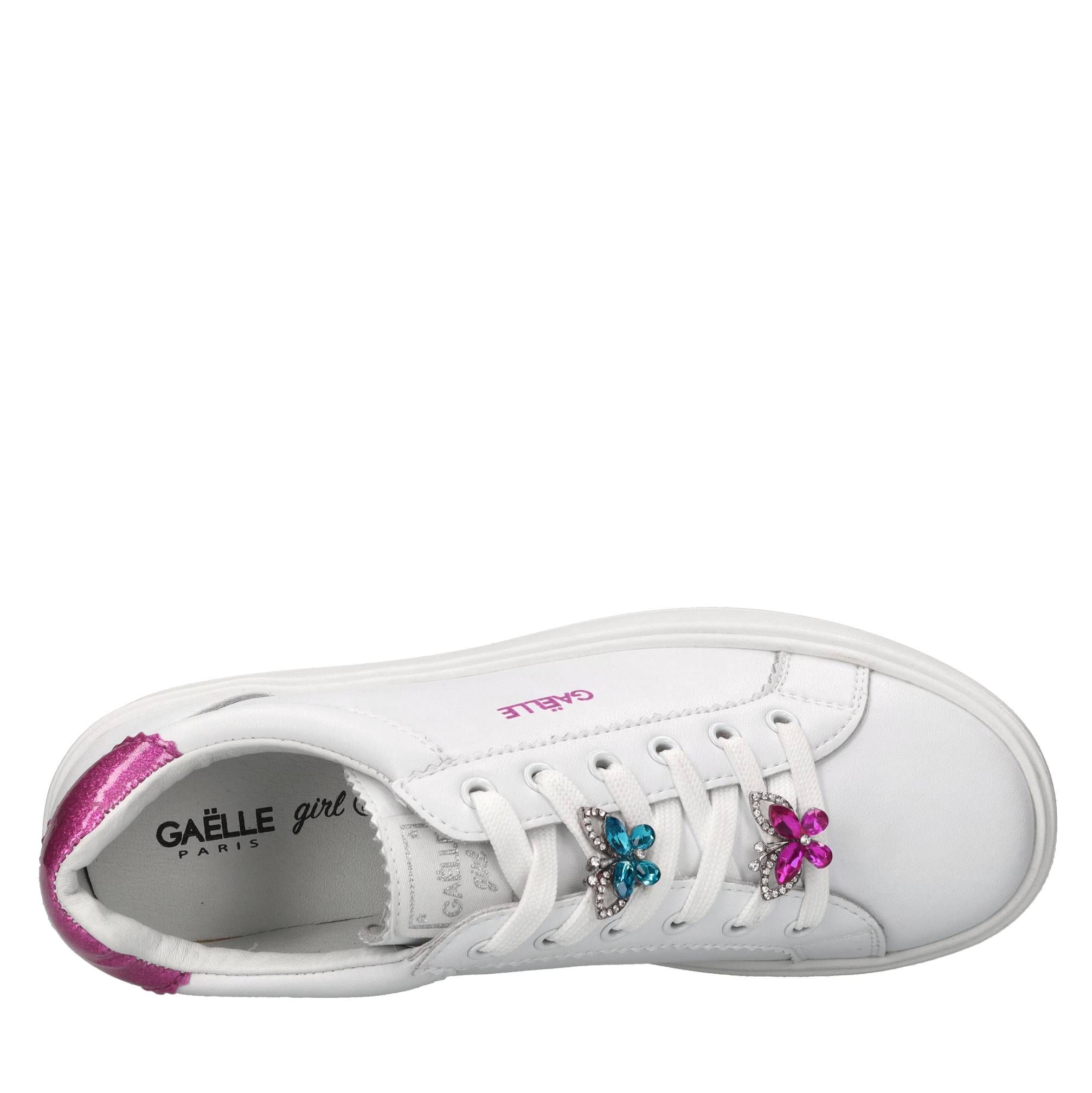 Sneakers in pelle. Tomaia interna in pelle e tessuto. Suola esterna in gomma. Applicazioni farfalle con strass azzurro e fucsia rimovibili.