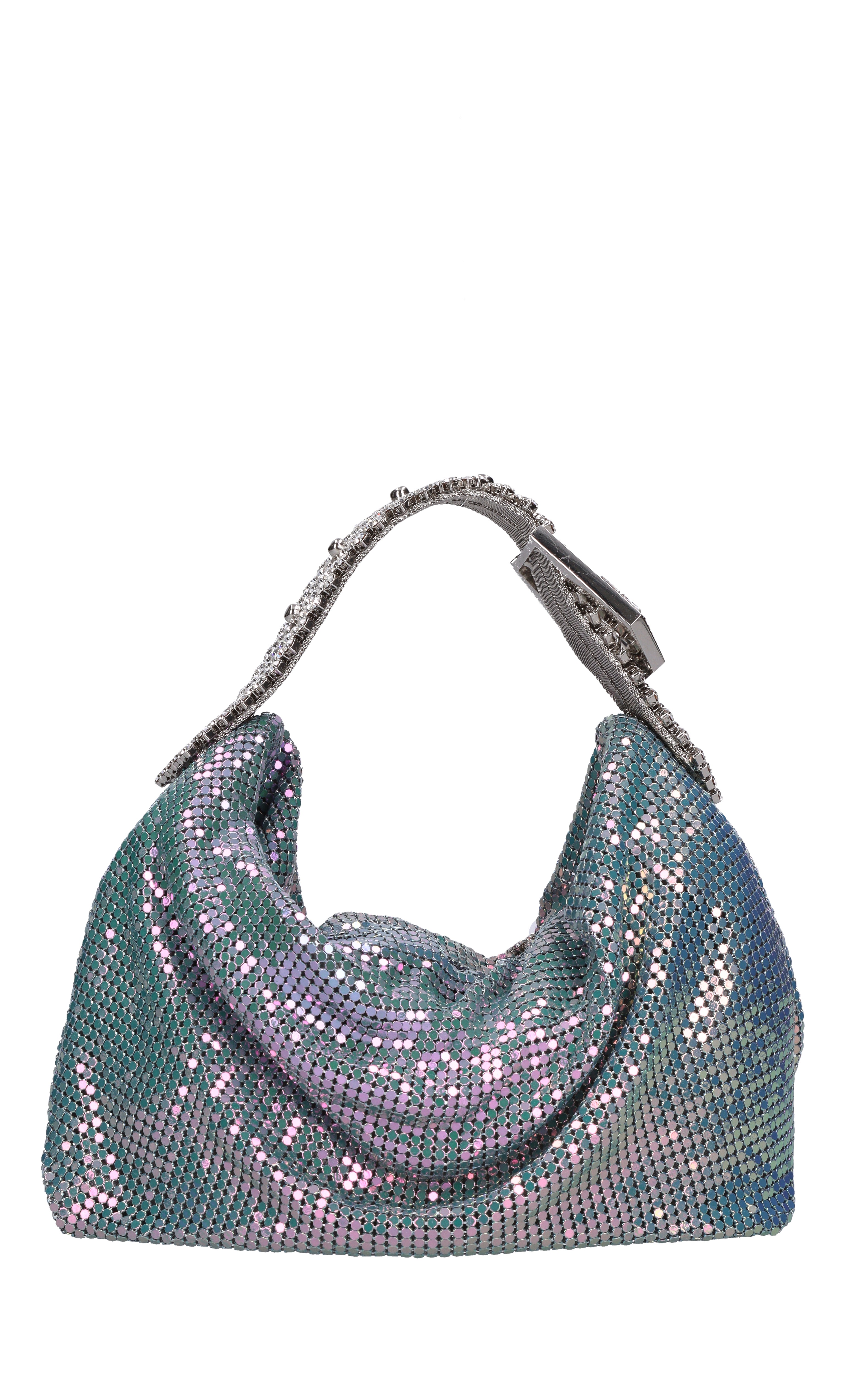 Borsa mini modello jill in maglia metallica. 1 Comparto. Chiusura con zip. Tracolla con strass rimovibile. Spedito su busta trasparente.
