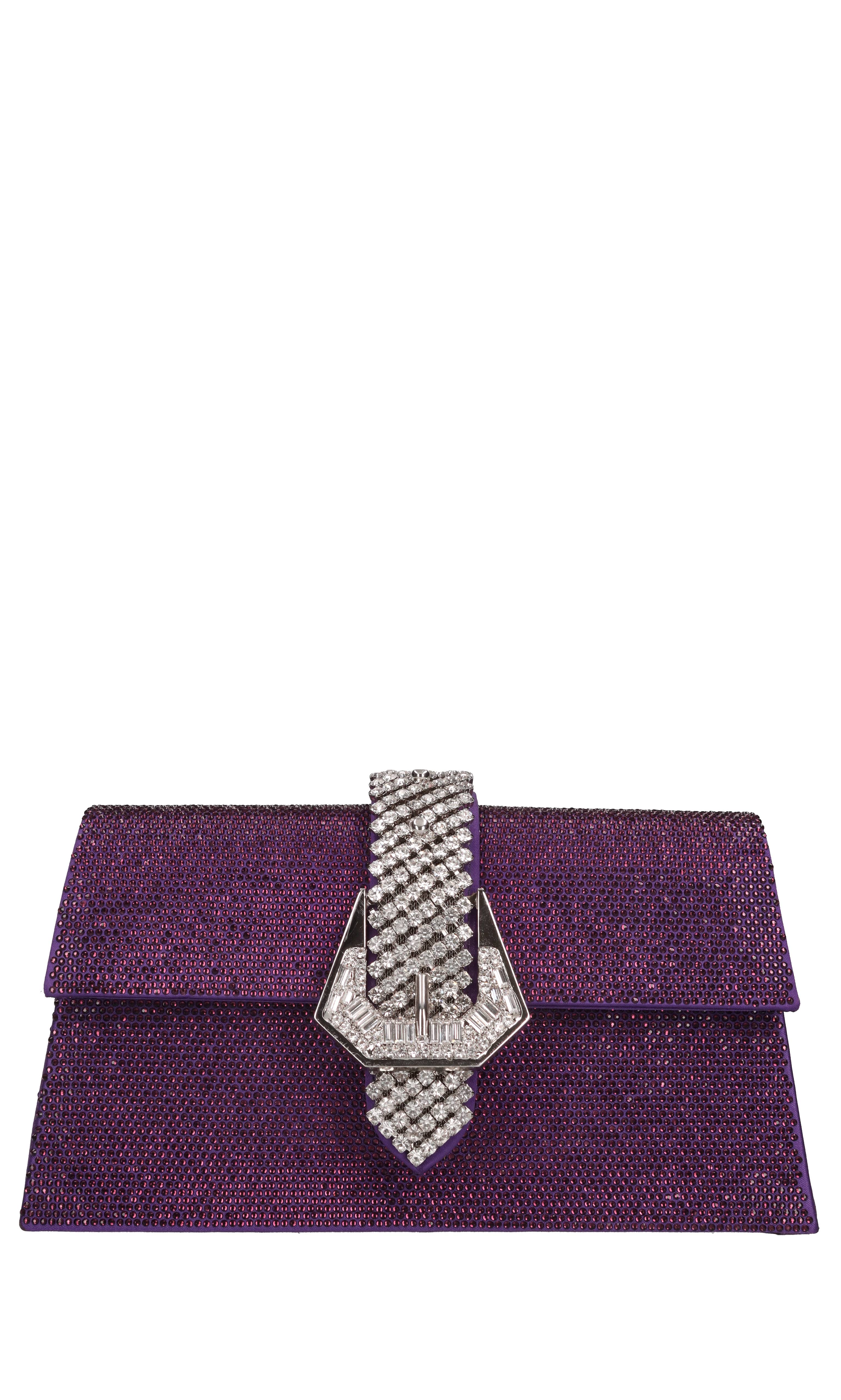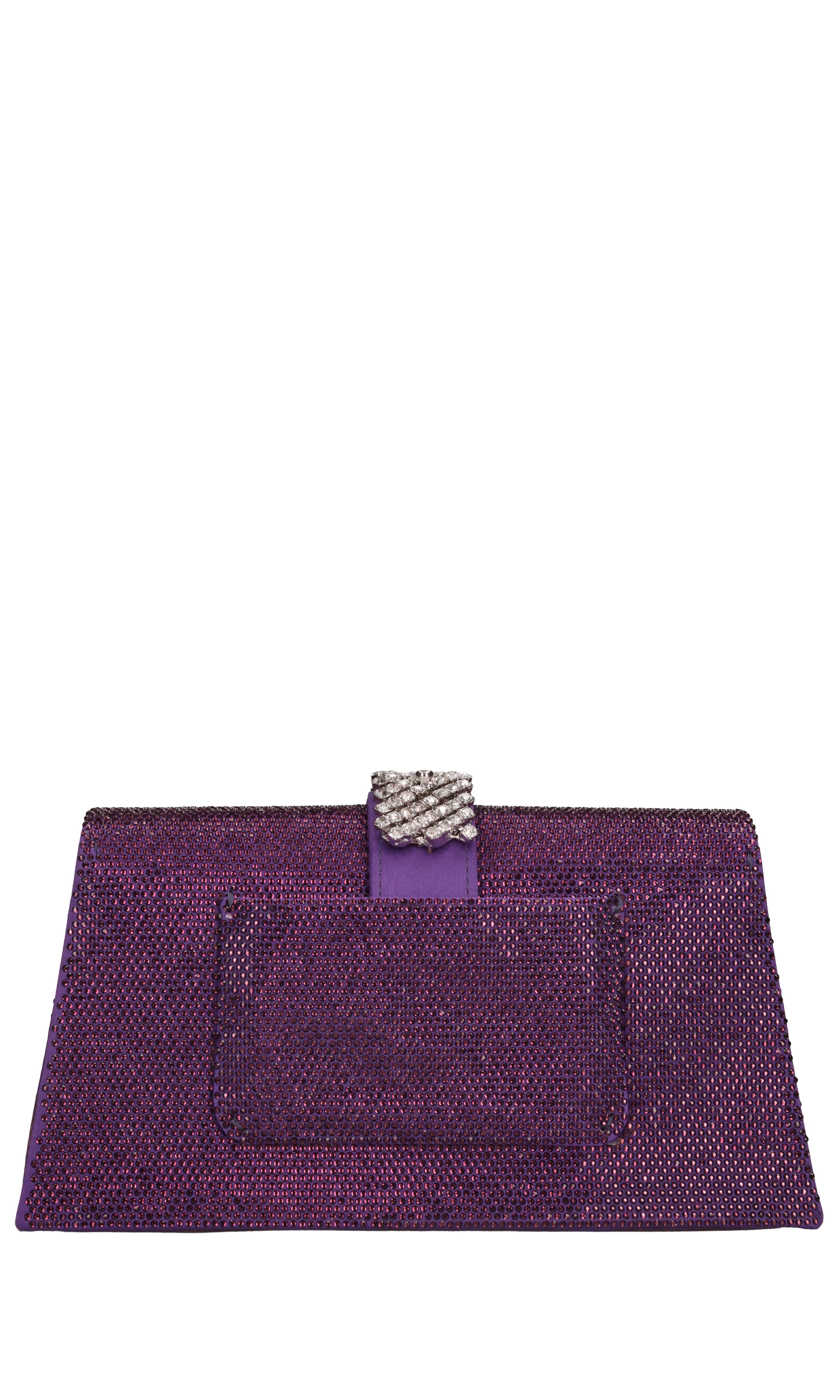 Borsa modello JADE in tessuto e strass. Chiusura con patta con bottone magnetico. Fibbia gioiello con strass. 1 Comparto. Tracolla in tessuto regolabile e removibile. Tasca posteriore esterna. Campionario.