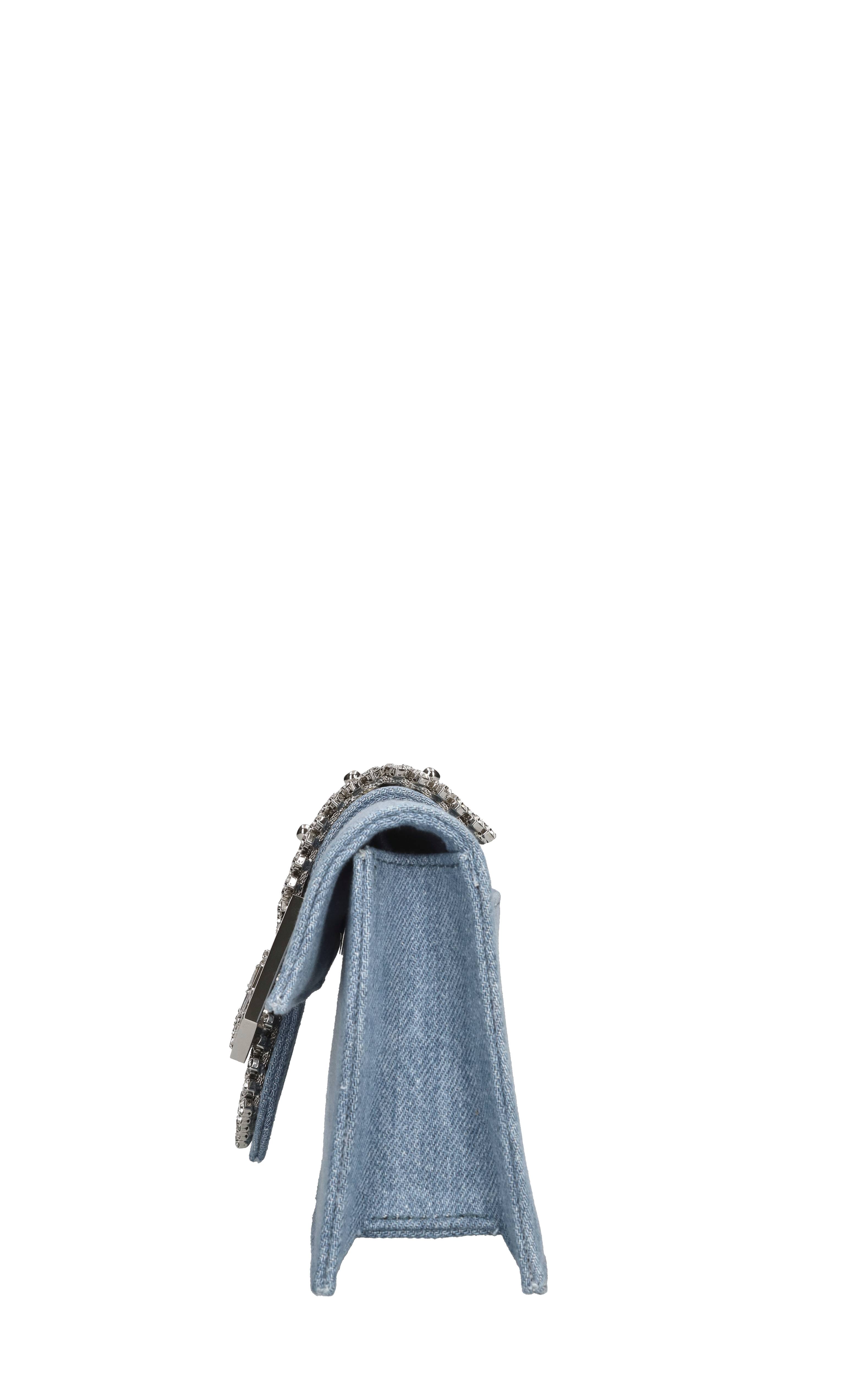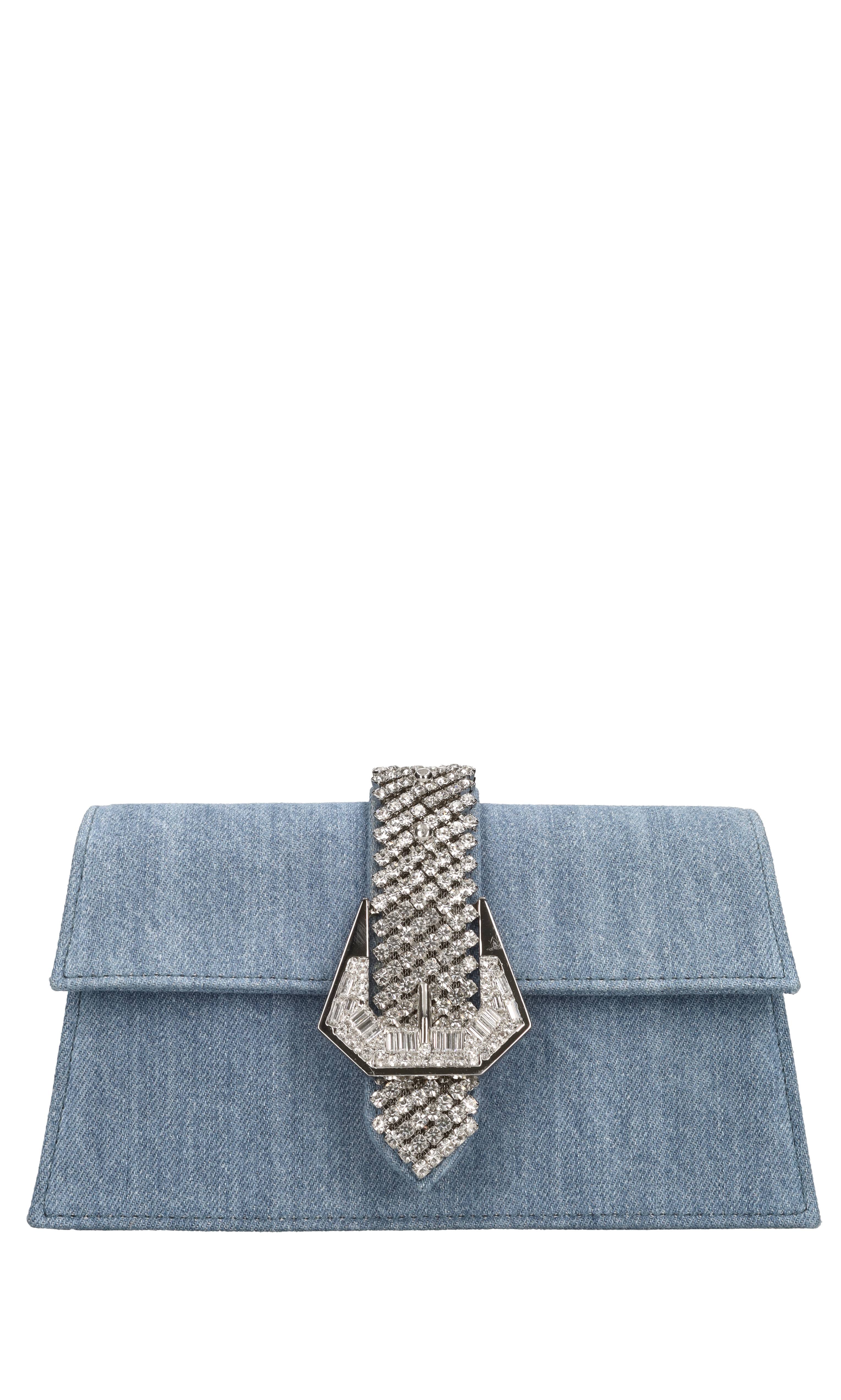 Borsa modello JADE in tessuto. Chiusura con patta con bottone magnetico. Fibbia gioiello con strass. 1 Comparto. Tracolla in tessuto regolabile e rimovibile. Tasca posteriore esterna. Campionario.