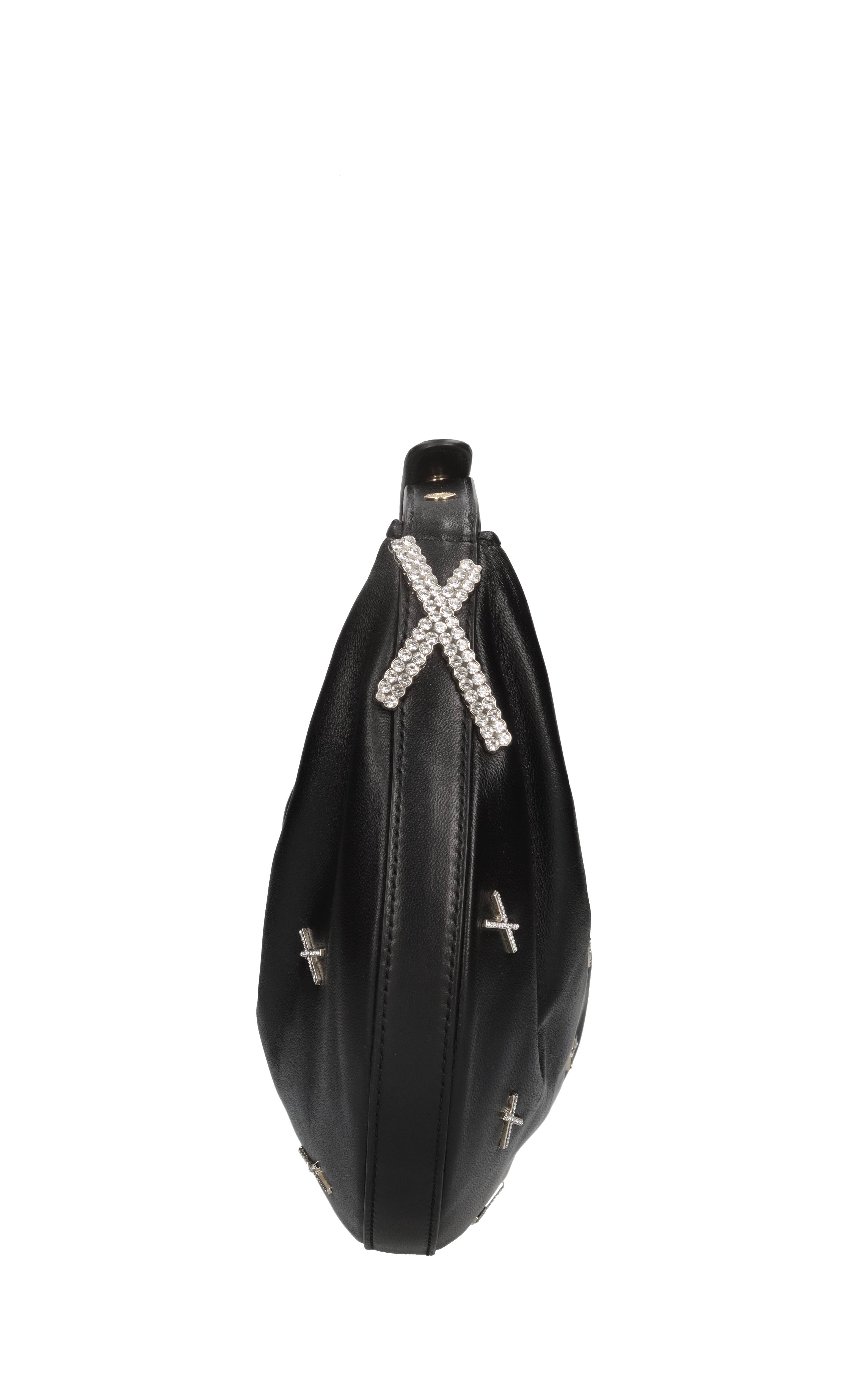Borsa in pelle e strass. 1 Comparto. Chiusura con zip. Manico regolabile. Tracolla in pelle rimovibile.
