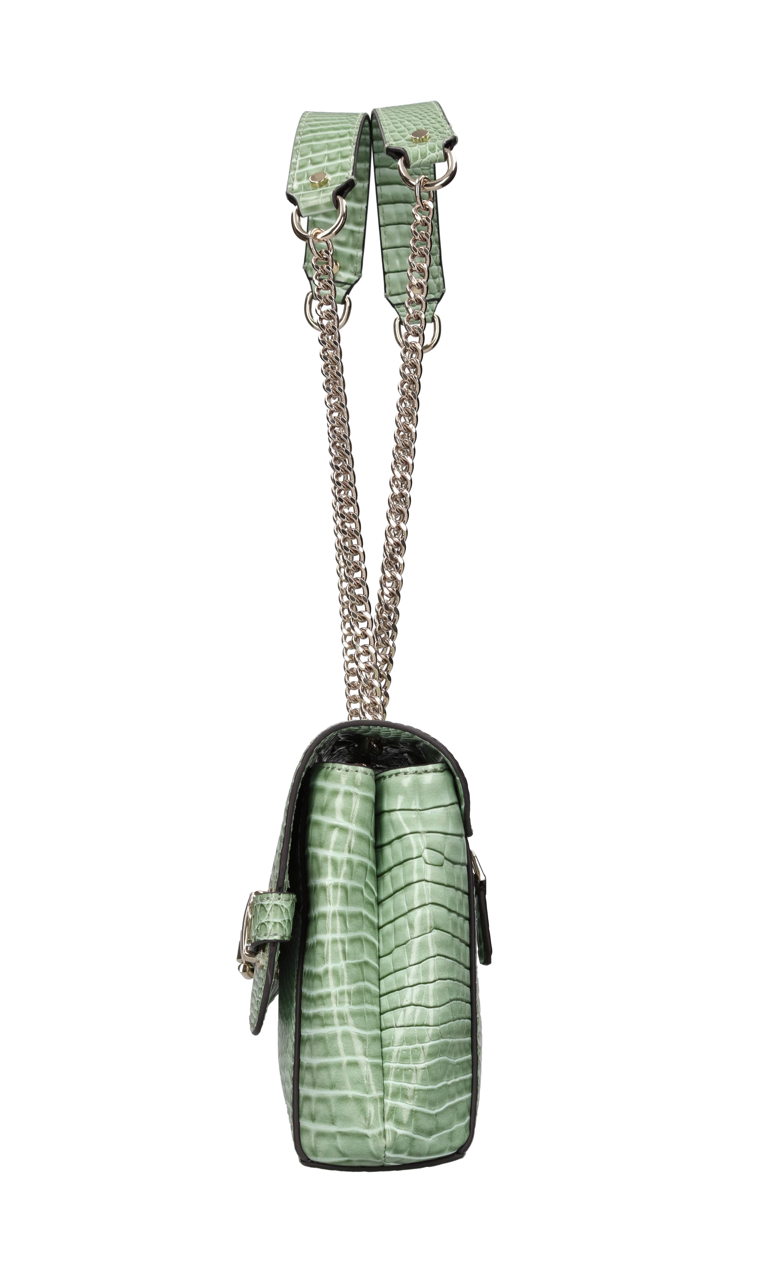 Borsa in ecopelle stampa cocco. 3 comparti di cui quello centrale con chiusura con zip. Chiusura con patta con bottone magnetico. 3 tasche interne di cui una con chiusura con zip. Tracolla in catena color oro ed ecopelle regolabile. Tasca posteriore esterna con chiusura con zip. Spedito su busta trasparente.
