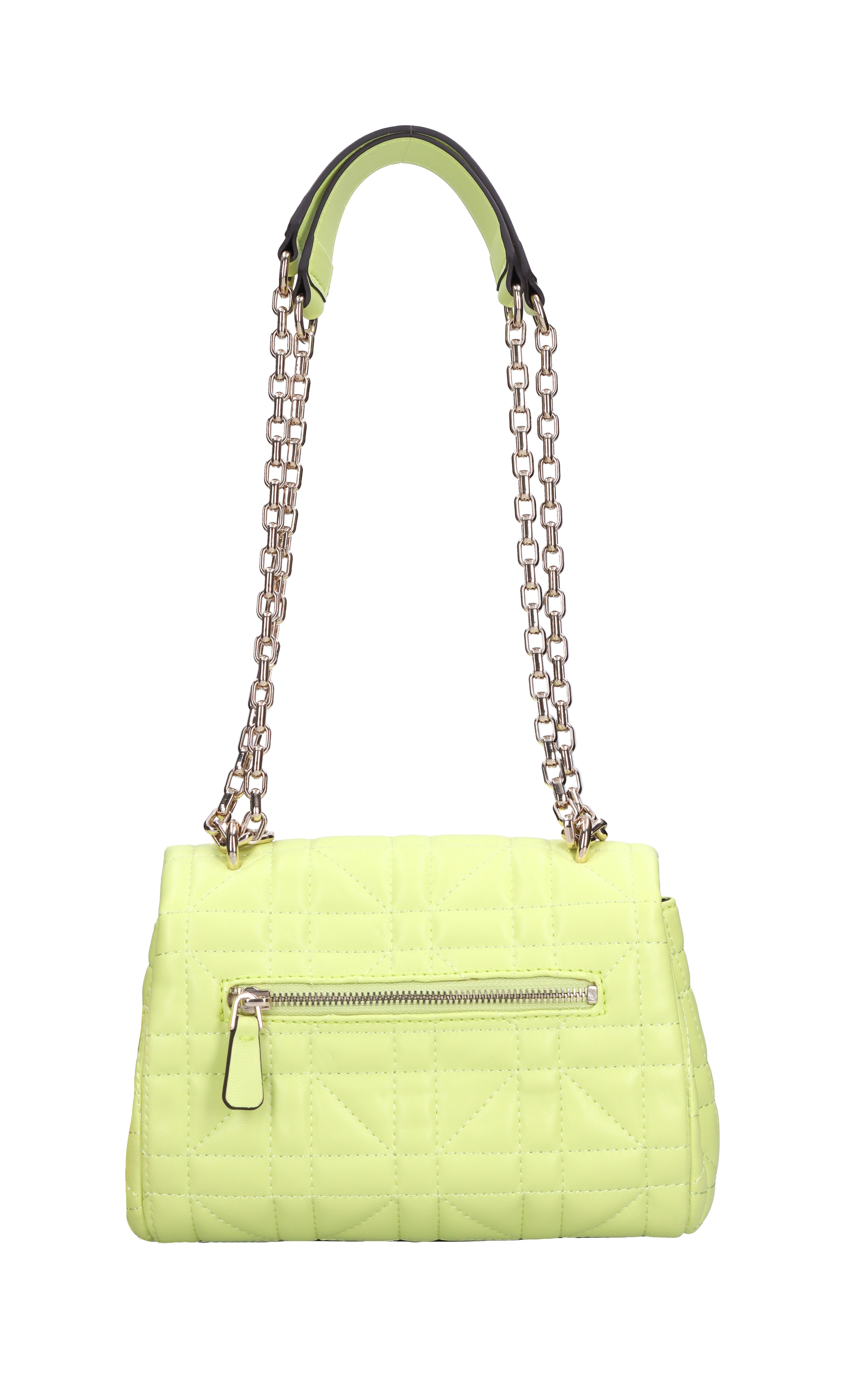 Borsa in ecopelle. Chiusura con patta e bottoni magnetici. 3 comparti. Tracolla a catena non regolabile. 1 Tasca posteriore con zip. Spedito su busta trasparente.