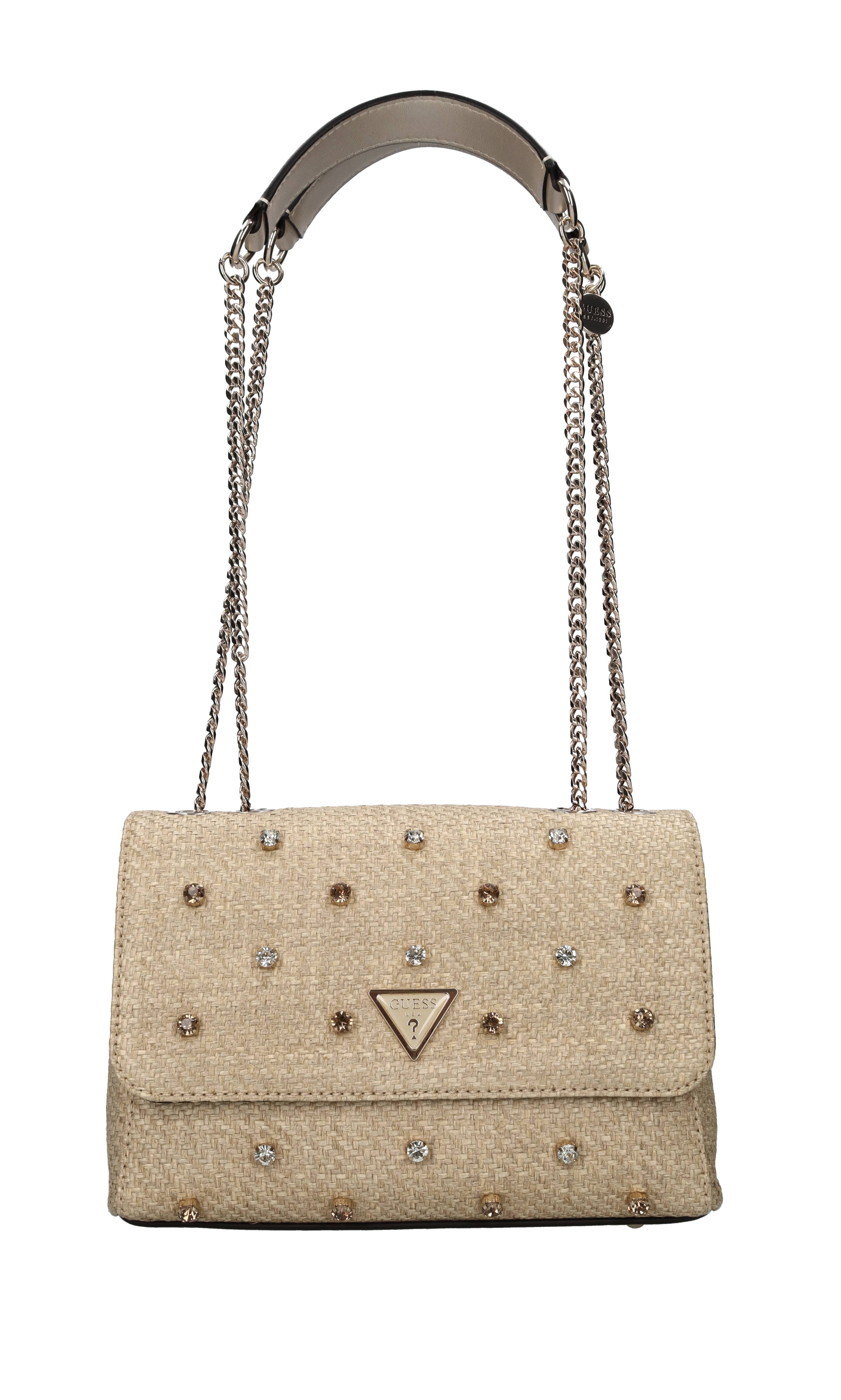 Borsa in rafia con applicazioni gioiello. 2 comparti. Chiusura con patta con 2 bottoni magnetici. 1 tasca interna con chiusura con zip e 6 taschine portacarte. Tracolla in catena color oro ed ecopelle. Spedito su bustina trasparente.
