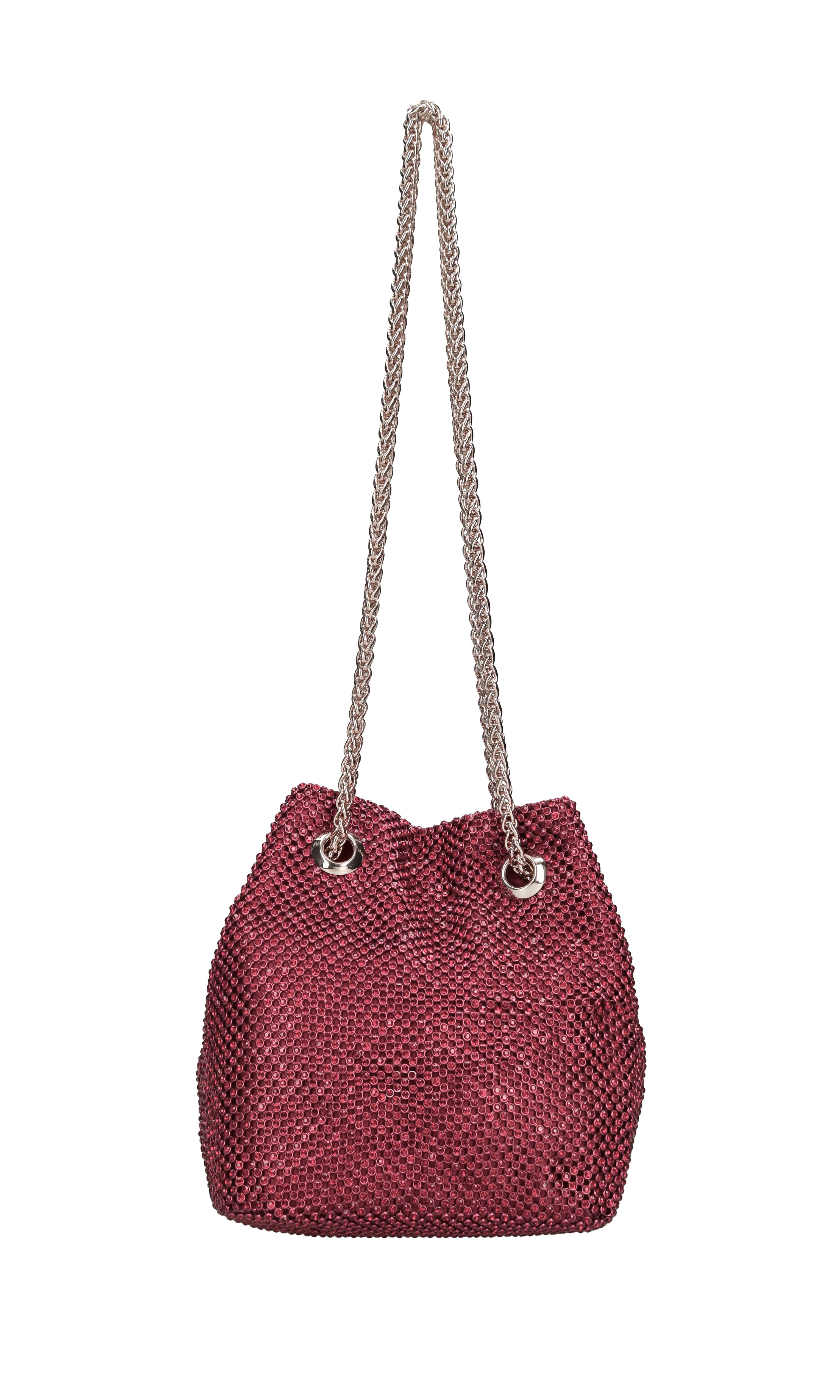 Borsa in tessuto e brillantini. 1 Comparto. Chiusura con bottone automatico. Tracolla silver chain non rimovibile. Spedito su bustina trasparente.