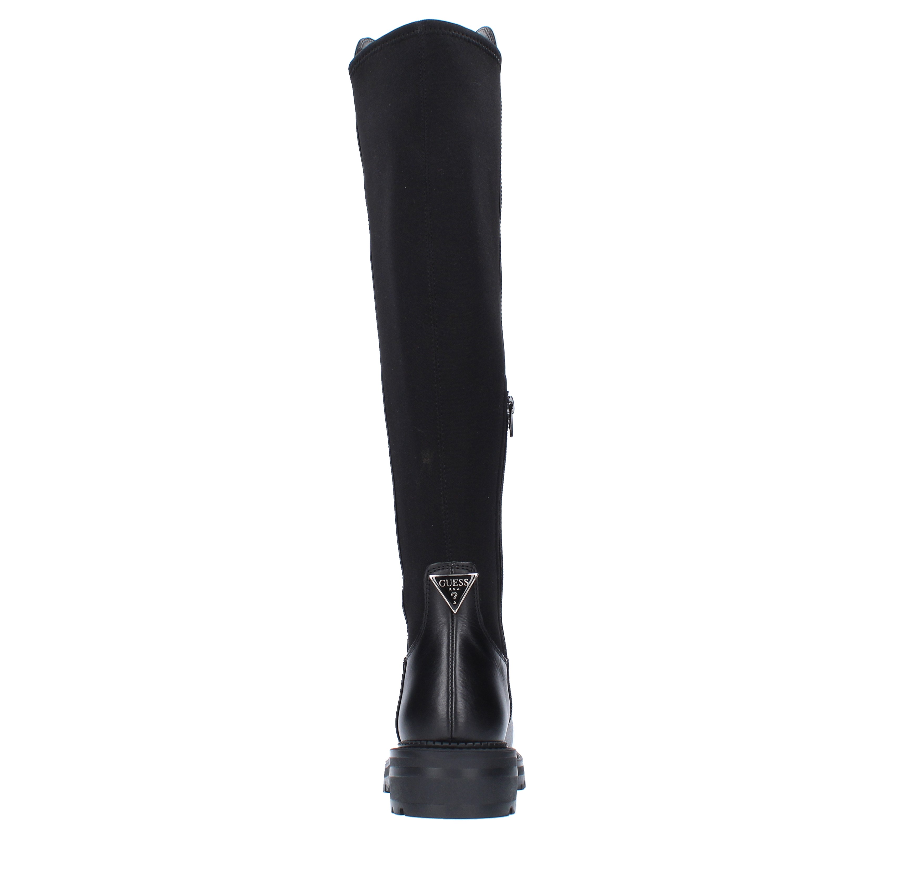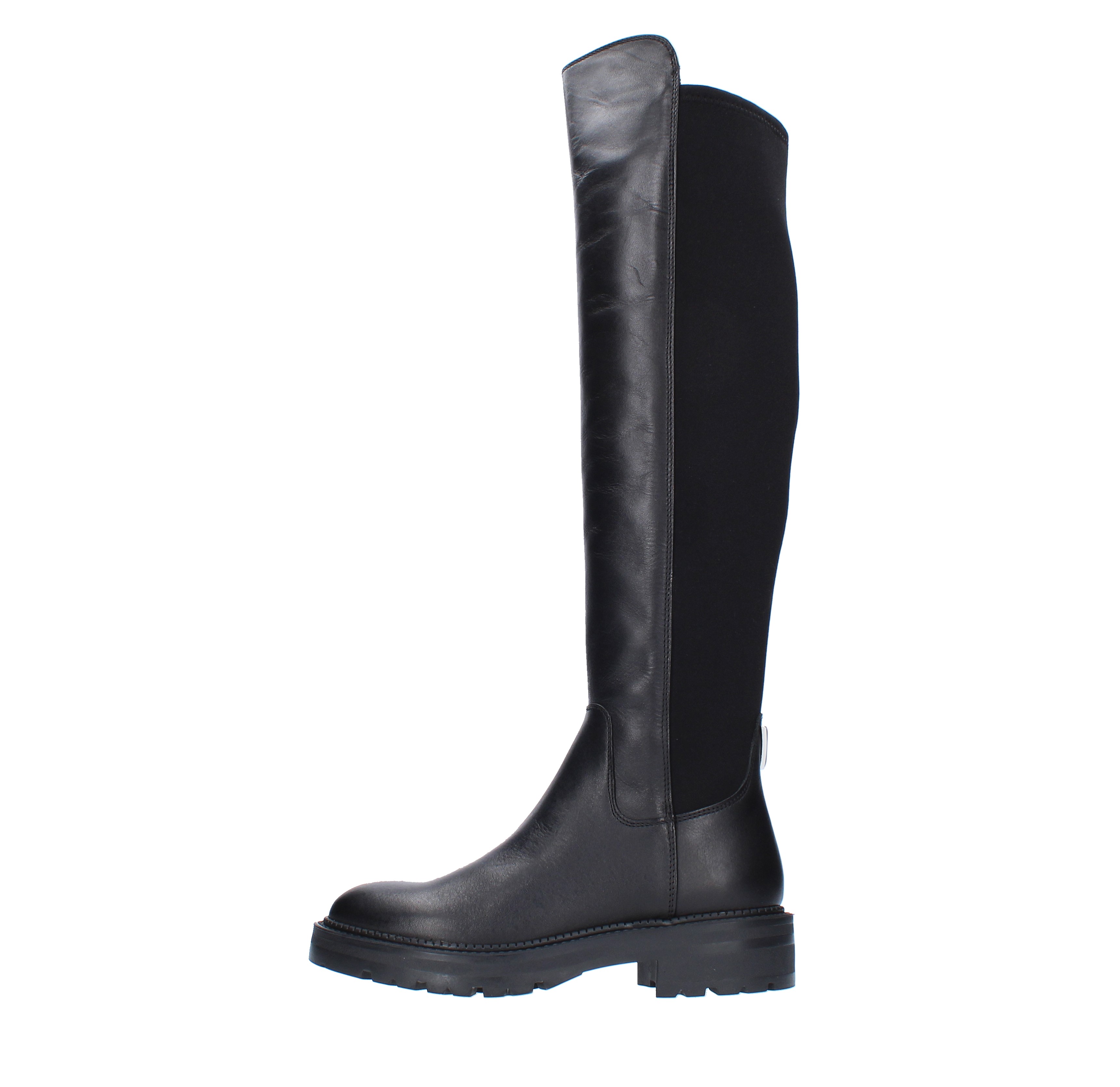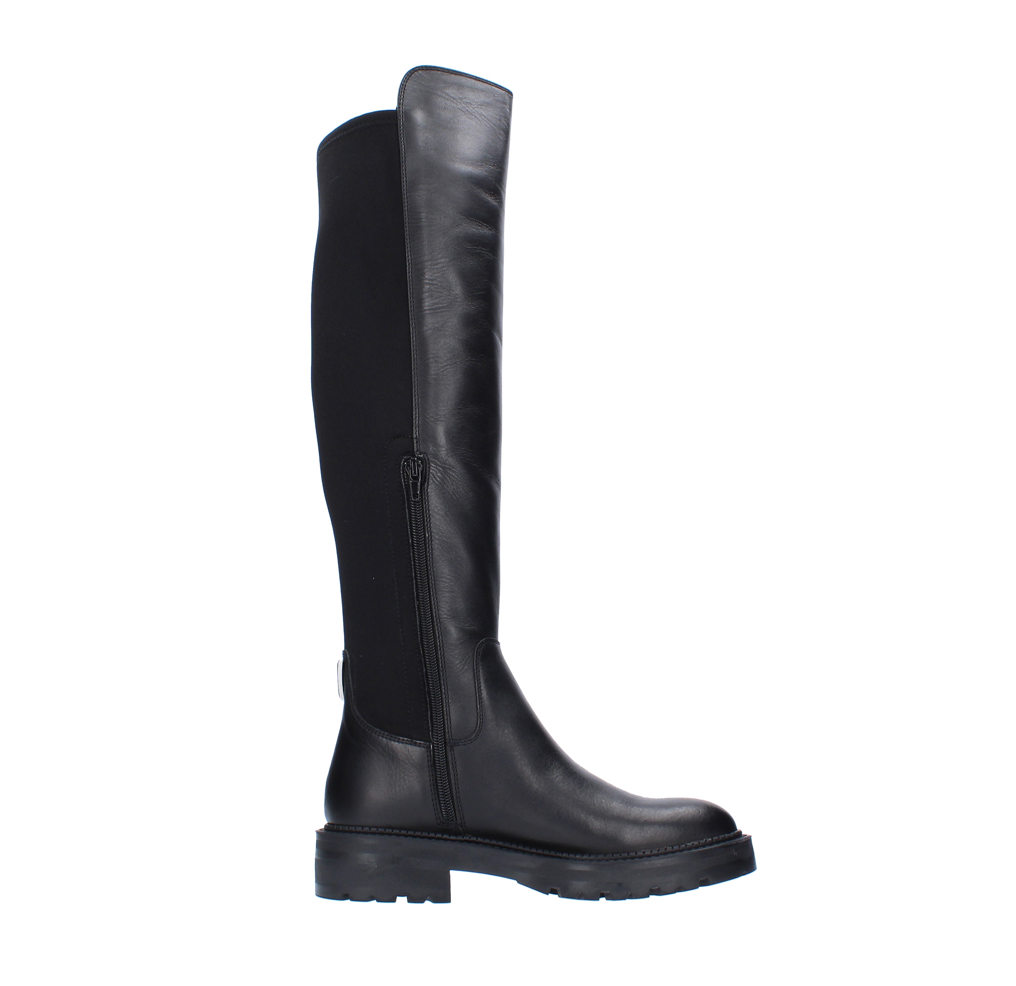 Stivali in pelle e tessuto elasticizzato. Zip laterale interna. Suola esterna in gomma. Tomaia interna in pelle.