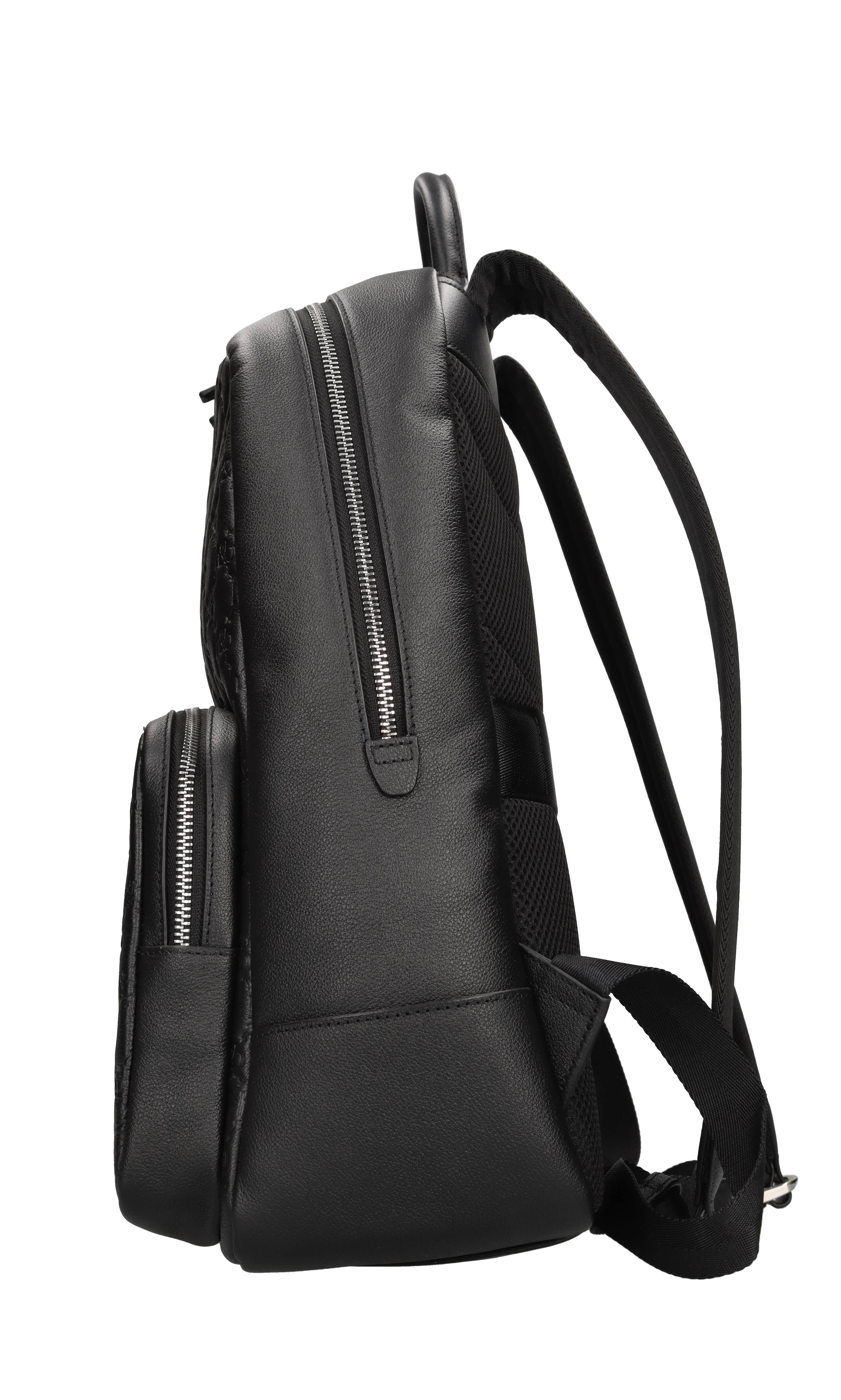 Zaino in pelle ed ecopelle. 1 Comparto. 1 Tasca. Chiusura con zip. Porta PC. Sistema d'ancoraggio ai trolley. Spedito su bustina trasparente.