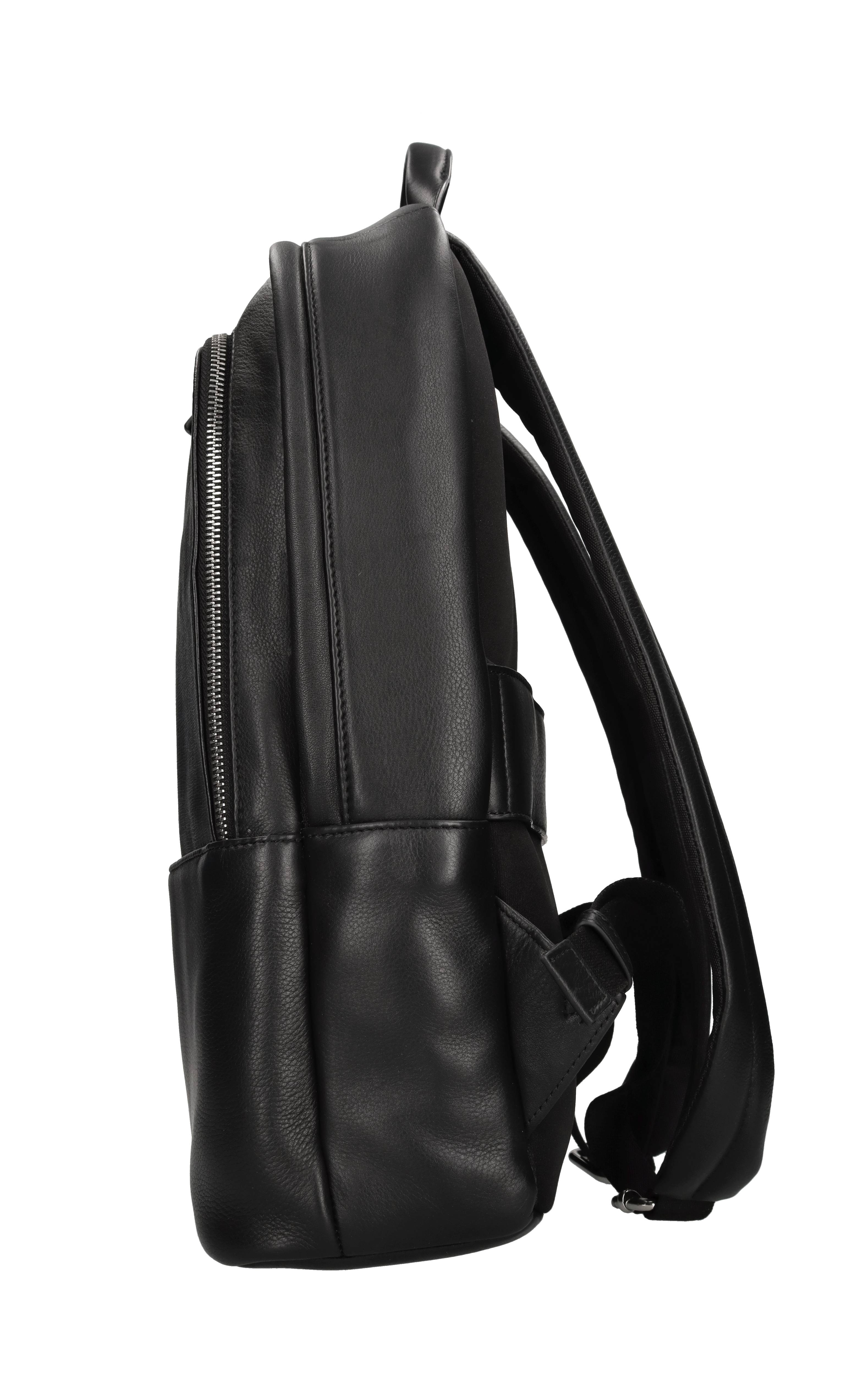 Zaino in pelle. Chiusura con zip. 1 scomparti. 1 tasca anteriore con chiusura con zip. 1 tasca anteriore con chiusura con bottone automatico. 1 tasca posteriore con chiusura con zip. Fascia sistema d'ancoraggio al trolley.
