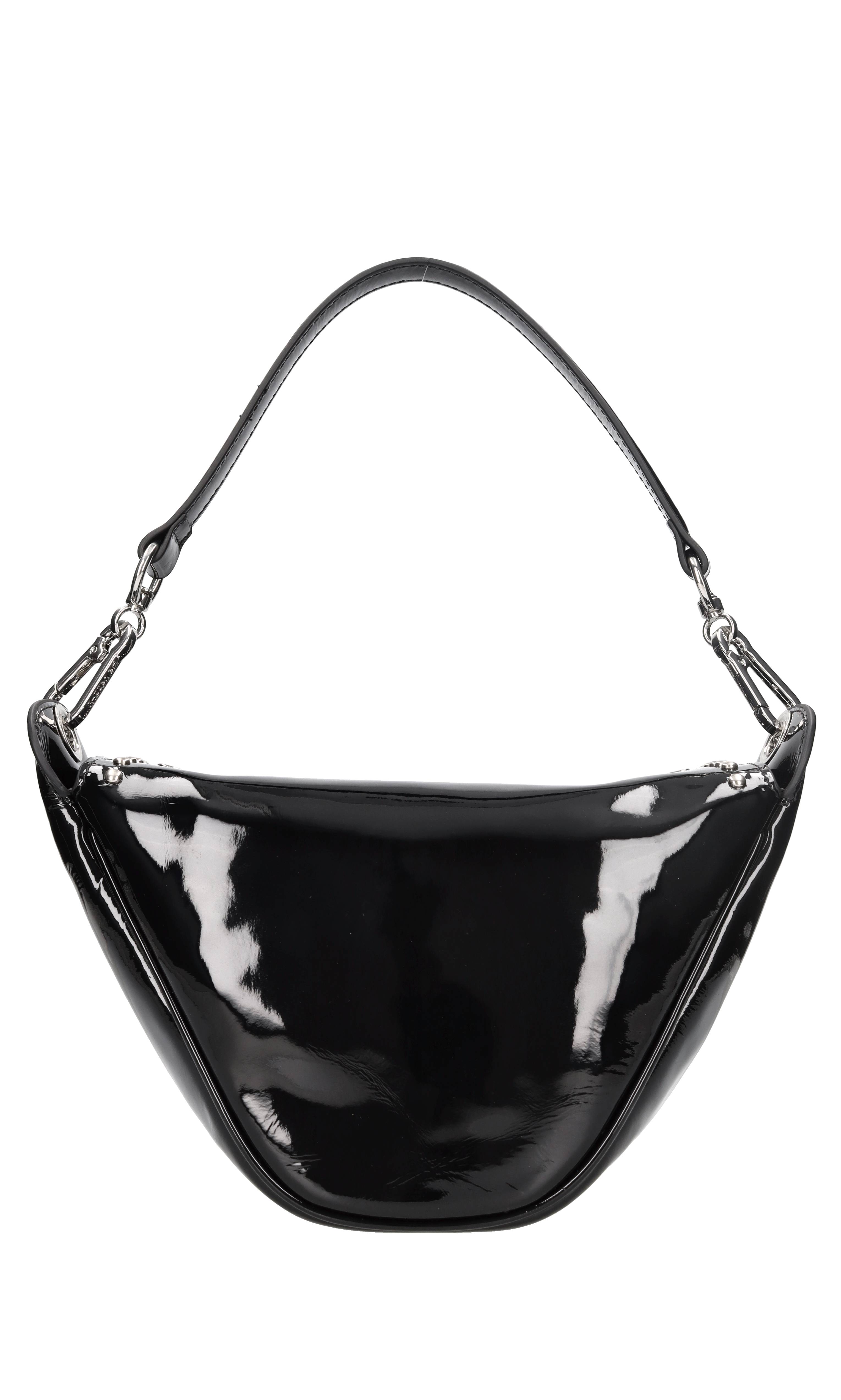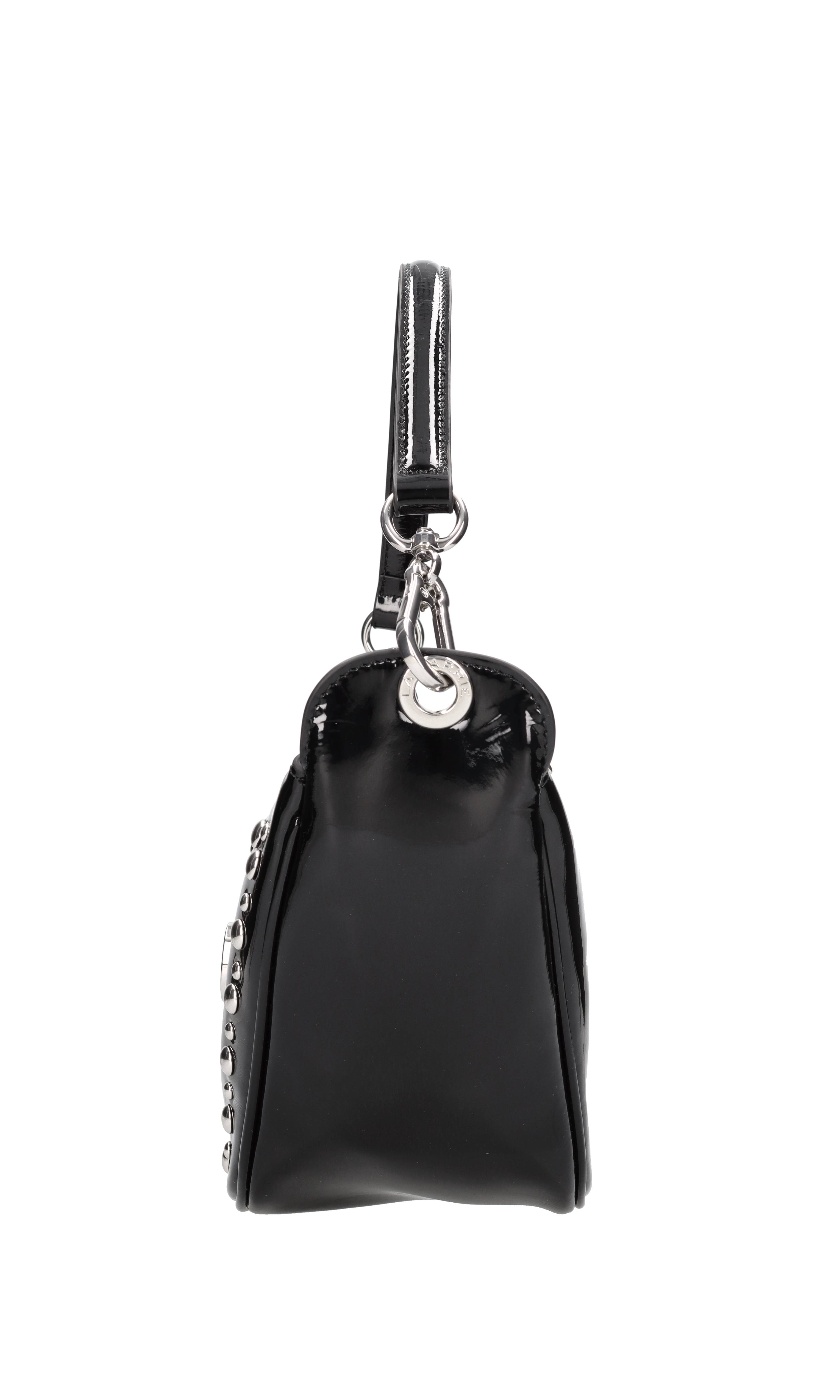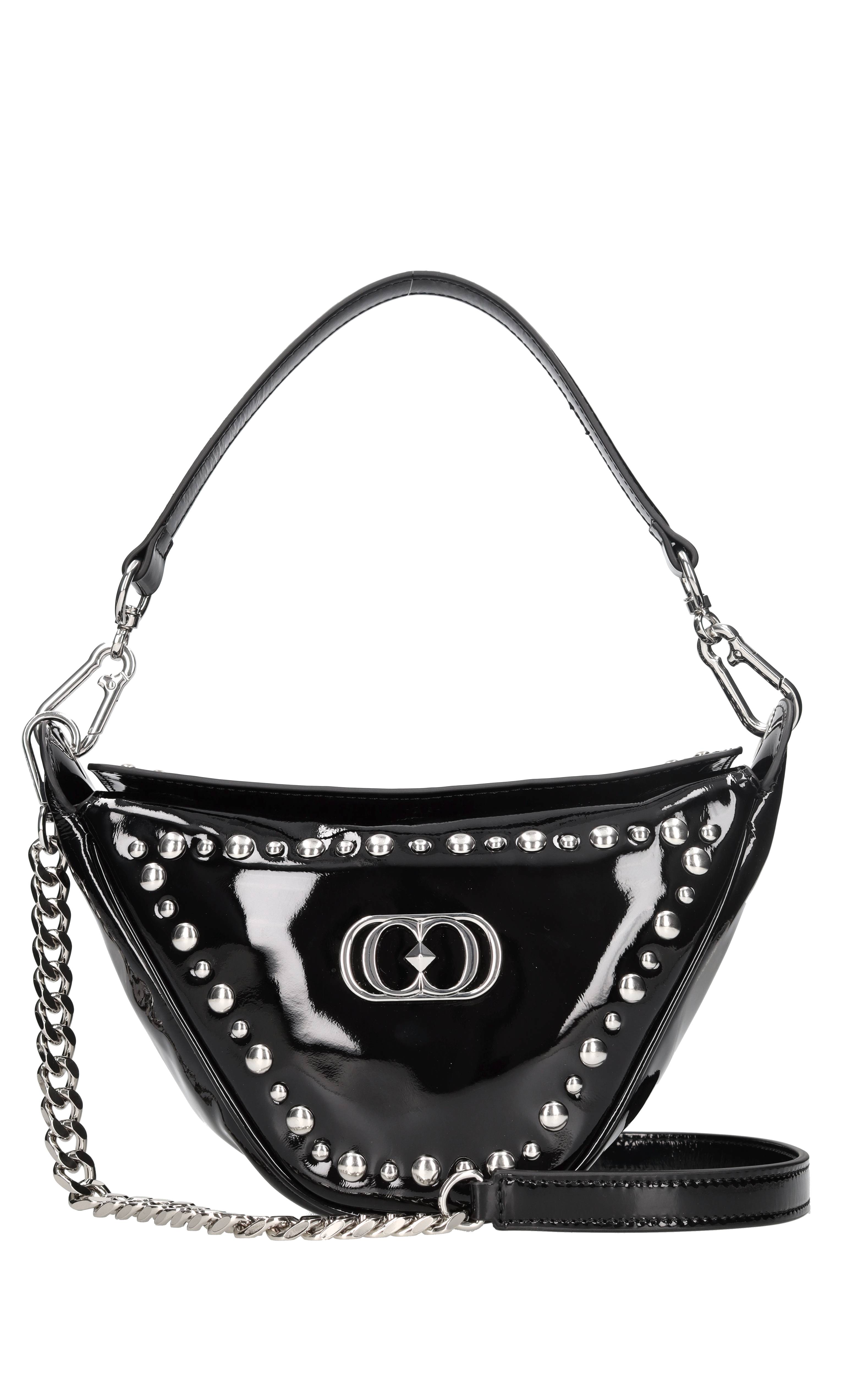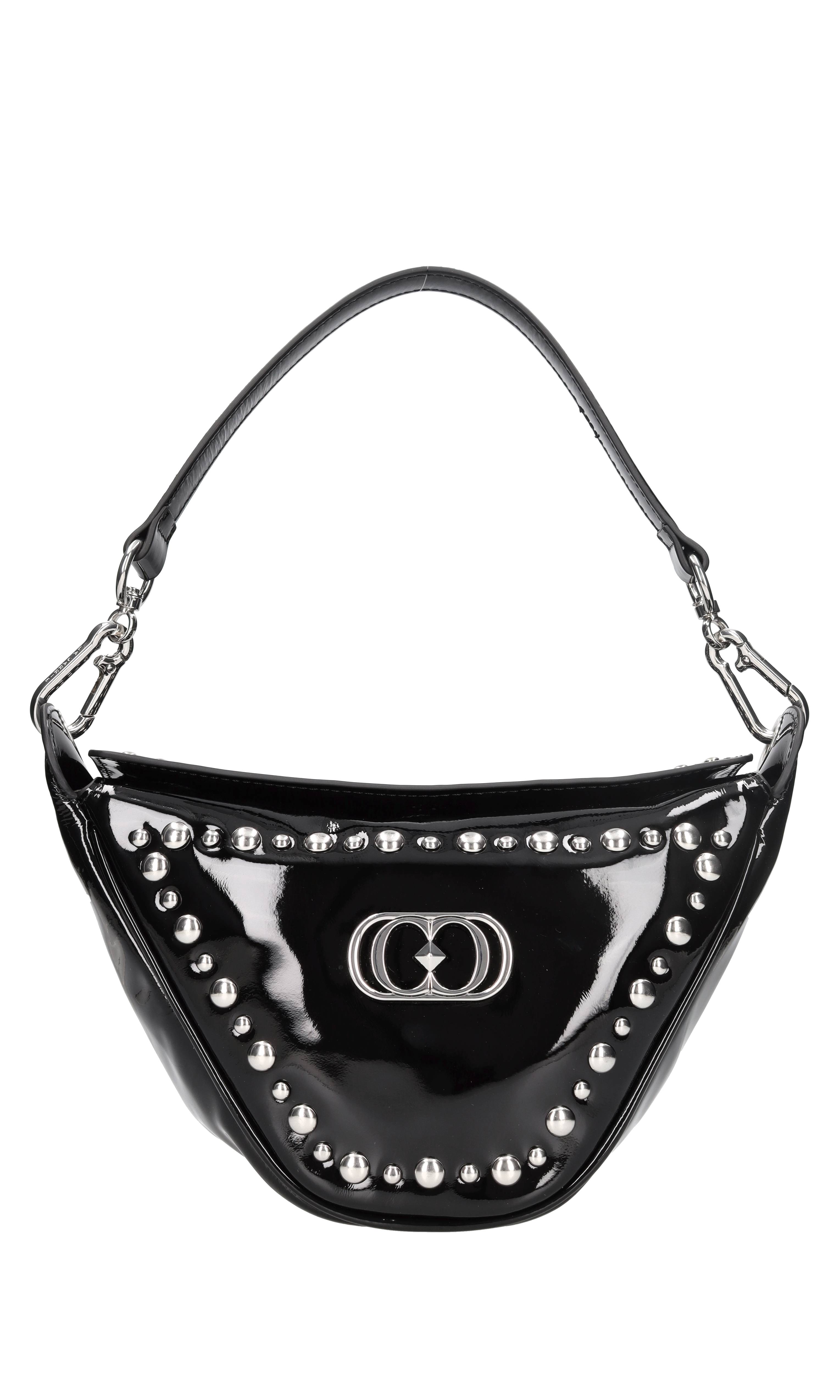 Borsa in vernice e borchie. Un comparto. Chiusura magnetica. Tracolla rimovibile.