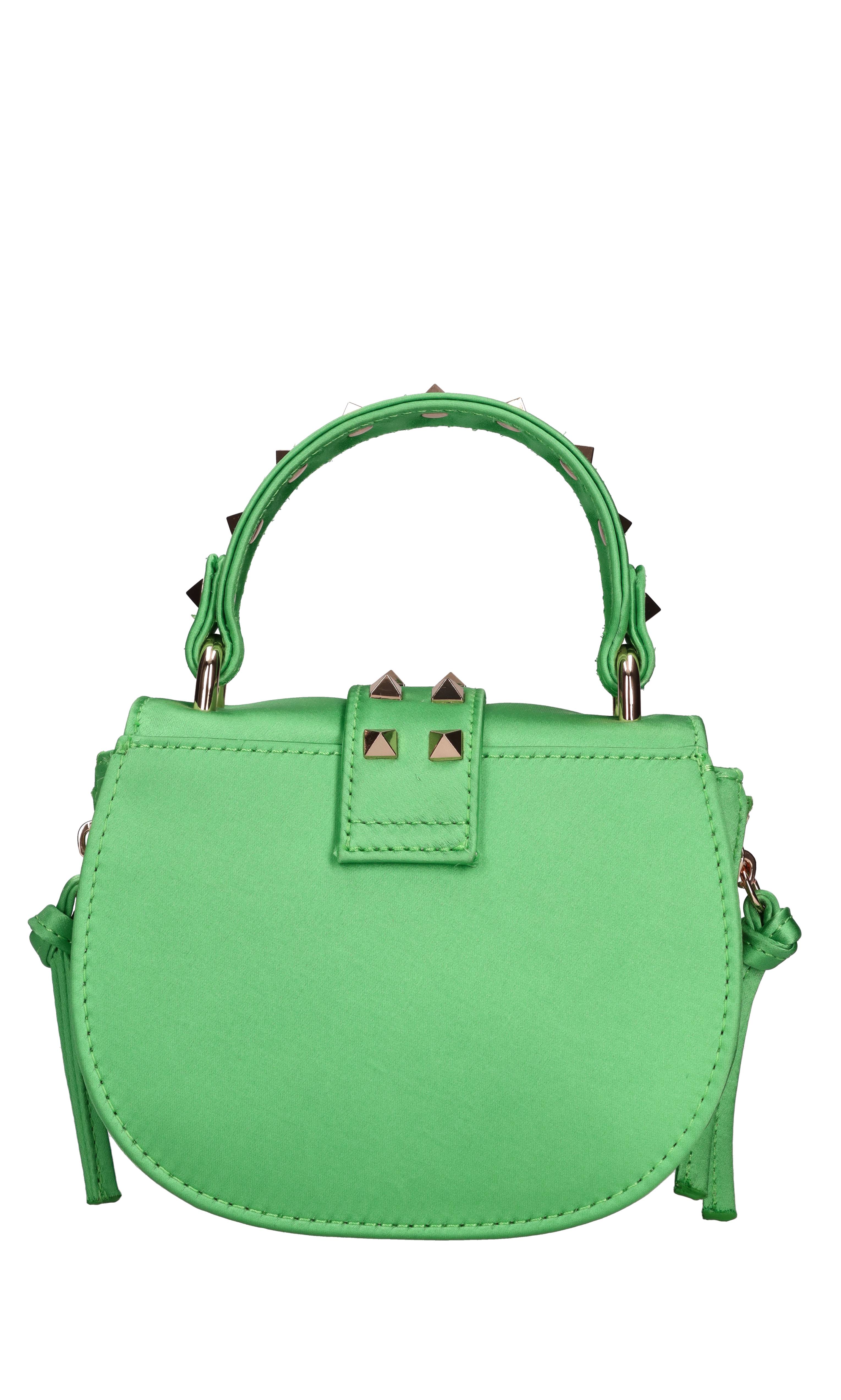 Borsa mini Thunder in seta. Un comparto. Micro borchie decorative. Tracolla golden chain e seta removibile. Chiusura a scatto.