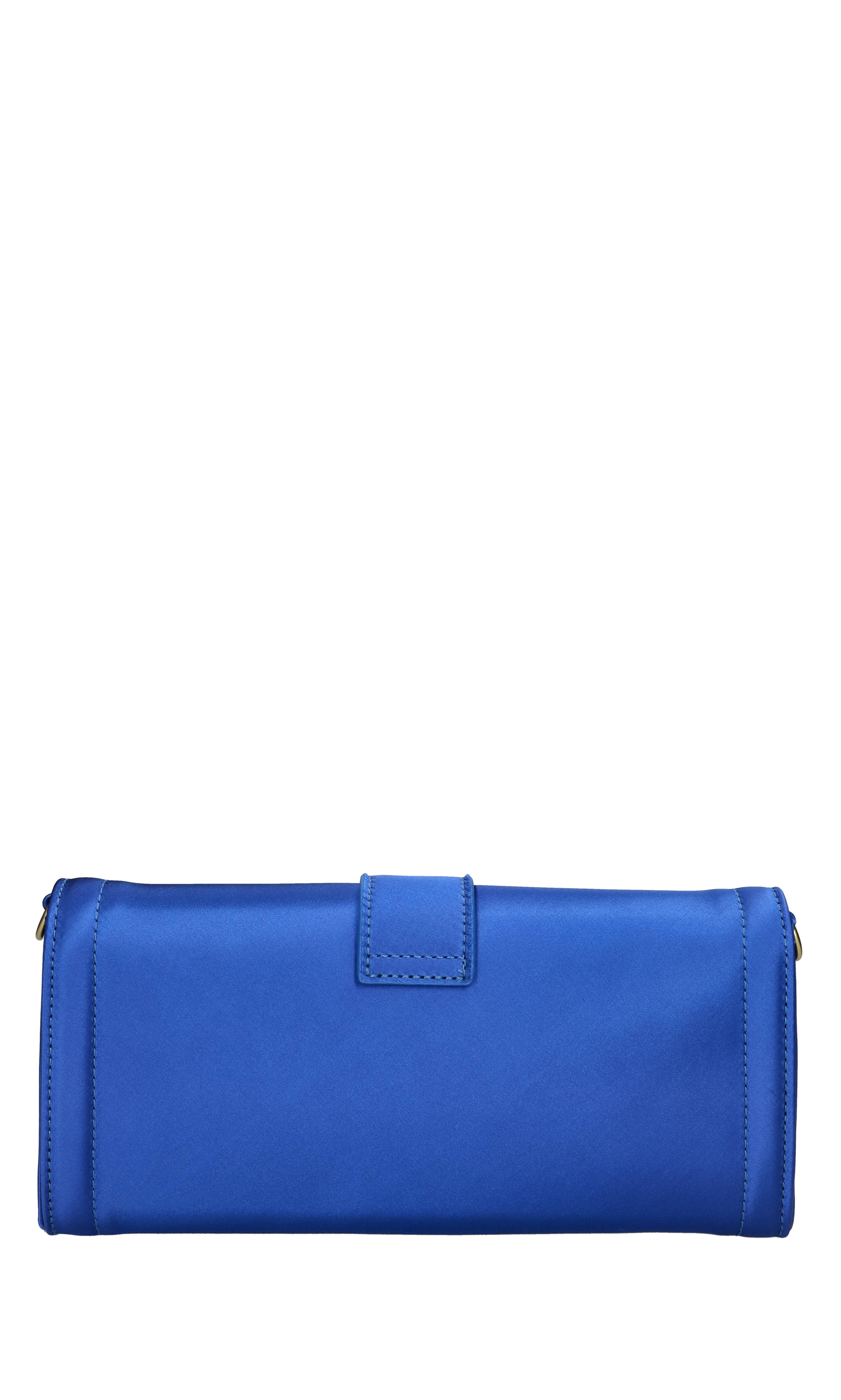 Borsa Night Ed. in raso. Decorata con strass. Un comparto. Chiusura con bottone automatico. Tracolla golden chain removibile.