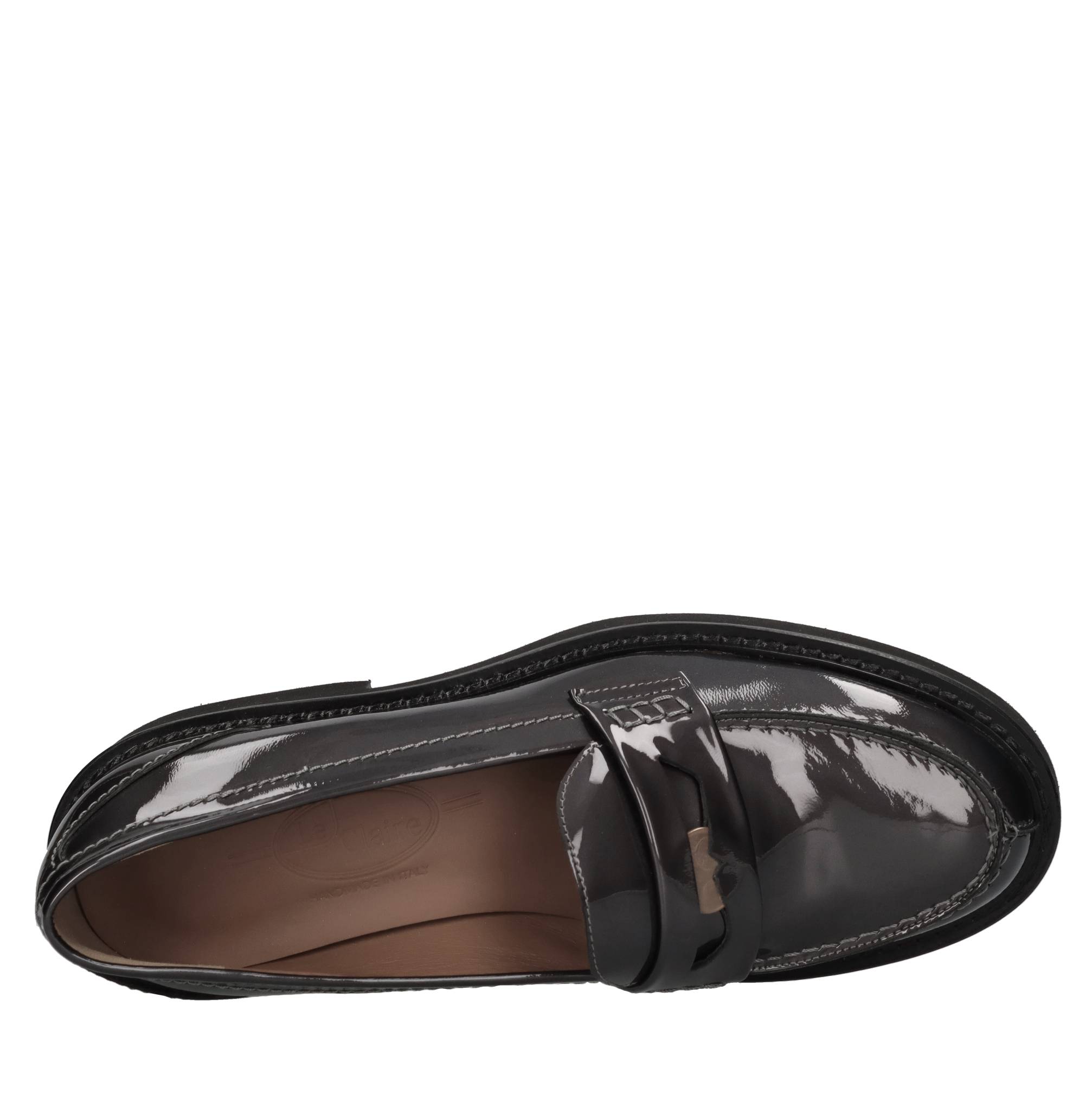 Mocassini in vernice. Tomaia interna in pelle. Suola esterna in gomma e cuoio.