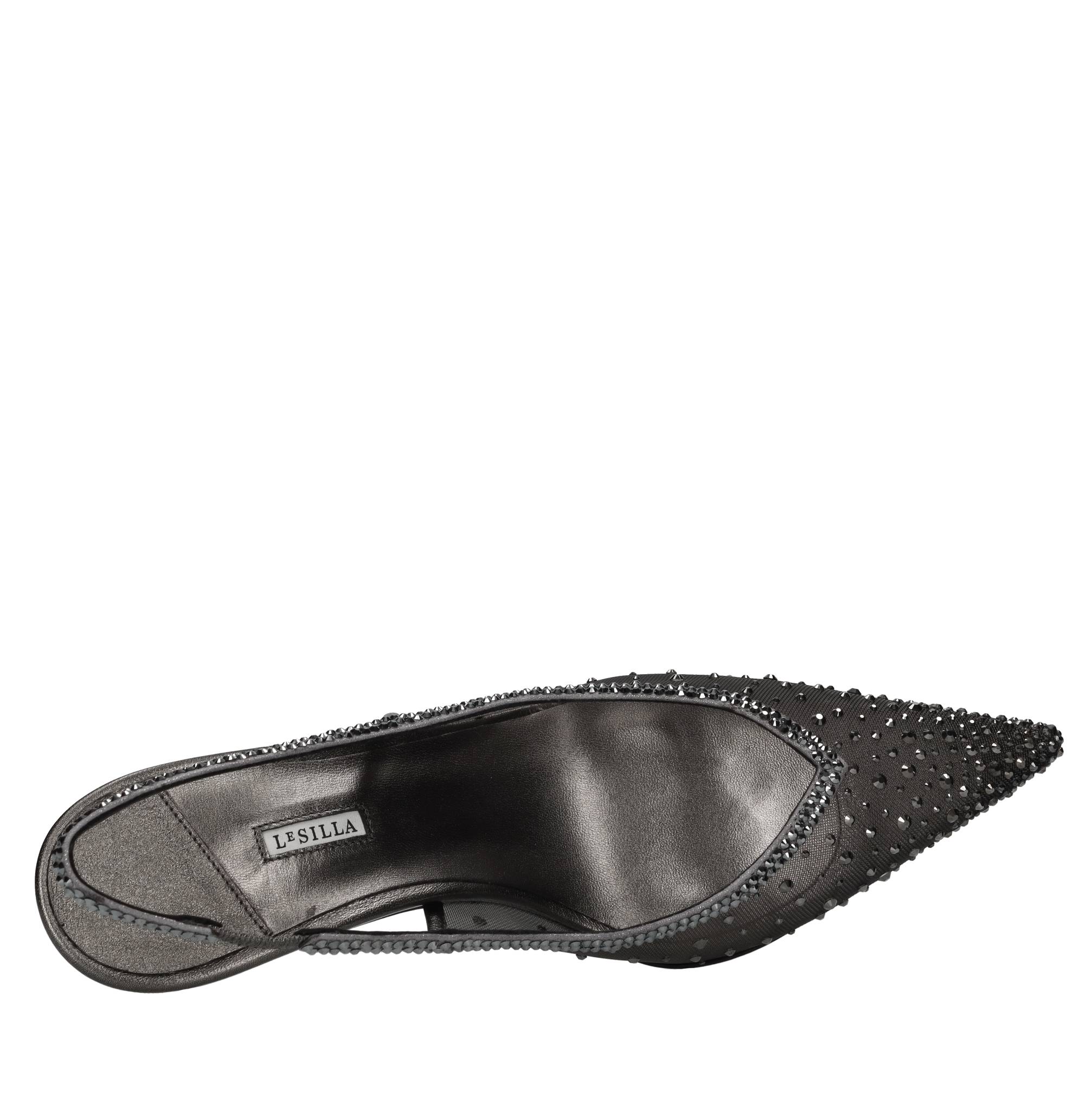 Décolleté Slingback Nicole in pelle rete e strass. Tomaia interna in rete e pelle. Suola esterna in cuoio con inserto in gomma. Nicole reinterpreta l'eleganza con un tocco di luce. La silhouette impreziosita da una pioggia di cristalli applicati sulla punta, lungo il bordo e sul retro, creano un gioco di riflessi che accompagna ogni movimento.