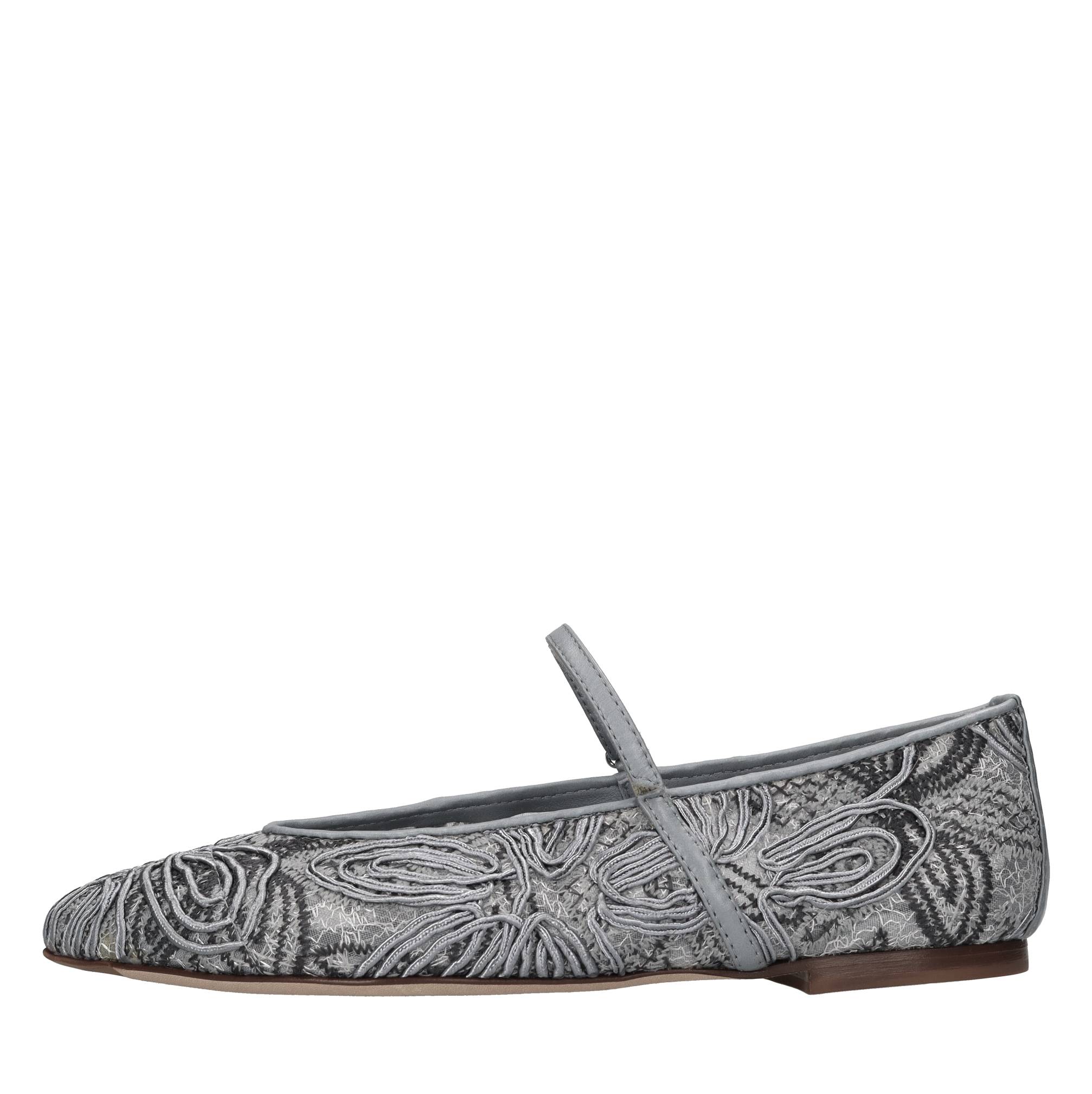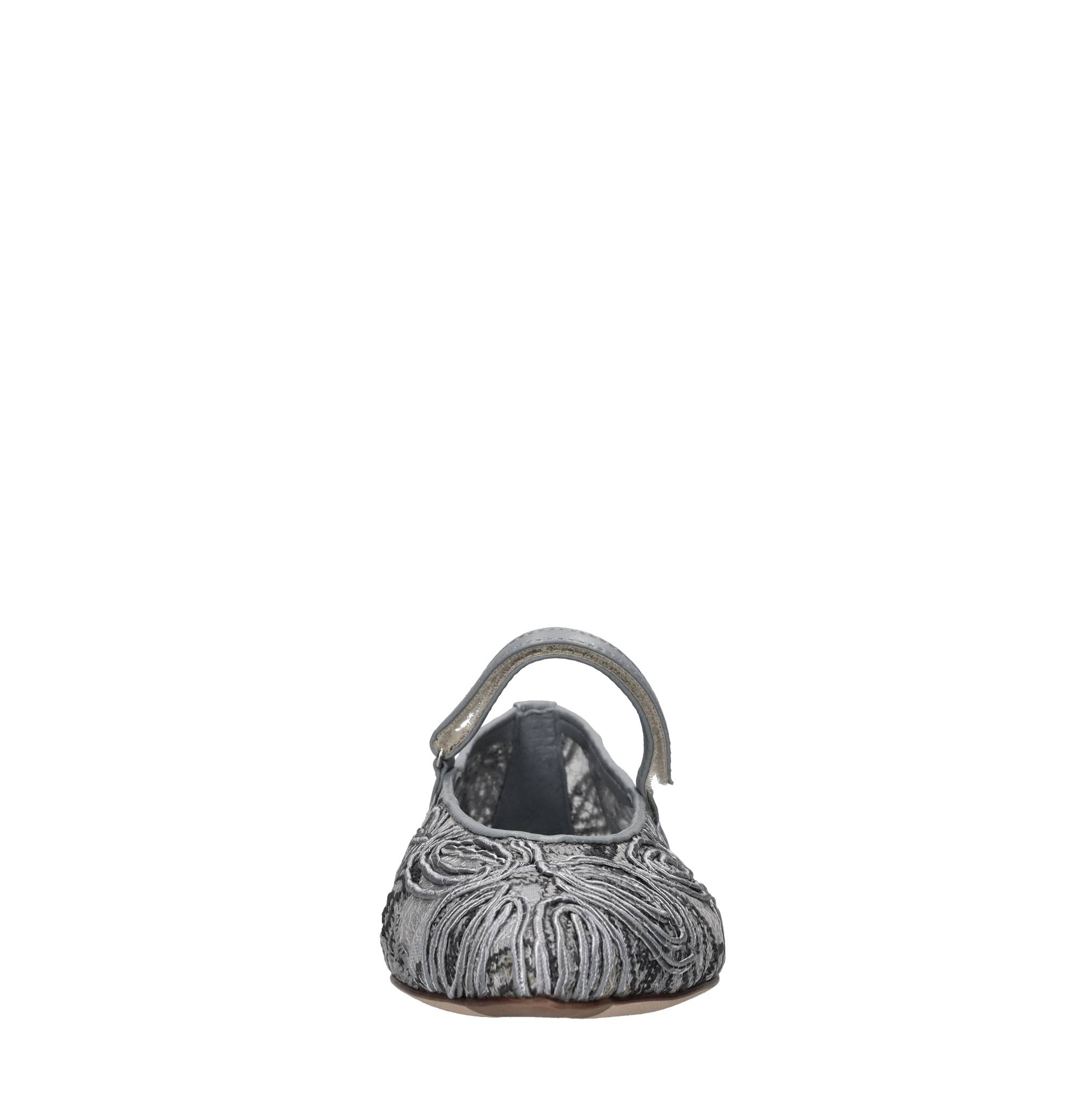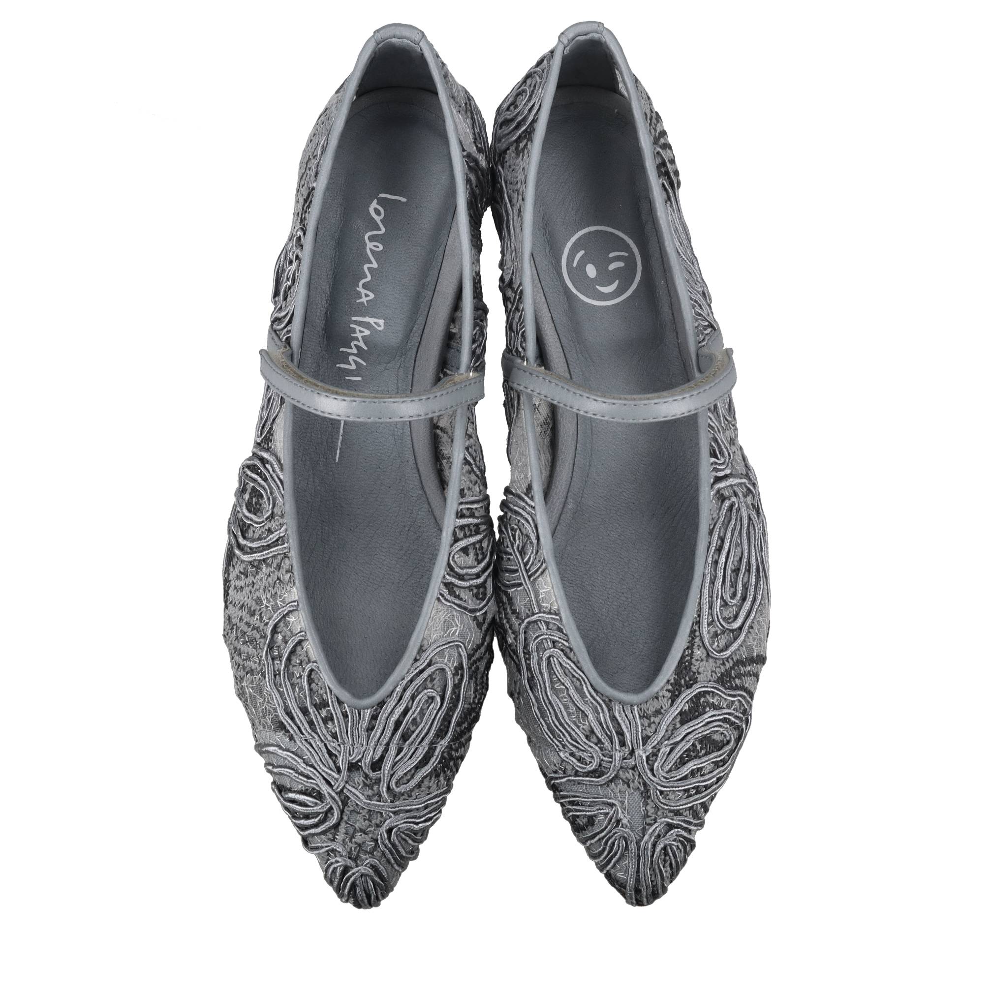 Ballerine in pelle e tessuto. Tomaia interna in pelle. Suola esterna in cuoio con inserto in gomma antiscivolo.