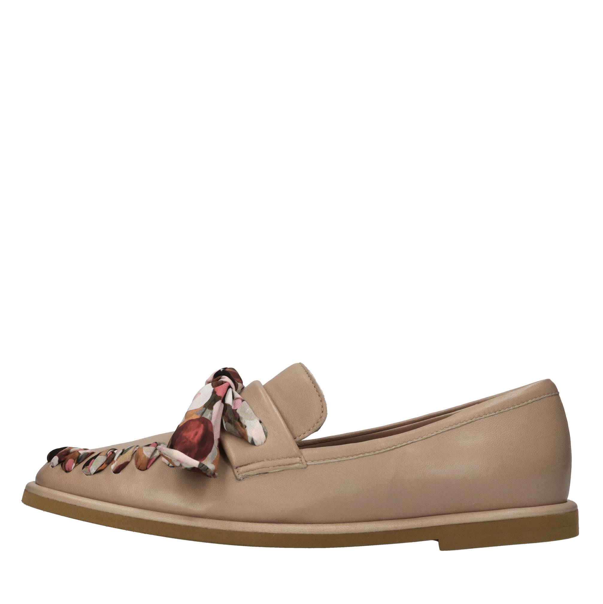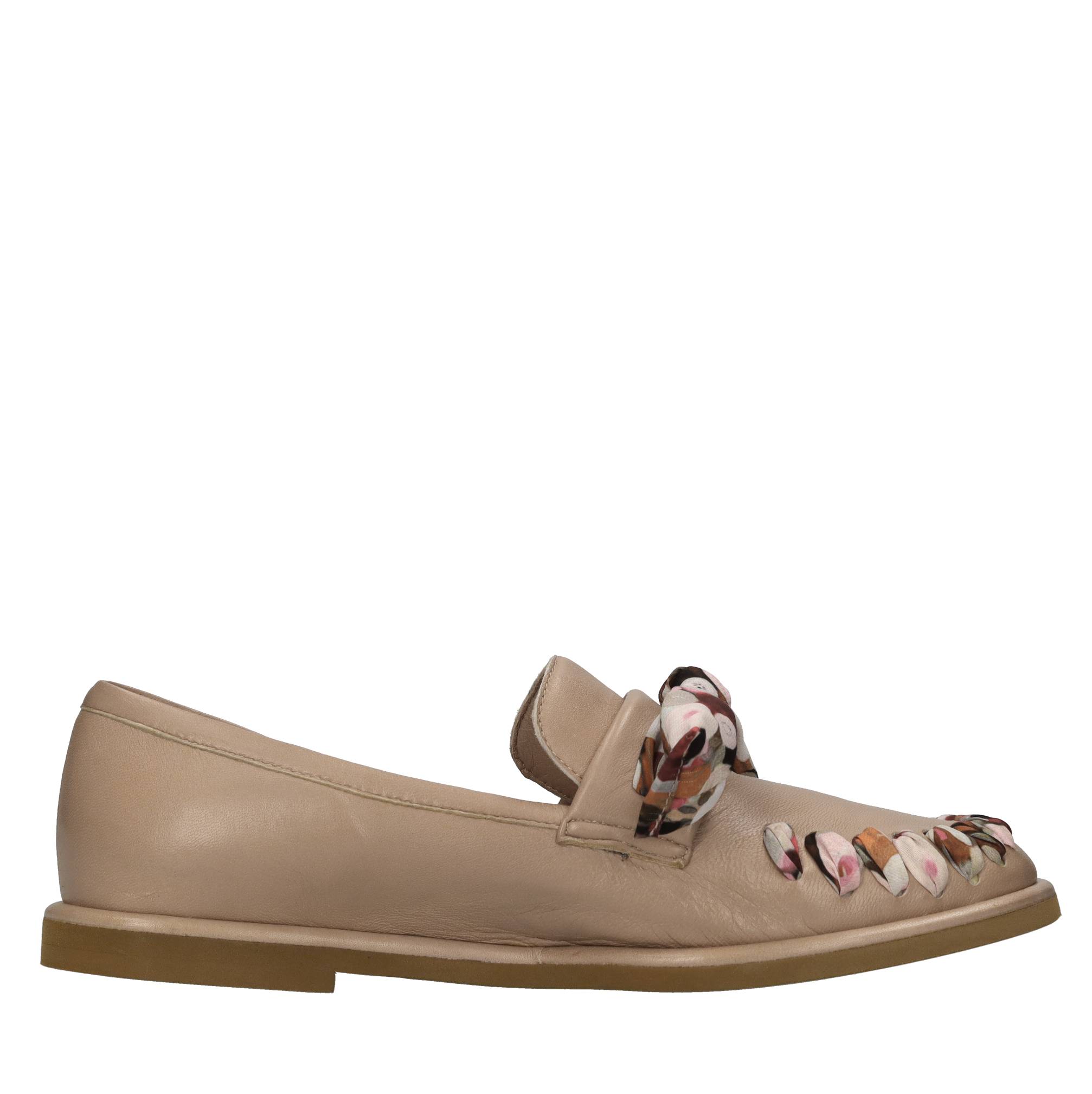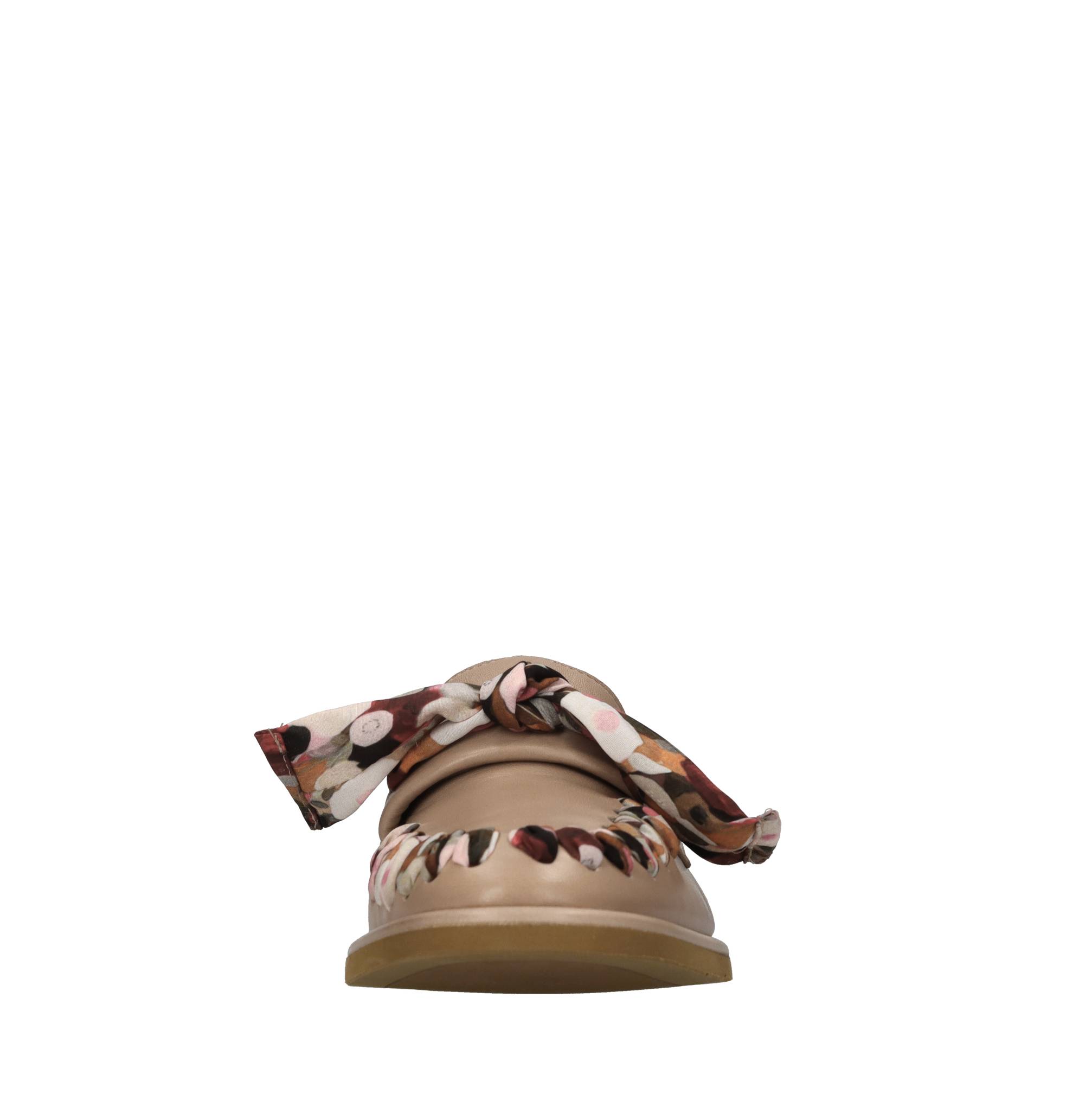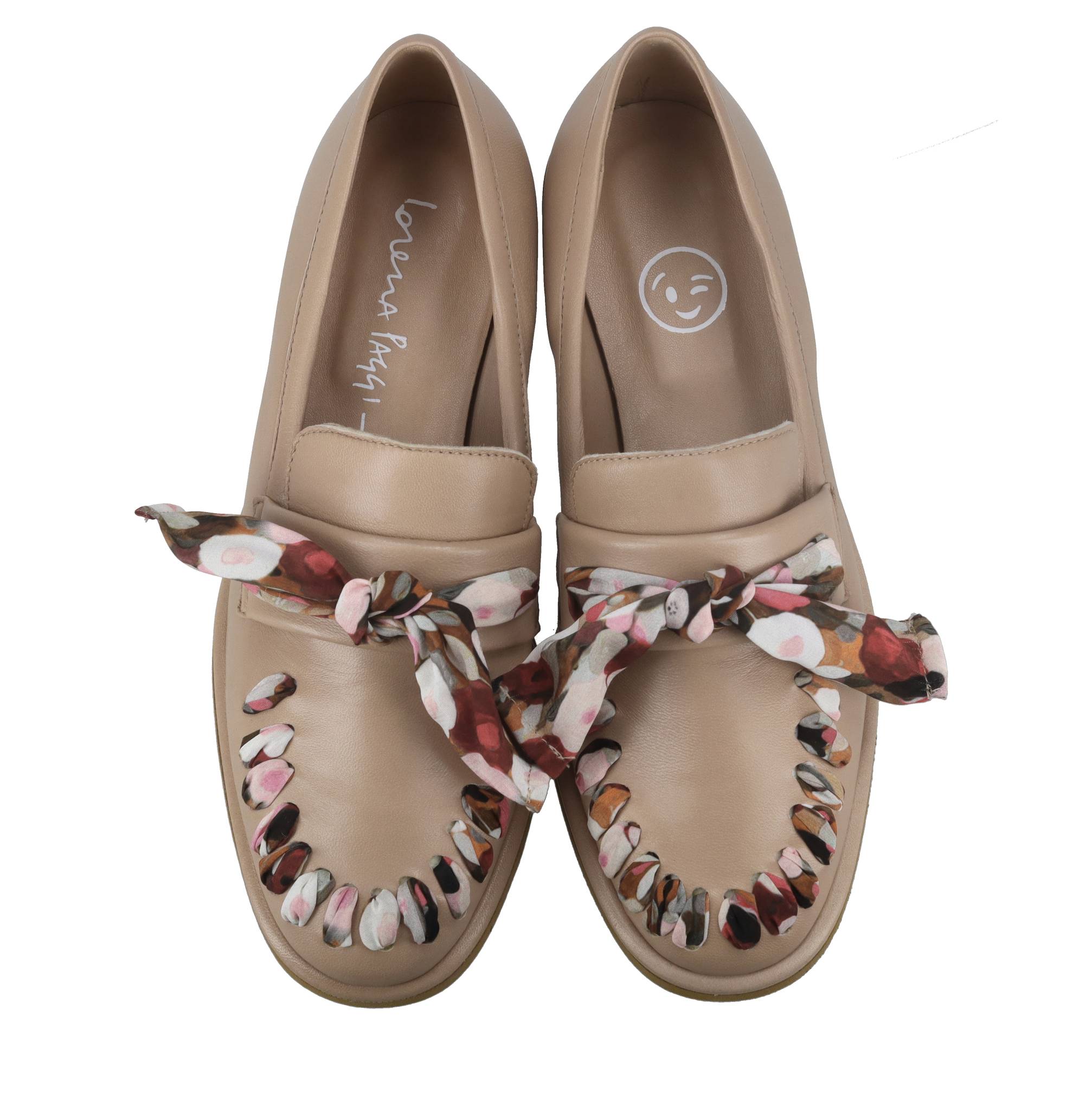 Mocassini in pelle e tessuto. Applicazioni in tessuto a fiori. Tomaia interna in pelle. Suola esterna in gomma.