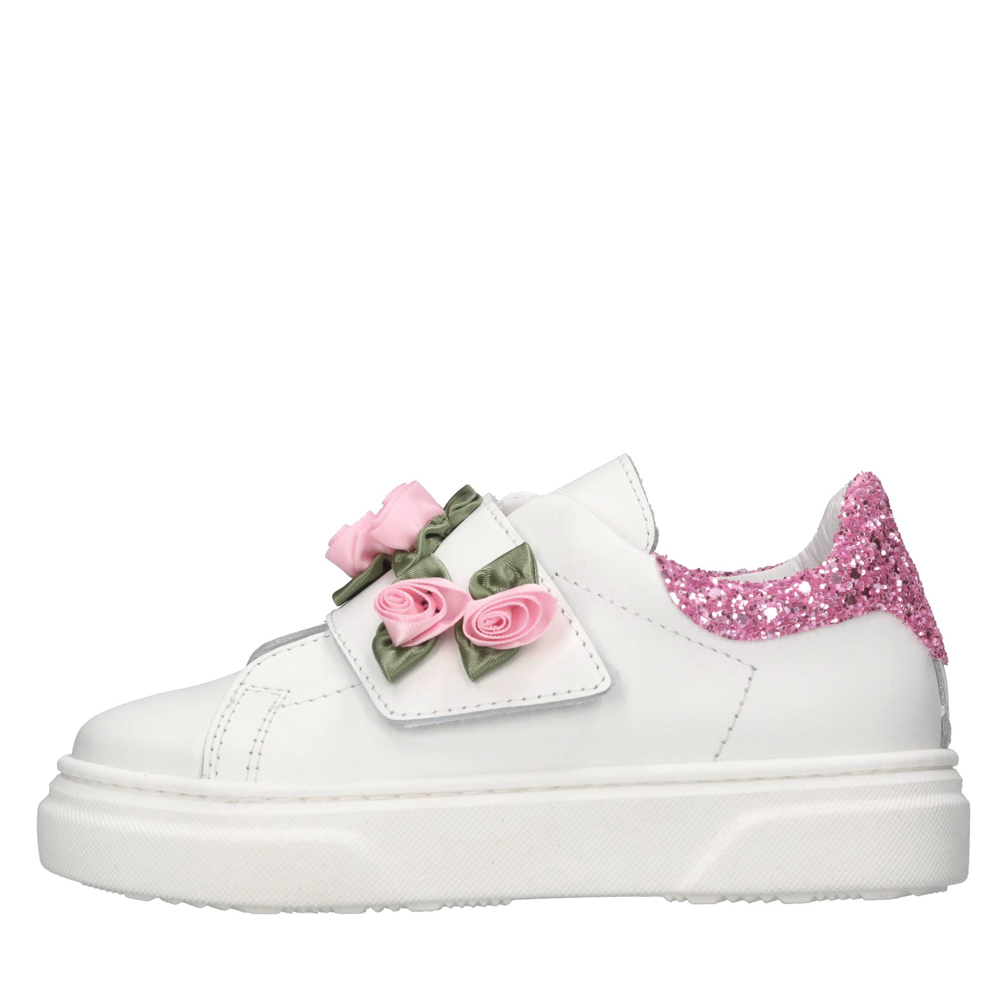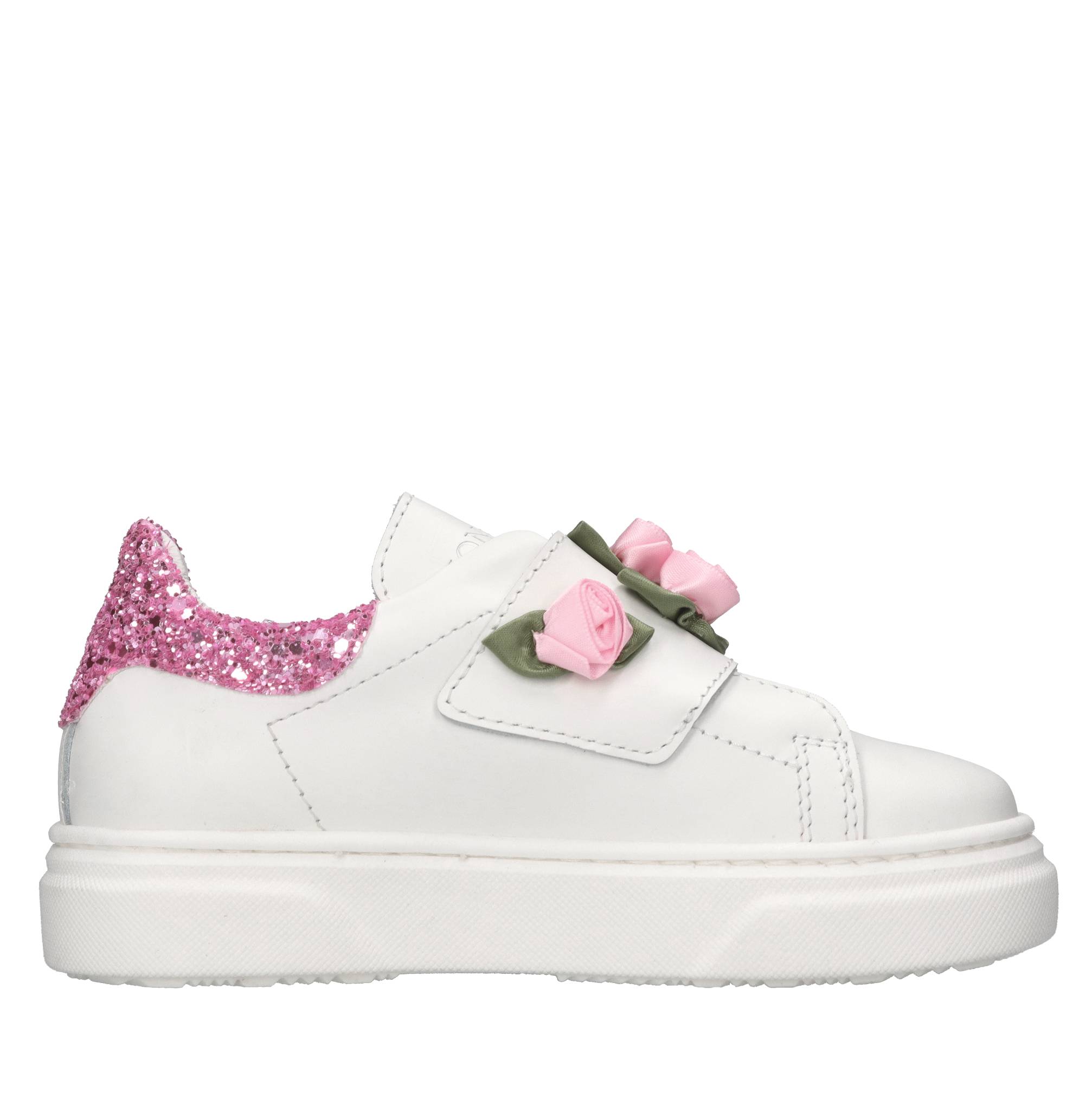 Sneakers in pelle. Glitter rosa. applicazioni rose in tessuto. Tomaia interna in pelle. Suola esterna in gomma.