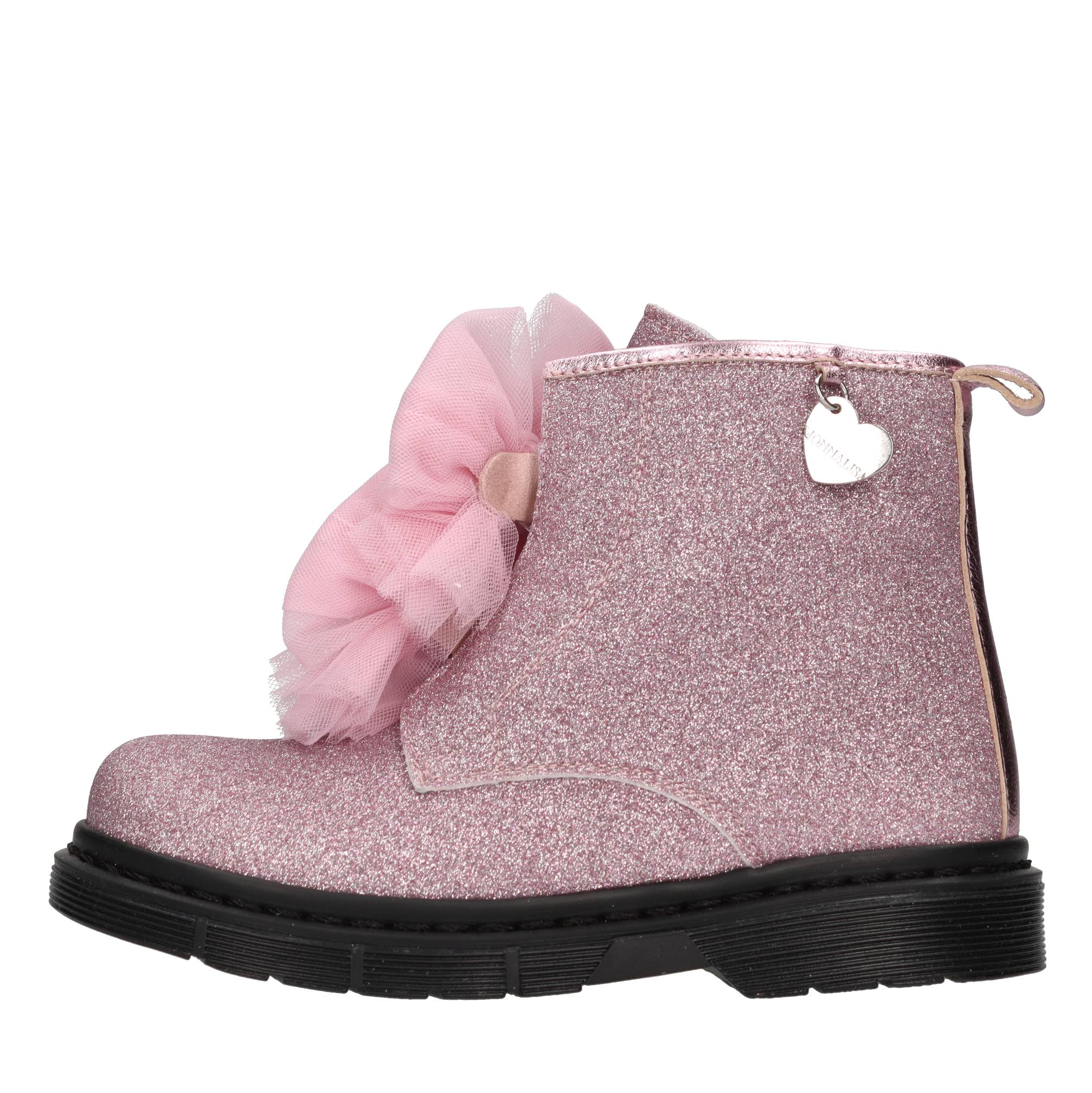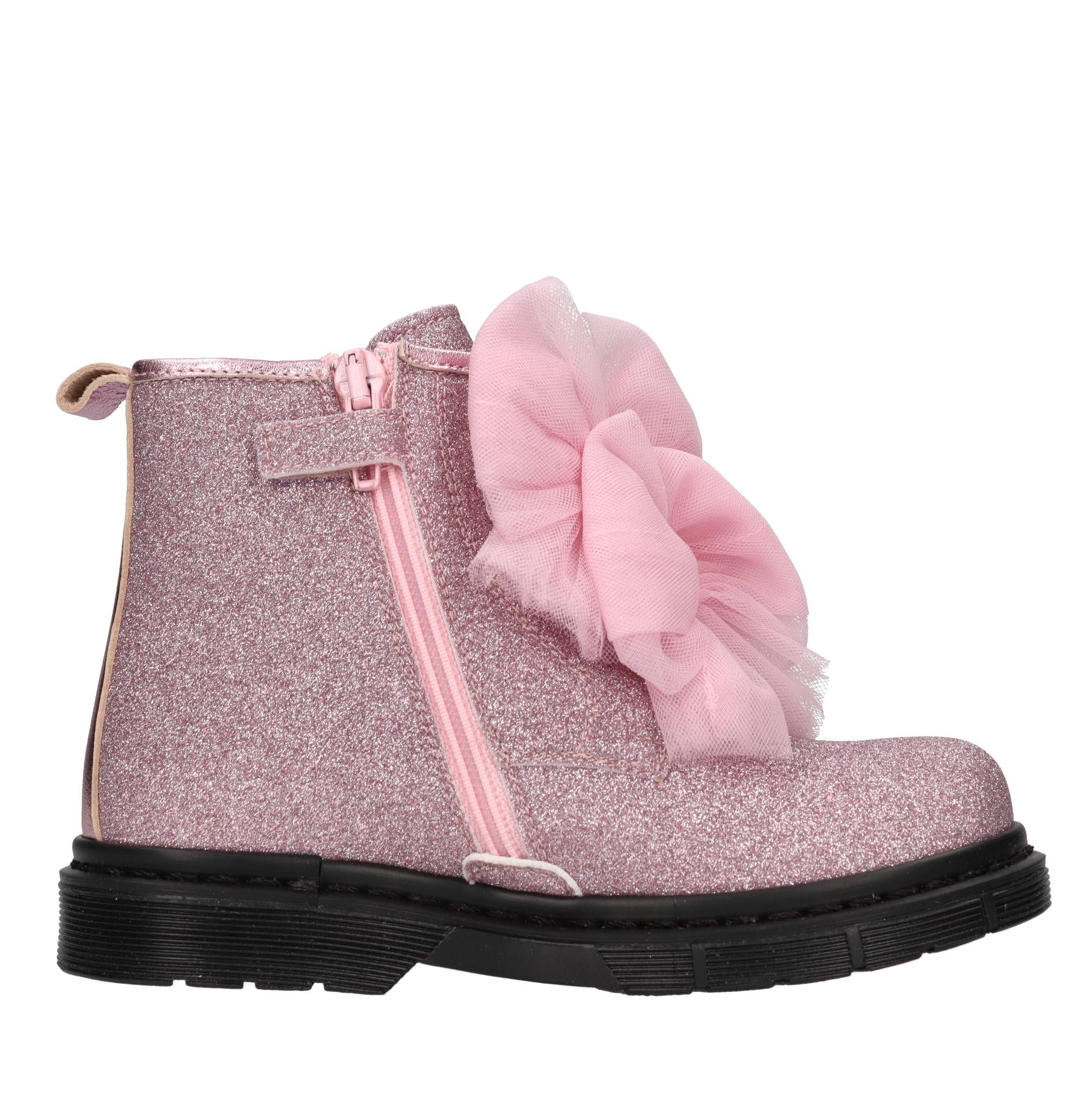 Stivaletti in ecopelle e glitter. Fiocchi decorativi in tulle. Tomaia interna in pelle. Suola esterna in gomma.