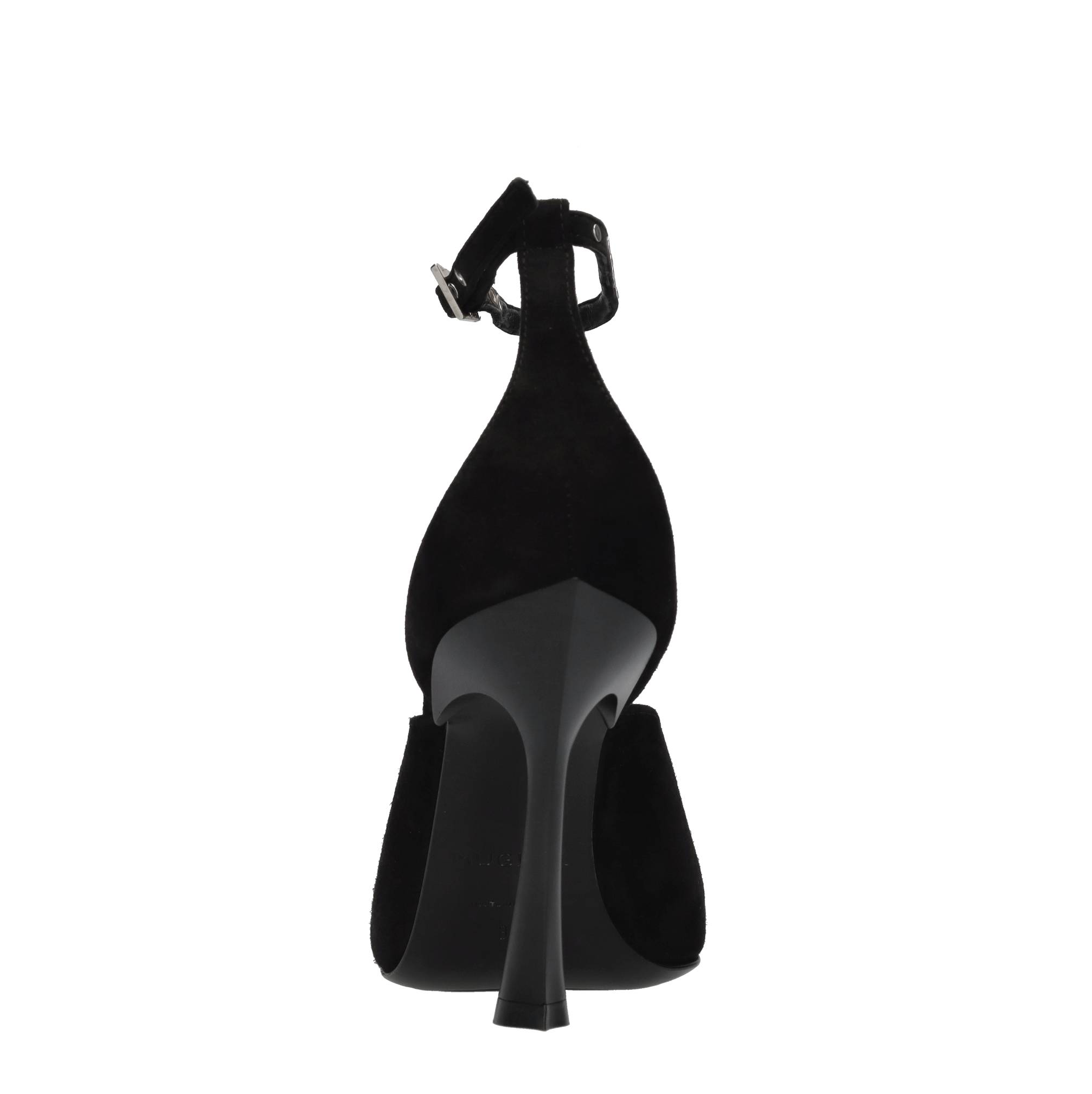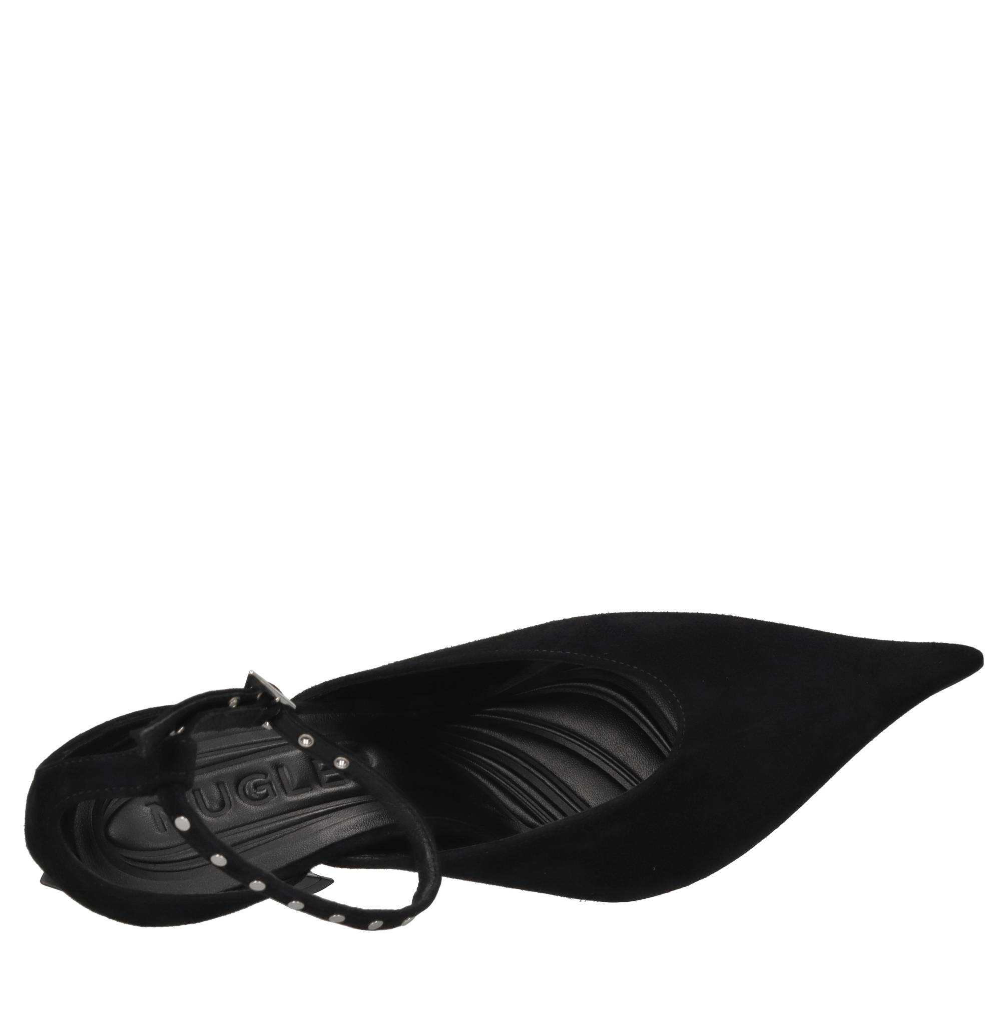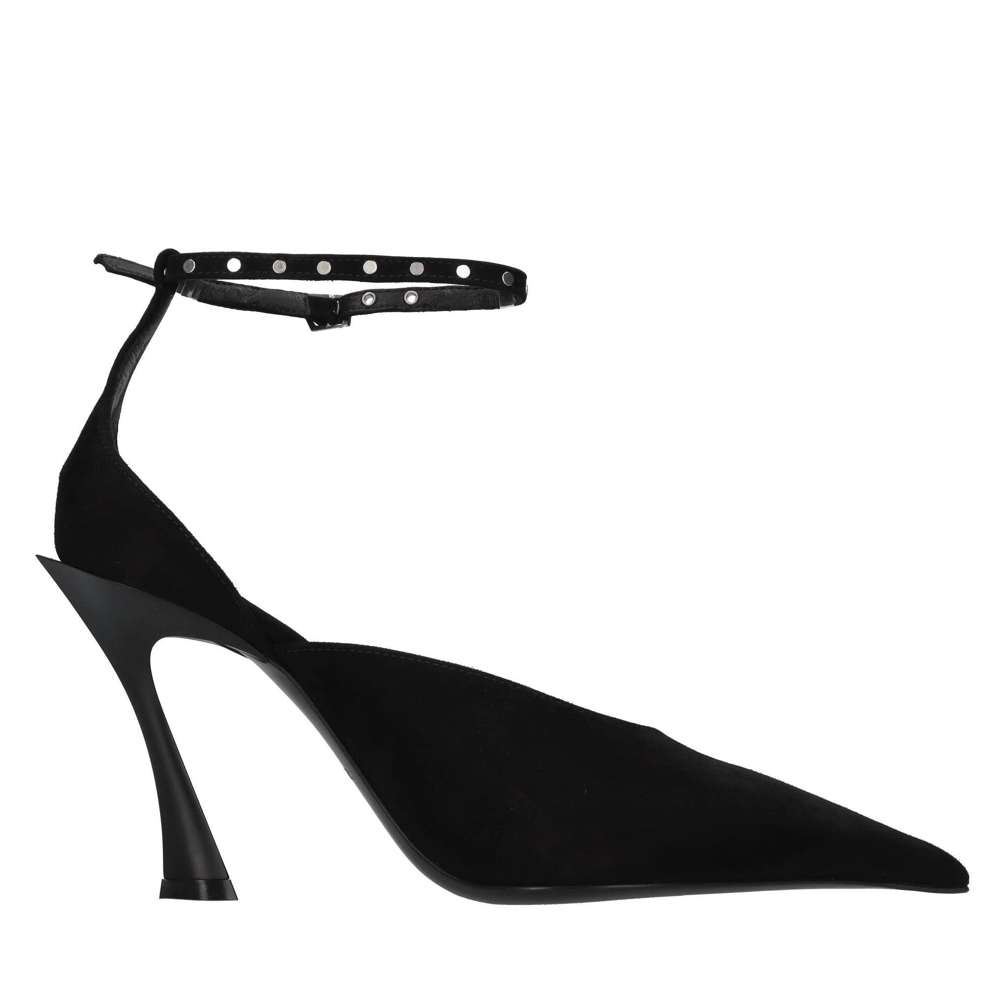Décolleté in camoscio,cinturino con borchie color argento. Tomaia interna in pelle. Suola esterna in cuoio e gomma.