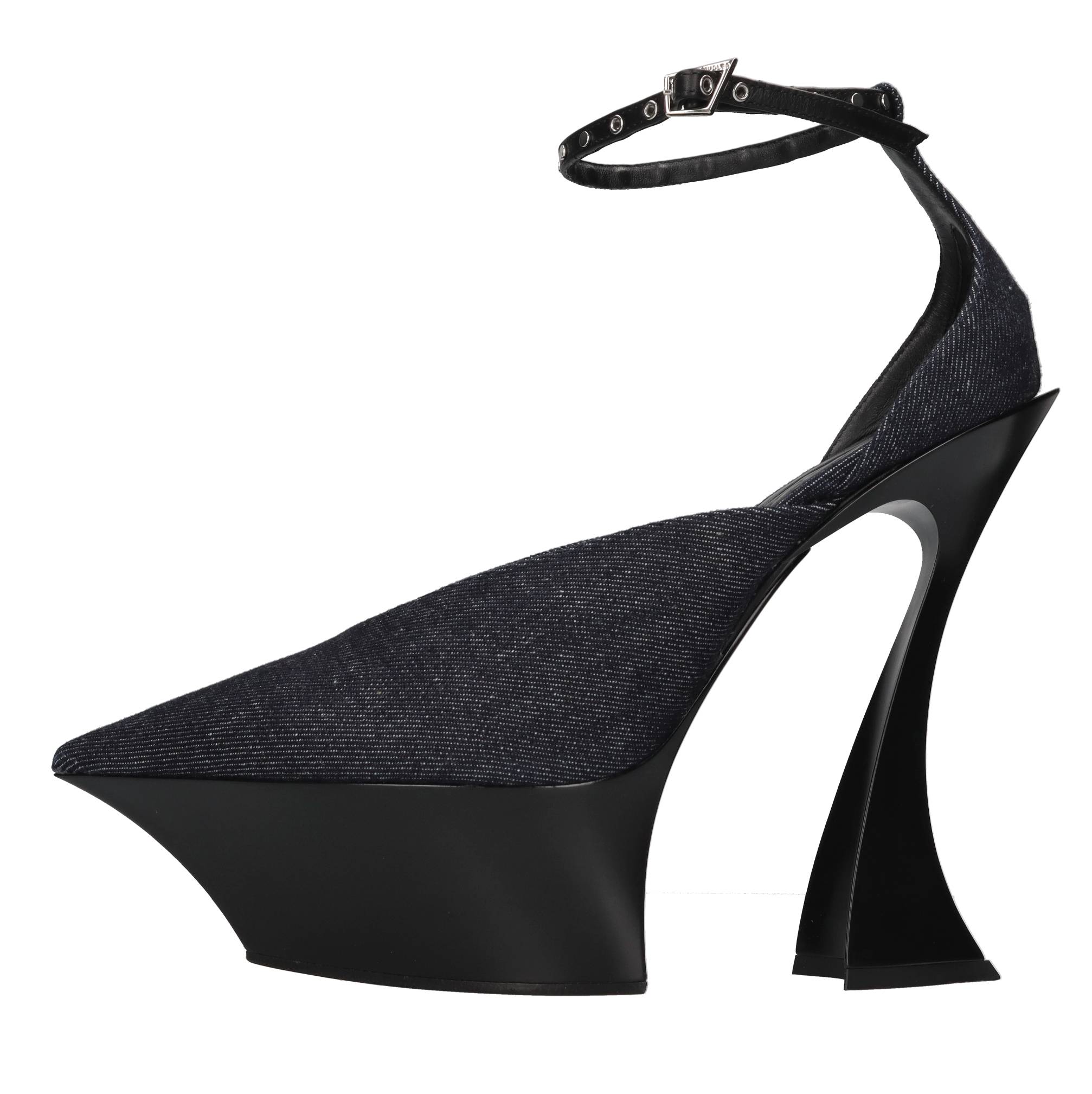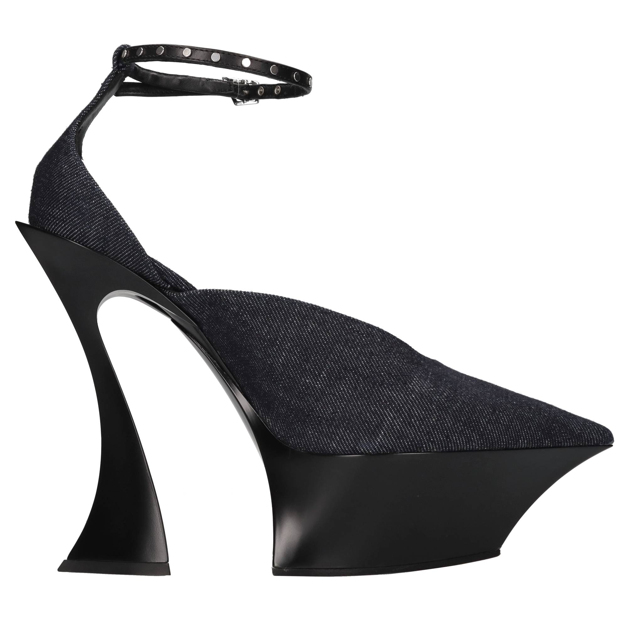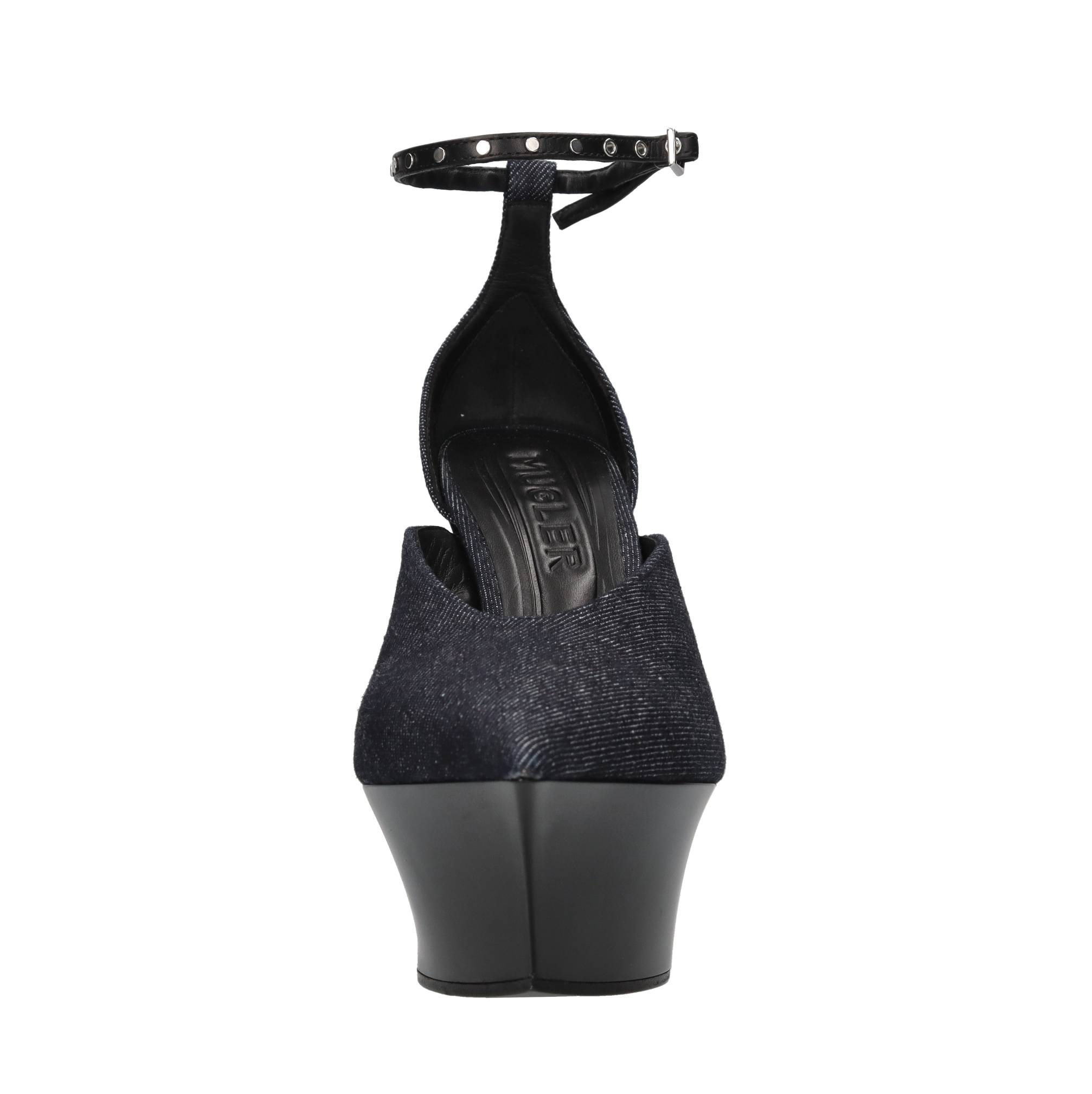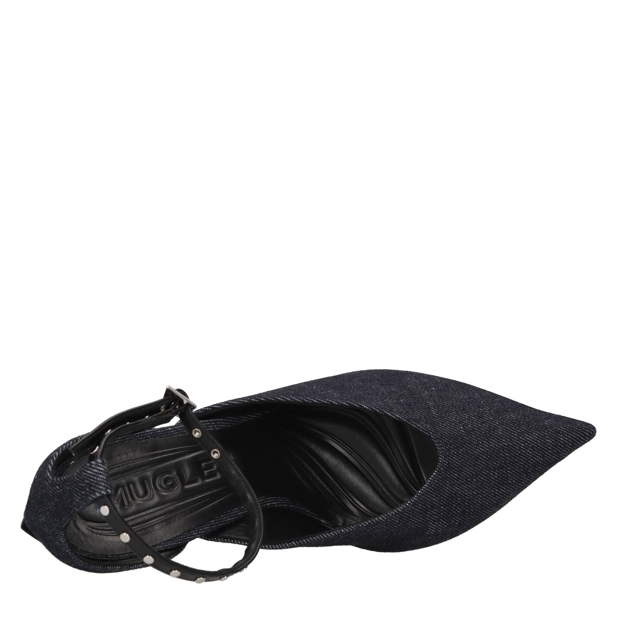 Décolleté in tessuto. Jeans. Tomaia interna in pelle. Suola esterna in gomma e cuoio. Cinturino con fibbia e borchie. Campionario. Plateau: 5,5 cm. Spedito su scatola neutra.